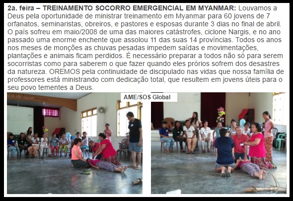 pastor pregador. ENCORAJAMENTO AOS OBREIROS: Louvamos a Deus pelos obreiros que sacrificialmente pegaram os órfãos para cuidar nas suas próprias casas. Alguns tiveram que construir casas de bambu em aldeias isoladas para acomodar a todos. Entregamos roupas adultos para todos os casais de obreiros, num pique-nique num parque para os casais, proporcionando um momento de descanso, de oração e encorajamento. As obreiras "mães" das crianças órfãs estavam tristes de não conseguir comprar roupas novas para as crianças no final de ano, e chegamos com roupas. Várias delas disseram que nunca vão esquecer que pelo resto das suas vidas irão orar intercedendo pelos irmãos brasileiros. OREM para que sejam renovados e encorajados a continuarem firmes e com muito amor e sabedoria no cuidado das crianças, que é uma luta por sobrevivência diariamente. RETIRO COM OBREIROS LOCAIS – por tres dias faremos retiro de encorajamento aos nossos obreiros locais do Projeto Ouro. Foi um ano muito difícil com o falecimento do líder deles, o Robert, e a perda de alguns obreiros que sairam do campo. Dias natalinos seriam especialmente difíceis num local onde não podem orar nem ler a Palavra abertamente. Decidimos aproveitar a nossa viagem tirando-os para um local de descanso para comunhão e renovação. OREM para que Deus fale a todos de forma especial e pessoal, conforme a necessidade de cada um. SOCORRO