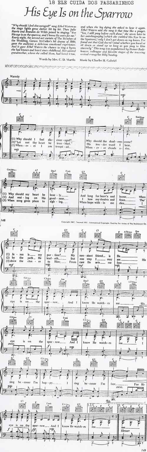 cuida dos passarinhos “His eye is on the sparrow” Por que é que estou tão triste? O que me faz chorar? Meu coração esmagado, Minh’alma a soluçar! Jesus está ao meu lado Seu terno amor não tem