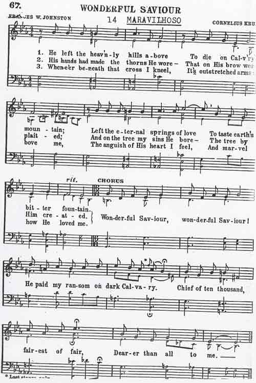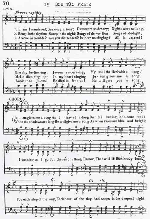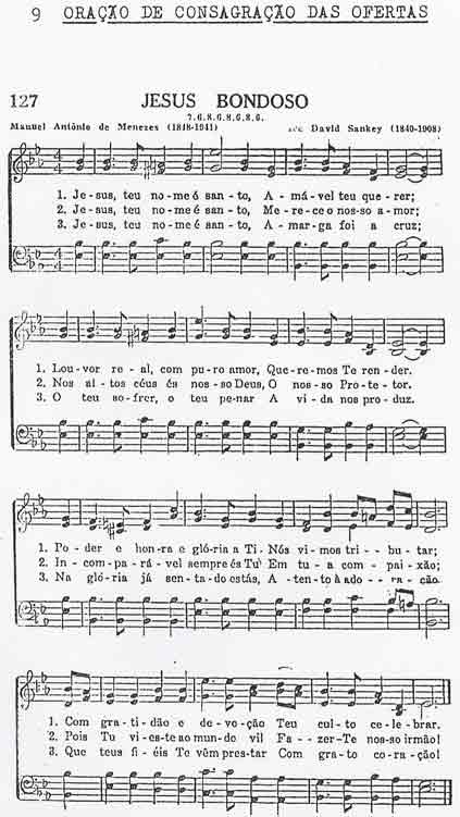 passarinhos E cuidará de mim! 19- Sou tão feliz Estava perdido, longe de Deus Dias escuros, noites de breu! Um dia Cristo bateu-me à porta E vida eterna me deu! Hoje sou tão feliz, tão feliz Tão feliz com Jesus, meu Salvador! Ele entrou no meu ser Transformou meu viver E me guia com amor! Hoje sou tão feliz, tão feliz Tão feliz com Jesus, meu Salvador! Não há sombras nem dor Pois Cristo me diz: “Morri para seres feliz!” 20- Oh dia alegre Oh dia alegre sim dia feliz Não posso nunca olvidar Em densas trevas vagueando eu ouvi A voz de Cristo a chamar. Que grande Amigo eu então encontrei Meu Salvador e eu Rei Encheu minh’alma de gozo e de luz Admirável, sublime Jesus! O céu desceu, entrou e ficou em mim (bis) Foi Jesus que em mim entrou, Minha vida iluminou! O céu desceu, entrou e ficou em mim! (bis) 21- Deus provou o Seu amor por mim Deus provou o Seu amor por