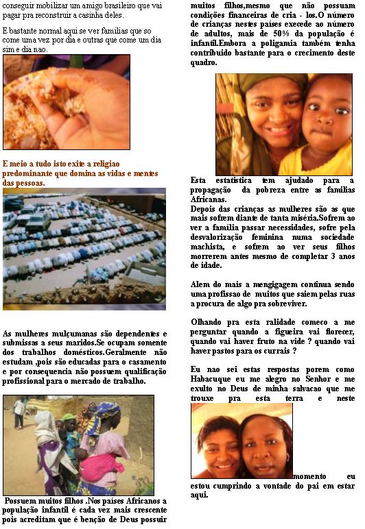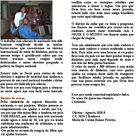 da ocrescimento... Deus Dara a recompensa de acordo com o trabalho que cada um tiver feito, porque nos somos companheiros de trabalho no serviço de Deus. 1Cor 3 7-9 Que a paz seja convosco eleitos em Cristo para grande comissão de fazê-lo conhecido na terra. Veja só as portas abertas para a palavra EVAGELIZACAO ATRAVEZ DO RADIO ADOCAO DE NATIVOS ATRAVEZ DA MISSAO VEM BRASIL EDIFICACAO DA IGREJA ATRAVEZ DO LOUVOR Radio Recebe uma proposta de fazer uma emissão em francês com minha própria voz, em radio FM local do pais. O nome do programa será: Du BRESIL AU NIGER. Ira ao ar a cada sábado a partir do dia 20 de maio de 11 as 12 da manha, horário de pico aqui. Neste programa estarei levando ao publico a conscientização social de doenças e como evitá-las, a importância da educação das crianças como prioridade a escola, dicas de nutrição alimentar no contexto africano. E através disto poderei passar musicas cristas em português que fala de Jesus e depois poderei explicar lãs Ore para que Deus me de muita graça e sabedoria nesta tarefa, pois tudo isto será feito em uma língua que não e a minha língua materna. Preciso de ajuda 1 Se você tem conhecido na área de saúde e tem dicas praticas de como evitar doenças me escreva. Se você e área do esporte e sabe o que esta acontecendo agora com o futebol brasileiro e outros esportes também será muito útil. Estou precisando de cds com musicas brasileiras. Você poderá ser um participante destas emissões mandando um CD De musica gospel? Emissões na língua nativa indo ao ar Louve a Deus porque conseguimos meia hora pra colocar no ar em radio na cidade de TERA as emissões em fulanes que temos gravadas, lá, existe uma boa concentração de fulanes, e que e melhor será gratuito. Também estou para fechar um contrato num outro vilarejo duas horas de Niamey lá teremos que pagar cerca de 150 dólares por mês, mas Deus já levantou alguém que estará patrocinando isto. Gloria a Deus Estou precisando de cds virgens para que eu faca copias das gravações que temos, pois preciso salvar as originais. Pois como não tem data nas emissões elas ainda Poderão ser utilizadas depois e sempre. Precisamos de 300 cds virgens no momento Representante da Missão VEM Brasil Os três obreiros adotados pela missão VEM Brasil na eu estou representando tem sido tremendamente abençoados a cada mês, e isto tem facilitado sua vidas. Oremos para que mais obreiros sejam alcançados com a mesma bênção. Estarei viajando este final de semana pra fazer uma filmagem de um deles, ore por mim nesta viagem. Edificação da igreja no Louvor Este mês de maio começaremos um trabalho de ensino na musica através da adoração e louvor. O objetivo e levantar talentos que possa ajudar a igreja crescer na área, e formar conjuntos que cantam e tocam no futuro, afinal o louvor tem poder de quebrar as cadeias. Louve a Deus pela câmera filmadora digital nova que recebe dos USA, Valeu amigo! Que Deus te recompense. Necessidade pessoal Estou precisando de um transporte, pois para locomoção em transportes públicos tem sido um desafio, por isto ore para que Deus providencie um transporte, a principio tenho pesado numa vespa local que me valera bastante, ou mesmo um carro. Mas me ajude a orar para que Deus providencie uma coisa boa que não vai me dar trabalho. Estejam orando para que DEUS coloque me minhas mãos o transporte escolhido por ele, vocês me entenderam ne? Quero agradecer a todos os amados que tem sido fies em suas ofertas mensais, e com muita saudade e gratidão no coração que vos represento nesta terra, por isto todas as vitórias compartilhadas você faz parte delas. Que Deus abençoe a cada um. OBRIGADO AOS INCERSSORES QUE TEM ORADO UM MINUTO POR DIA. Continue orando pela minha vida e pelo sucesso da obra no Sahel Africano Para enviar oferta especifica para ajuda da compra do transporte Agencia 1020-0 C/C 3624-2 Bradesco Em nome de MARIA DO Carmo Ramos Pereira Para enviar CD de musicas para o Programa de radio, ou cds virgens. BP 11925 Niamey Republique du Niger 14/04/06 ESTOROU A GUERRA NO CHADE, ORE, PELOS NOSSOS AMIGOS Ele faz cesar a guerra ate o fim da terra, quebra o arco, e despedaça a lança e queima os carros no fogo. Esta noite passada,tive um sonho que foi literalmente um aviso de Deus. No sonho eu estava andando nas ruas do Chade onde muitas pessoas estavam caminhando indo pra algum lugar de refugio, de repente chegava perto de mim um homem chadiano que era cristão e me disse o seguinte: Você conhece o ....( não citarei nome por questão de segurança), aquele homem ali na frente. Eu responde que sim, então ele me disse: Por favor ore por ele pois ele esta correndo grande risco de vida. Enquanto tomava o café da manha eu compartilhava o sonho com uma irmã, e a gente planeja um tempo para orar pelo o irmão... (não citarei o nome por causa de segurança). Logo em seguida meu celular tocou, era uma de minhas amigas que me dizia, para orar que a guerra no chade tinha começado. Este irmão.... é um missionário africano vindo um pais vizinho do Chade, ele tem, feito um grande trabalho por ali, mas é verdade que agora ele deve esta precisando muito de nossas orações, pois com certeza neste conflito ele será um alvo, uma vez que veio de um país que tem contribuído para o conflito no Chade. Nós não temos muitas informações sobre a guerra que já esta em N’Djamena, mas estamos bastante preocupados com as nossas amigas brasileiras que estão lá. Neidinha Nelbe e Ladejane, como você sabem no Chade não temos embaixada brasileira, e esperamos que a embaixada da franca ou dos USA possam retirá-las do país o mais rápido possível, isto teria que ter sido hoje (quinta feira), mas não temos noticias nem uma. Por favor, ore pela proteção delas. Como você sabem Deus me deixou viver três meses naquela nação, onde fiz amizades e construir laços sinceros, e por isto peço oração pelos muitos missionári