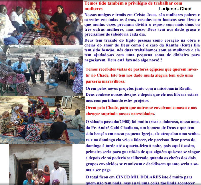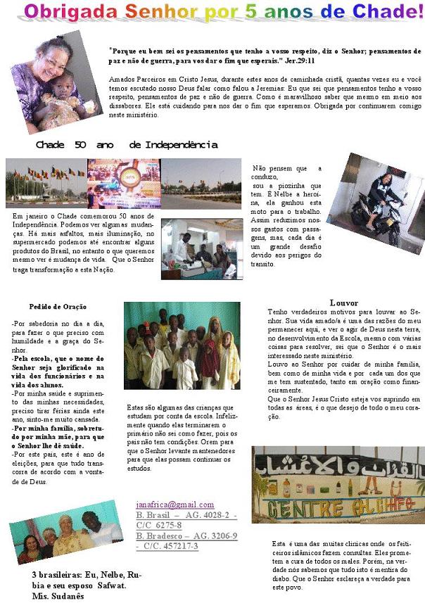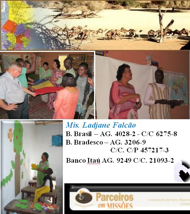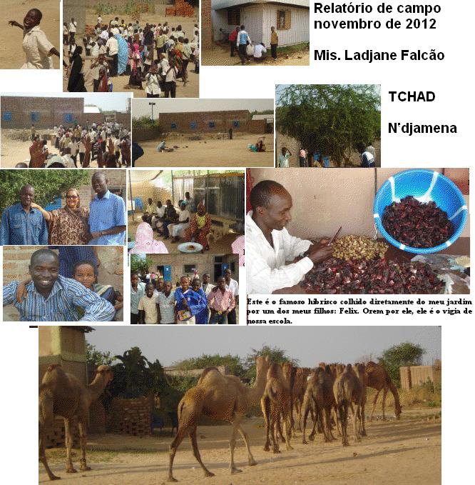 os seus pecados, e sararei a sua terra. 2Cr.7:14"Amados irmãos mais uma vez estou escrevendo para falar um pouco do Chade. Hoje eles estão comemorando 50 anos de Independência do País. O presidente diz que quer a Paz e a Reconciliação. o Chade tem tido um "bom" desenvolvimento desde que chegamos em 2006, antes não havia quase ruas asfaltadas, havia muito lixo acumulado em várias ruas. Hoje temos caminhões de lixo e até garis para trabalhar na limpeza. Estão construindo vários monumentos e praças. Realmente estamos vendo prosperidade em relação ao desenvolvimento. Há muitos bairros com iluminação onde antes somente as avenidas principais havia energia. é certo que ainda passamos muitos dias sem, principalmente durante o verão, no entanto eles estão trabalhando para isto. Creio que se orarmos e clamarmos ao Senhor por sua misericordia e despertamento da Igreja no Chade. Ele com certeza ouvira nossas orações. O povo chadiano sobretudo os do Sul ja sofreram muito com o Norte, muitas pessoas perderam entes queridos de modos brutais, há várias etnias que ainda hoje são consideradas escravos. e isso tudo deixa cicatrizes profundas mesmo na Igreja do Senhor. A Igreja precisa de cura interior e liberação de perdão para este País. Eles precisam que o Senhor lhes dê amor pelas etnias muçulmanas. Orem conosco para que como missionários aqui enviados pelo Senhor dono da terra e céus e Príncipe da Paz, nos capacite cada dia a viver e representá-lo nesta Nação para Ele seja o desejado desse povo. Obrigada mais uma vez, pois, sei que posso contar com vossas orações. No amor daquele que é Tudo em Todos. Jesus Cristo Senhor Nosso. Com Carinho Mis. Ladjane