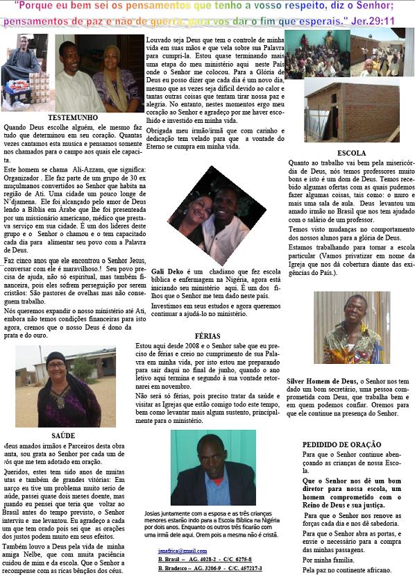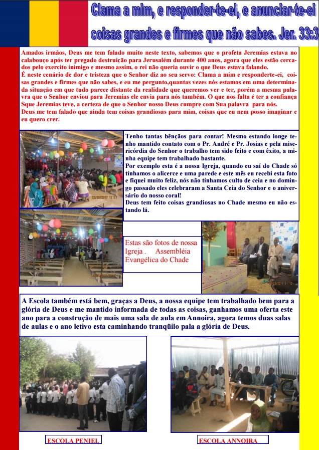 DE ORAÇÃO Para que o Senhor continue aben- çoando as crianças de nossa Esco- la. Que o Senhor nos dê um bom diretor para nossa escola, um homem comprometido com o Reino de Deus e sua justiça. Para que o Senhor nos renove as forças cada dia e nos dê sabedoria. Para que o Senhor abra as portas, e envie o necessário para a compra das minhas passagens. Por minha família. Pela paz no continente africano. vós com alegria pela vossa cooperação a favor do evangelho desde o primeiro dia até agora". Filipenses 1:4-5 Amados irmãos e Parceiros desta obra Santa, quero lhes desejar um final de semana abençoado e lhes dizer o quanto sou grata ao Senhor por vossas vidas, orações e sustento financeiro. Como o texto acima diz tenho vocês sempre em minhas orações, pois sei que sem vocês e sem vossa determinação e cooperar com o evangelho do nosso Senhor Jesus Cristo seria quase impossível permanecer aqui ou em qualquer outro lugar. Louvo ao Senhor por estar bem de saúde mais uma vez e sei que isto é resposta de oração. Embora ainda esteja muito quente tenho me sentido muito bem graças a Deus. Amado eu tenho a minha alma em jubilo cada vez que escuto um chadiano/a me chamar de mãe, pois lembro da promessa do Senhor quando me chamou para o campo missionário. (Eu era ainda muito jovem e queria me casar e ter mais filhos (tenho uma filha), mas aceitei o chamado e queria tanto ser missionária que disse ao Senhor: Faça de mim uma missionária Senhor mesmo que eu nunca me case. Um dia o Senhor me falou que mais são os filhos da solitária do que da casada, e literalmente isto tem se cumprido em minha vida. E maravilhoso, pois mesmo o taxista me chama de mãe. O cumprimento da Palavra de Deus me revela que eu devo continuar confiando em suas promessas para minha vida e mesmo que aos meus olhos seja dificil ver a conversão das crianças que estudam em nossa escola, eu sei que estou fazendo a minha parte e que o converter é obra do Santo Espirito de Deus. e mesmo que eu não veja nada nesta terra com certeza produzirão frutos para a eternidade. Eu creio nisto porque o Deus que me prometeu vela sobre sua palavra para cumpri-la. Por tudo isto amados eu quero mais uma vez lhes agradecer por continuarem comigo nesta jornada rumo as mansões celestiais. Com Carinho Ladjane - - - Louvado seja Deus que tem o controle de minha vida em suas mãos e que vela sobre sua Palavra para cumpri-la. Estou quase terminando mais uma etapa do meu ministério aqui neste País onde o Senhor me colocou. Para a Glória de Deus eu posso dizer que cada dia é um novo dia, mesmo que as vezes seja difícil devido ao calor e tantas outras coisas que tentam tirar nossa paz e alegria. No entanto, nestes momentos ergo meu coração ao Senhor e agradeço por me haver esco- TESTEMUNHO lhido e investido em minha vida. Quando Deus escolhe alguém, ele mesmo faz Obrigada meu irmão/irmã que com carinho e tudo que determinou em seu coração. Quantas dedicação tem velado para que a vontade do vezes cantamos esta musica e pensamos somente Eterno se cumpra em minha vida. nos chamados para o campo aos quais ele capaci- ta. Este homem se chama Ali-Azzam, que significa: Organizador . Ele faz parte de um grupo de 30 ex muçulmanos convertidos ao Senhor que habita na região de Ati. Uma cidade um pouco longe de N’djamena. Ele foi alcançado pelo amor de Deus lendo a Bíblia em Árabe que lhe foi presenteada por um missionário americano, médico que presta- va serviço em sua cidade. É um dos lideres deste grupo e o Senhor o chamou e o tem capacitado cada dia para alimentar seu povo com a Palavra de Deus. Faz cinco anos que ele encontrou o Senhor Jesus, conversar com ele é maravilhoso.! Seu povo pre- Gali Deko é um chadiano que fez escola cisa de ajuda, não só espiritual, mas também fi- bíblica e enfermagem na Nigéria, agora está nanceira, pois eles sofrem perseguição por serem iniciando seu ministério aqui. É um dos fi- cristãos: São pastores de ovelhas mas não conse- lhos que o Senhor me tem dado neste país. guem trabalho. Investimos em seus estudos e agora queremos Nós queremos expandir o nosso ministério até Ati, continuar a ajudá-lo no ministério. embora não temos condições financeiras para isto agora, cremos que o nosso Deus é dono da prata e do ouro. FÉRIAS Estou aqui desde 2008 e o Senhor sabe que eu pre- ciso de férias e creio no cumprimento de sua Pala- vra em minha vida, por isto estou me preparando para sair daqui no final de junho, quando o ano letivo aqui termina e segundo à sua vontade retor- narei em novembro. Não será só férias, pois preciso tratar da saúde e visitar as Igrejas que estão comigo todo este tempo, bem como levantar mais algum sustento, principal- mente para o ministério. SAÚDE Meus amados irmãos e Parceiros desta obra santa, sou grata ao Senhor por cada um de vós que me tem adotado em oração. Queridos, estes tem sido anos de muitas lutas e também de grandes vitórias: Em março eu tive um problema muito serio de saúde, passei quase dois meses doente, mas quando eu pensei que teria que voltar ao Brasil antes do tempo previsto, o Senhor interviu e me levantou. Eu agradeço a cada um que tem orado pois sei que as orações dos justos podem muito em seus efeitos. Também louvo a Deus pela vida de minha amiga Nelbe, que com muita paciência cuidou de mim e da escola. Que o Senhor a recompense com as ricas bênçãos dos céus. ESCOLA Quanto ao trabalho vai bem pela misericór- dia de Deus, nós temos professores muito bons e isto é um dom de Deus. Temos rece- bido algumas ofertas com as quais pudemos fazer algumas coisas, tais como: o muro e mais uma sala de aula. Deus levantou um amado irmão no Brasil que nos tem ajudado com o salário de um professor. Temos visto mudanças no comportamento dos nossos alunos para a glória de Deus. Estamos trabalhando para tornar a escola particular (Vamos privatizar em nome da Igreja que nos dá cobertura diante d