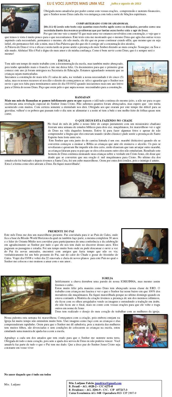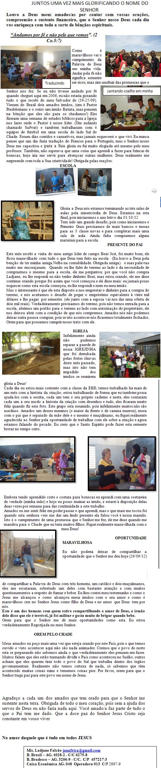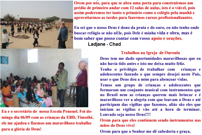 onde quer que andares. Josué.1:9). Que palavra maravilhosa, que promessa graciosa! Quero caminhar neste novo ano confiando e aceitando como se o Senhor estivesse falando a mim que no decorrer deste ano eu tenho Ele para me guiar em todas as circunstâncias, que eu não preciso preocupar-me com o futuro ou com as dificuldades que surgirão, pois Ele esta comigo em todo o tempo, e em cada etapa deste caminho desconhecido sua mão estará me sustentando e me conduzindo em triunfo. Este é tambem o desejo do meu coração para cada um dos amados que me tem sustentado, espiritual, emocional e financeiramente para que o projeto de Deus para este País seja realidade!!!!!!! Ainda estamos em recesso escolar, aqui as férias são em junho, mas em dezembro temos uma semana de recesso, este ano tivemos um pouco mais devido as comemorações dos 50 anos de " Independência" do Chade, que será comemorado dia 11/01/2011, então as aulas começarão no proximo dia 13 deste mês se Deus quiser. Temos tido grandes vitórias no decorrer destes cinco anos em que o Senhor me tem dado neste País. Jamais em minha vida eu pensei que teria um ministério na área de Educação e muito menos ver uma escola com quase 5oo crianças muçulmanas aprendendo a Palavra de Deus. Realmente Deus é Deus de milagres e de coisas grandes!!!!!. Quando ele quer ninguém pode impedir e nem as dificuldades podem manter-se de pé perante ele. Quando comecei a orar pelo terreno tive vergonha de pedir, pois achava-o grande demais, hoje já parece pequeno, coisas do Pai Eterno. Graças a Deus ganhamos muitas ofertas vindas do Brasil e até mesmo da Suiça para este projeto,que pudemos utilizar para construir algumas classes. Infelizmente não como gostaria mas, como tivemos condições. Porém quando vejo outras escolas que são obrigadas a usarem casas de barro eu fico maravilhada diante do Senhor porque nos tem dado um espaço melhor para as crianças, e eu sei que pouco a pouco ele faz Sua obra crescer diante dos nossos olhos. Agora mesmo temos uma oferta que usaremos para aumentar mais 3 salas de aulas, porem não conseguimos ainda um pedreiro para fazer isto, aqui é muito caro a mão de obra e tambem precisamos de alguém que realmente faça como queremos e que fique bem feito na medida do possivel . Agradeço de todo o meu coração a cada um que tem estado comigo e espero em nome de Jesus continuar contado com vocês para a continuação deste trabalho. Eu quero este ano sair de férias, ainda não sei o mes, mas estou pensando em novembro, desde já peço que estejam orando para que o Senhor nos ajude a colocar a escola em ordem de forma que tenhamos condições de sair sem muitas preocupações. Eu sei que a obra é do Senhor e que ele pode nos dar alguém que ame este projeto e que queira vir para nos ajudar na administração. Conto com suas orações neste sentido. No amor do Pai o Senhor de toda a terra. Mis. Ladjane 21/04/2011 Amados irmãos em Cristo Jesus. " Então, enquanto temos oportunidade, façamos o bem a todos, mas principalmente, aos domésticos da fé" (Gt.6:10) Sou realmente grata ao Senhor por cada um de vocês, que ele, o Pai com todo amor colocou em minha vida, eu sei que os que são comprometidos comigo levam as minhas petições diante do trono e elas são respondidas. Eu compartilhei acerca de minha saúde e quero dizer que hoje para a glória de Deus me sinto bem melhor, é certo que o calor aqui está terrível e rouba não só as minhas mas a forças de todos que moram aqui, só se salvam os que são ricos e podem ter grandes geradores que lhes fornecem energia para terem ar condicionados a hora que precisam. Mas eu louvo a Deus porque sei que quando somos fracos aí é que ele nos faz fortes. Amados, mesmo que eu muitas vezes me sinta fraca, sem forças e cansada,as dores devido o problema da artrite me faz sofrer e a saudade dos meus queridos muitas vezes bate forte em meu coração, eu quero estar no centro da vontade de Deus, pois sei que ele me dirige e que nada daquilo que ele tem planejado para mim deixará de se cumprir. Estou orando para sair de férias em junho e eu creio no Deus que me trouxe, e sei que ele o Senhor cumpre com suas promessas para com os seus. Tambem compartilhei com os amados sobre os problemas que tivemos com o nosso sistema de eletricidade. Graças ao Senhor pudemos reparar tudo e não nos custou muito caro, sei que isto é resposta de vossas orações. Mas uma vez peço que estejam orando, pois o inimigo tem investido terrivelmente nestes ultimos dias para desencorajar os missionários, algumas pessoas precisaram sair por motivos de doenças, acidentes ou outras necessidades. Obrigada mais uma vez por vossas orações e contribuições. Que o Senhor dos senhores vos fortifique cada dia. No amor daquele que nos chamou. Ladjane