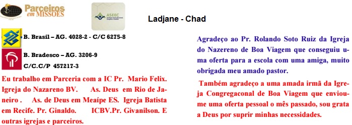 - 03/12/2017 www.facebook.com/photo.php?fbid=421024831253976 www.uniaonet.com/afchadladjane.htm _ Miss Ladjane Faalcão de Lima. BP.3363 N´djamena Tchad _ B. Bradesco AG. 3206-9 - C/C.457217-3 Unidos no amor do Pai em Cristo Jesus "Se