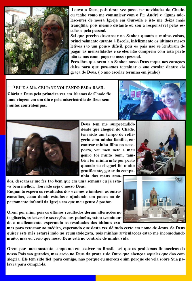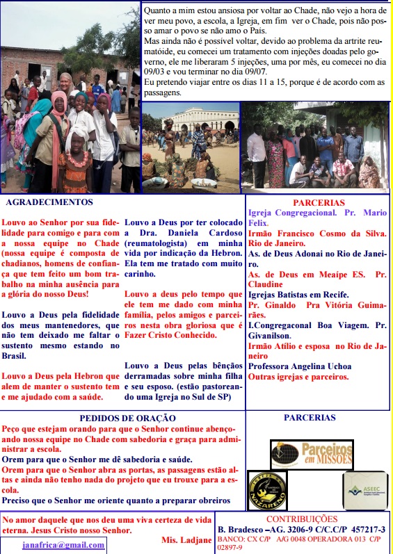 25/05/2016 - já estou no Brasil há mais de um mês e somente agora tive condições de preparar esta carta, infelizmente não estava conseguindo me concentrar muito bem, mas agora estou bem melhor, apesar dos resultados dos exames não terem sido muito bons: estou com triglicérios e colesterol altos e com secreção nos pulmões, estou com medicação e esperando outros resultados para retornar ao médico, este mês tambem preciso ir ao reumatologista, pois tenho sofrido muitas dores nas articulações. Espero que gostem da leitura e do que Deus tem feito no Chade. Com carinho Mis. Ladjane