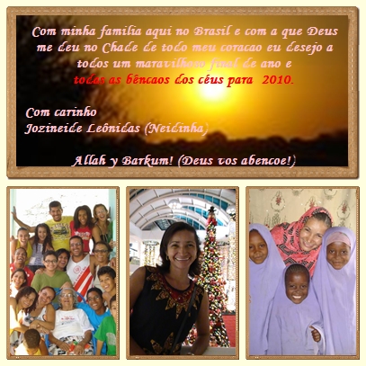 De todo meu coração desejo a vocês um final de ano maravilhoso, que todas as bênçãos dos céus sejam renovados em suas vidas durante os 365 próximos dias do novo anos e que em tudo tenhamos coração gratos ao Pai da vida que em amor enviou seu Único filho e neste mesmo amor nos resgatou para seu reino celestial. No amor e na fidelidade de nosso Salvador e até que todos os povos o conheça Jozineide - Neidinha Depois disto