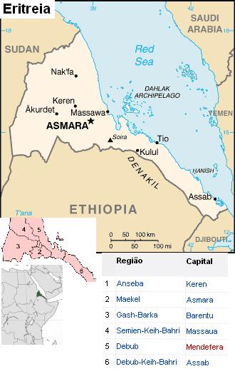 Capital Asmara Língua oficial nenhuma em nível oficial, sendo as mais usadas: árabe, tigrínio e inglês Governo provisório - Presidente Isaias Afewerki Independência da Etiópia - Declarada 24 de maio de 1993 Área - Total 121.320 km² km² (98.º) Fronteira Sudão, Etiópia e Jibuti População - Estimativa de 2009 5 073 000[1] hab. (37.º) - Censo 2008 5 291 370 hab. - Densidade 37 hab./km² (118.º) Região Capital 1 Anseba Keren 2 Maekel Asmara 3 Gash-Barka Barentu 4 Semien-Keih-Bahri Massaua 5 Debub Mendefera 6 Debub-Keih-Bahri Assab