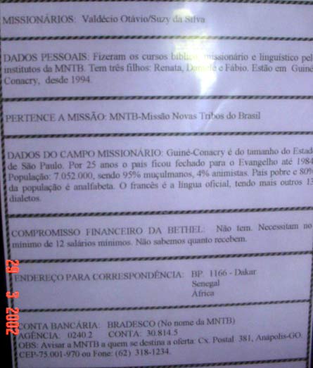 (em francês), que não é o site do governo do país. ConakrySegunda, 08 Agradeça a Deus pelas melhorias nos país desde 1984: a) Pela liberalização política e econômica: apesar disso, ore por estabilidade e por líderes políticos que coloquem os interesses da nação acima dos próprios interesses; b) Pela liberdade religiosa: A reação contra os anos de terror marxista-muçulmanos fez com que os muçulmanos se tornassem mais receptivos ao Cristinismo. Entretanto ore, porque a liberdade está sendo erodida aos poucos, especialmente nas principais cidades fora da região da floresta; c) Pela presença de mais de 20 missões evangélicas e pela intensificação do evangelismo para os não alcançados. Dos 30 grupos de povos principais, somente 10 não têm trabalho de implantação de igrejas. O aumento no trabalho entre os povos muçulmanos é particularmente encorajador. Terça, 09 A população cristã ainda é uma pequena minoria. Ela se concentrou em Conacri e nas florestas do sudeste e é, quase totalmente, composta por kissi, kpelle e toma. A igreja Protestante Evangélica, mais do que dobrou em número na década passada. Porém, o crecimento aparente não foi acompanhado por um reavivamento. Ore para que o Espírito Santo transforme os indivíduos, famílias e tribos, fazendo deles modelos de um verdadeiros estilo de vida cristão afircano. Quarta, 10 - Missionários Ore pelo casal Glauco e Adriana. O Pr. Glauco e sua esposa, Miss. Adriana, atualmente são missionários da Missão Servos em São Paulo. Eles têm o desejo de servir em Serra Leoa, mas possivelmente iniciando o trabalho na Guiné. Ore para que este tempo de trei- namento no Brasil seja dirigido por Deus e que o Senhor abra as portas e de- sembarece o caminho deles para o serviço na África. Quinta, 11 O treinamento de liderança para pastores e leigos é uma grande necessidade. A Guiné tem três escolas bíblicas e quatro escolas de treinamento de lideranças para leigos foram estabelecidas. Peça a Deus que levante mais líderes piedosos que, por sua vez, sejam capazes de liderar a outros. Ore também pelo ministério com jovens, já que 50% da população tem até 16 anos. Alcançar esta geração é chave para levar a nação ao conhecimento de Cristo. Interceda por sabedoria e estratégias do Alto. Sexta, 12 A Guiné é um dos países menos evangelizados da África Negra. Apesar do aumento da atividade missionária, a maioria dos povos ainda são um desafio pioneiro, principalmente os muçulmanos com fortes elementos animistas. Os três povos dominantes são muçulmanos. Geralmente os crentes destes grupos não são capazes de romper com seus contextos muçulmanos para uma vida abertamente cristã. Ore par aque eles tenha coragem e ousadia. Enquanto o número de conver- tidos deste grupo crescer constantemente, mesmo que aos poucos, muita oração é necessária antes que possamos ver um rompimento maior. Ore especialmente pelos povos Malinkê, Fulbe (ou Futa Jalon) e Susu. Sábado, 13 Ainda há 18 povos sem missionários. Isto totaliza quase 5% da população. Seu diminuto número faz com que sejam os últimos a serem evangelizados. São eles: a) Os muçulmanos wassulunkes (76.000, de origem fulbe). Habitantes da Guiné oriental, eles são fechados para influências externas para influências externas. Ore para que Deus possa abrir sua sociedade e seus corações para o Evangelho. Há apenas uma igreja com um missionário-pastor entre eles; b) Os manayas vivem entre os tomas mais cristianizados, mas eles têm sido, de maneira geral, negligenciados no trabalho evangelístico. Há fitas cassete na língua deles e um pastor toma foi enviado para alcançá-los; c) Os mandénis, tukulores, jakankes, falacunda e vários outros subgrupos bagas mal têm crentes, e não há nenhum missionário entre eles. Estes e outros grupos necessitam de ação evangelística específica. Ore pelos cristãos dos grupos relacionados, para que compartilhem Jesus com eles. Domingo, 14 - Missionários Ore pela família Rocha. A família Rocha, do Miss. Élcio (por quem já oramos aqui) está servindo na Guiné por aproximadamente 12 anos. Ore pela direção deste trabalho, já que estão indo para a África do Sul fazer um curso de aperfeiçoamento. E para que toda a se- mente lançada por eles, tantas vezes com lágrimas, seja frutífera para que haja colheita com alegria. Ore também pelos irmãos que vão assumir a base de Jocum na Guiné na ausência desta família da Guiné. assinar-pelospovos@grupos.com.br 6/2004 Elcio & Sueli Rocha _ B.P. 1972 Conacry - Guinée 00224 40 46 25 July 14, 2003 8:29 amados irmaos, Gostaríamos de pedir a cada um de vocês que nesta semana que começa hoje, tirem uns minutos de oração em favor de nossos vistos, a cada ano cada missionário que vive na Republica da Guiné deve dar entrada num pedido de visto, mas a situação tem-se complicado, depois do ano passado o departamento de imigração alegou falta de material pra fazer vistos, logo depois começou a cobrar valores mais altos que o previsto, e por fim estão cobrando 400 dólares por pessoa por um visto de permanência de um ano, hoje nós missionários de varias missoes e diferentes nacionalidades estamos sendo pressionados a pagar este valor, e muitos tem feito pois os passaportes então na imigração e pra sair do pais é exigido pagar. Nossa familia não tem este dinheiro, (1600 Dolares pra 4 vistos) nosso sustento mensal, nem chega a este valor !! A constituição do pais diz que RELIGIOSOS não pagam visto, mas a lei tem sido claramente desrespeita, até agora a Associação de igrejas e missoes tem feito inúmeras tentativas de dialogo com as autoridades e nada tem se passado, esta situação tem trazido stress e muita preocupação. então por favor, nos ajudem em oração, o Senhor é soberano, estamos aqui não porque simplesmente queremos, estamos SIM em obediência ao chamado missionária que um dia decidimos aceitar e 