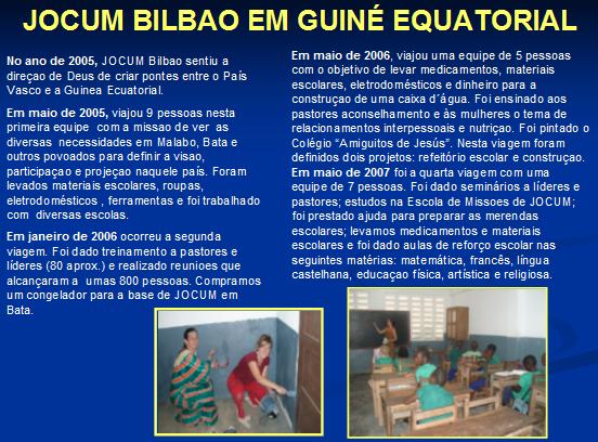 EQUATORIAL – ÁFRICAImagino, que você já recebeu e viu o power point que lhe enviei com informações desse país. Pois é, em Maio escolhi voltar e continuar implementando por mais 3 anos projetos no Colégio “Amiguitos de Jesús”. O trabalho deste ano será odontológico: obturações, extraçoes e informação. O custo dessa viagem é de 1.300 Euros (inclui passagens, hospedagem, visa, locomoção). Se você escolher ajudar-me pode fazê-lo no Banco do Brasil Ag. 0405-7 C/C 7876-X ou no HSBC Ag. 0645 C/C 90577-81 IGREJA Cada culto tem sido emocionante, Deus nos tem dado coisas novas, cada um, individualmente, está crescendo na sua intimidade com o Senhor. Cada culto tem sido de “louvor supremo”, como Deus nos disse que seria! LEMBRE-SE: AS DECISOES DE HOJE TERAO CONSEQUENCIAS FUTURAS - BOAS OU MÁS, VOCÊ ESCOLHE, É TEMPO DE ELEIÇAO! KELI CRISTINA ZERBIEN - Apartado 6525 - CP 48012 - Bilbao - Vizcaya - España - tel-fax 34 - 944.105.400 celular 34 - 669.431.915 jcum_bilbao@hotmail.com Contas bancárias no Brasil: Banco do Brasil Ag. 0405-7 C/C 7876-X ou HSBC Ag. 0645 C/C 90577-81 Cuenta bancaria en España: BBK nº 2095.0353.80.91-0557758-3 Fotos pessoais/personales: sem página no momento Informaciones Keli y JCUM: www.jcumbilbao.org www.jcumbilbao.spaces.live.com www.uniaonet.com/kelizerbien * O casal Pr. Davi e Shirley Arcos está em processo de mudança de campo. Seus móveis e utensílios domésticos estão, desde o dia 12/12, na alfândega do Rio de Janeiro. Ore pela liberação da mudança desses nossos missionários.JMM221 JAN04 JMM _ CBBA _ - 05/09/2003 A missionária Shirley Arcos encontra-se no Gabão fazendo um tratamento de saúde. Ore pela recuperação total da sua saúde. 16-12 - A missionária Shirley Arcos, esposa do Pr. Carlos Davi, que estava com malária, está bem de saúde. Agradeça ao Senhor pela saúde da missionária e peça pelo ministério da família nesse campo. · No dia 15 de dezembro acontecerá as eleições gerais na Guiné Equatorial. Ore a Deus pedindo pela situação políti-ca no país, e que os eleitos sejam aprovados pelo Senhor. Wesley