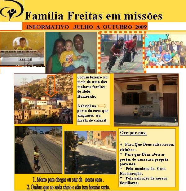 ( *nome fictício para proteger a identidade do menor.)Tem sido uma experiência muito boa ver o crescimento dos meninos na Casa Restauração, muitos chegam como Marcelo e depois quando eles começam a conhecer um pouco do Deus de amor, perdão e de Sua grande misericórdia, começam a ter uma mudança de comportamento, e muitas vezes é isso que nos impulsiona a continuar em Missões, quando olhamos para traz e começamos a lembrar como eles chegaram aqui e como estão agora. É bom lembrar a vocês que vocês também fazem parte da historia destes meninos, somos grato à Deus pela vida de cada um de vocês, pelas orações, contribuições, enfim, vocês estão aqui fazendo mudança na vida de muitos Marcelos. Motivos de Oração: 1- Pela nossa saúde 2- Pelo o dedo da Vanda e o tratamento de Fisioterapia que ela precisa fazer. 3- Pela salvação dos nossos familiares 4- Por todos os nossos mantenedores e intercessores (isso inclui você) 5- Por *Marcelo e sua família 6- Por sabedoria de Deus para conseguir trabalhar com os meninos da Casa Restauração. 7- Para que Deus continue nos usando e nos livre de todo mal. Oi Gente Paz seja convosco ! Esperamos que tudo esteja indo bem com vc e sua familia e que Deus possa estar a cada dia se revelando a vc como Pai poderoso que ele é . Gostaria de compartilhar um pouco de como estamos ? o que temos feito ? quais São os nossos desafios ? e quais São acontecimentos ministérios ? Creio que vários de vcs já sabem que estamos grávidos de aproximadamente um pouco mais de 2 meses estamos muito felizes com nosso bebe. Logo no começo da gravidez vanda ficou 3 dias de cama com um gripe muito forte que ainda não está 100% curada e graças a Deus já esta passando o enjôo. Mudança na nossa vida ! Na casa que moramos agora não se tem espaço para colocar um berço ou seja ter um quarto para o bebê então estamos orando para mudar para outra casa pedimos que ore conosco por isto . segundo as nossas contas o bebe vai nascer em Dezembro O que temos feito ? Erlon esta estudando na cruz vermelha pela manha e a tarde trabalha com as crianças da casa Restauraçao que nos últimos meses tem andado bem difíceis vários meninos resolveram voltar para vida do crime e alguns deles nos últimos meses tiveram vários acessos de raiva agredindo alguns do obreiros ex: um deles foi o Eu,mas desu tem nos dado muito graça com lidar com esse meninos. Vanda Continua trabalhando no treinamento de novos missionarios e agora temos 15 alunos em duas equipes uma no Rio e a outra no mato grosso do sul Desafios Temos orado para que Deus nos fortaleça no ministério e nos de sabedoria e discernimento Pela um casa maior que podemos ter espaço para o bebe . Pelo nosso sustento mensal porque os gastos estão aumentado e não temos plano de saúde que cobre o parto do bebe e para nosso pagamento na base . Vamos ficando por aqui em breve enviaremos nossa carta informativa mande noticias suas . Familia Freitas 14/05/07 10/06/2007 Familia Freitas