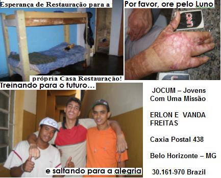 irmãos.*Lauro morou na casa Restauração no ano de 2003 (casa para eis meninos de rua )quando ele tinha 13 anos. Depois de passar por vários abrigos ele Chegou a nossa casa, ele chegou na casa Restauração, mas não consegui ficar por muito tempo retornou ás ruas. Durante o tempo de Lauro nas ruas ele se juntou a um grupo onde se envolveu com drogas e crimes que o levou a ter problemas com a Policia. Em Maio deste ano seu grupo envolveu em uma disputa de drogas com outro grupo. Numa noite enquanto Lauro dormia na rua, um menino do grupo adversário jogou tinner em seu corpo e depois ateou fogo e Lauro teve 45 % do seu corpo queimado e quase perdeu a vida ele esteve internado por meses, teve que se submeter a varias cirurgias plásticas para reconstituição de algumas partes de seu corpo que foram totalmente destruídas e algumas delas não foram bem sucedidas.Lauro recebeu alta do hospital e agora esta na casa restauração onde o Erlon e outros da equipe têm se revesado para dar banho nele que é um processo doloroso tem que usar gases para tirar toda a pele morta e algumas vezes ele grita de dor e depois tem que passar óleo vegetal (óleo de cozinha) e enfaixa - lo para não ficar exposto os ferimentos. Esta orientação foi dada pelo hospital, duas vezes na semana ele volta ao hospital para se avaliado como esta caminhando o processo de sua recuperação. De volta ao Brasil!