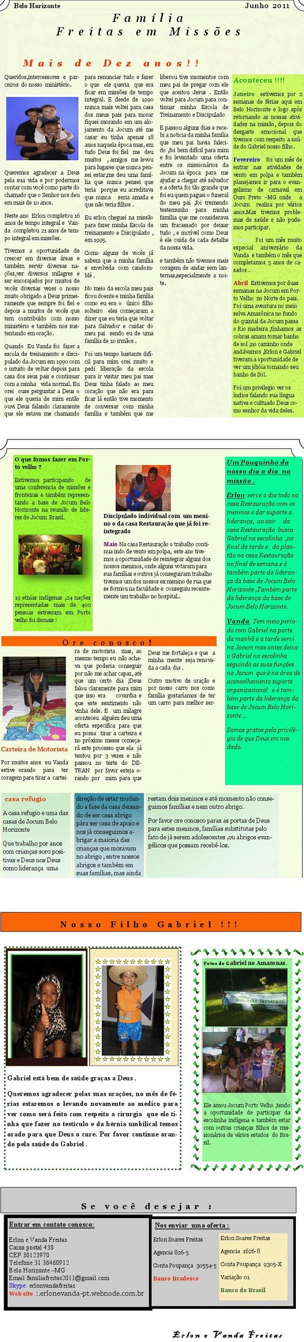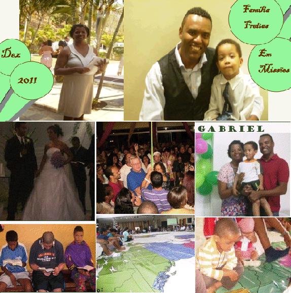 Pela cirurgia agendada para o dia 17 de fevereiro. Que Deus te abençoe e o nosso muito obrigado pelas suas orações te mandaremos noticias . abraços 26/02/2011 Oi Queridos , Queremos agradecer a vocês pelas as orações e te deixar saber que Gabriel não pode fazer cirurgia depois de 13 horas de jejum quando já estávamos no bloco cirúrgico a anestesia falou que não daria para ele fazer a cirurgia porque ele tinha o nariz escorrendo ,então voltamos para casa cansados fisicamente e emocionalmente . o medico avisou só daqui há 15 dias para tentar fazer a cirurgia novamente . um coisa sabemos que Deus tem o controle de tudo ,por favor continue orando por nos orações para que Deus nos guie na vontade dele nós vamos aguardar ate as fe´rias para tenta fazer a Cirurgia . Gostariamos de pedir que se tem uma palavra que o Senhor te Deu neste tempo nos deixe saber . Familia Freitas Vanda Freitas 28/03/2011 Oi Queridos, Intecessores e apoiadores. Espero que tudo esteja indo bem com vocês e sua familia . Aqui estamos bem ,e com Gabriel ele esta bem graças a Deus e em junho o levaremos para um urologista um acompanhamento com respeito a cirugia porque o medico nos deu opção de poder fazer a cirugia nas ferias dele da escolinha . Pedimos que continue orando pela saude e proteção do Gabriel e que Deus faça a vontade dele porque cremos na cura do Gabriel. Continue orando conosco Estaremos indo no dia 29/03 retornando 11/04 Na próxima terça feira estaremos indo como familia para Porto velho por duas semanas para representarmos a base de Jocum Belo Horizonte e para uma conferência de Missões na Jocum Porto Velho gostaríamos de pedir que esteja orando por nos . Por proteção contra Malária e também contra qualquer que seja o acidente . Para que Deus ministre o nosso coração com a vontade dele com respeito as nações . Pela nossa saude e proteção e que possamos terum bom tempo como familia nestas reuniões e ministrações . Que o Senhor os abençõe. Familia Freitas http://erlonevanda-pt.webnode.com.br Junho 2011 Queridos,intercessores e parceiros do nosso ministério. Queremos agradecer a Deus pela sua vida e por podermos contar com você como parte do chamado que o Senhor nos deu em mais de 10 anos. Neste ano Erlon completou 16 anos de tempo integral e Vanda completou 21 anos de tempo integral em missões. Tivemos a oportunidade de crescer em diversas áreas e também servir diversas nações,ver diversos milagres e ser encorajados por muitos de vocês diversas vezes o nosso muito obrigado a Deus primeiramente que sempre foi fiel e depois a muitos de vocês que tem contribuído com nosso ministério e também nos sustentando em oração. Quando Eu Vanda foi fazer a escola de treinamento e discipulado da Jocum em 1990 com o intuito de voltar depois para casa dos seus pais e continuar com a minha vida normal. Eu orei ouse perguntar a Deus o que ele queria de mim então ouvi Deus falando claramente que ele estava me chamando para renunciar tudo e fazer o que ele queria que era ficar em missões de tempo integral. E desde de 1990 nunca mais voltei para casa dos meus pais para morar fiquei morando em um alojamento da Jocum até me casar eu tinha apenas 18 anos naquela época mas, em tudo Deus foi fiel me deu muitos , amigos me levou para lugares que nunca pensei estar,me deu uma família que nunca pensei que teria porque eu acreditava que nunca seria amada e que não teria filhos . Eu erlon cheguei na missão para fazer minha Escola de treinamento e Discipulado , em 1995. Como alguns de vocês já sabem que a minha família e envolvida com candom- blé . No meio da escola meu pais ficou doente e minha família como eu era o único filho solteiro eles começaram a dizer que eu teria que voltar para Salvador e cuidar do meu pai sendo eu de uma família de 10 irmãos . Foi um tempo bastante difí- cil para mim orei muito e pedi liberação da escola para ir visitar meu pai mas Deus tinha falado ao meu coração que não era para ficar lá então tive momento de conversar com minha família e também que me liberou tive momentos com meu pai de pregar com ele que aceitou Jesus . Então voltei para Jocum para con- tinuar minha Escola de Treinamento e Discipulado E passou alguns dias e recebi a noticia da minha família que meu pai havia falecido ,foi bem difícil para mim e foi levantado uma oferta entre os missionários da Jocum na época para me ajudar a chegar até salvador e a oferta foi tão grande que foi eu quem paguei o funeral do meu pai ,foi tremendo testemunho para minha família que me considerava um fracassado por deixar tudo , e incrível como Deus é ele cuida de cada detalhe da nossa vida. e também não tivemos mais coragem de andar sem lan-ternas,especialmente a noi-te. Aconteceu !!!! Janeiro estivemos por 2 semanas de férias aqui em Belo Horizonte e logo após retornando as nossas ativi- dades na missão, depois do desgaste emocional que tivemos com respeito a saúde do Gabriel nosso filho. Fevereiro foi um mês de entrar nas atividades de vento em polpa e também planejamos ir para o evan-gelismo de carnaval em Ouro Preto –MG onde a Jocum realiza por vários anos. Mas tivemos proble-mas de saúde e não pude- mos participar. Março Foi um mês muito especial aniversário da Vanda e também o mês que completamos 5 anos de ca- sados . Abril Estivemos por duas semanas na Jocum em Por- to Velho no Norte do pais. Foi uma aventura no meio selva Amazônica no fundo do quintal da Jocum passa o Rio madeira ,tínhamos as cobras amam tomar banho de sol ,no caminho onde andávamos ,Erlon e Gabriel tiveram a oportunidade de ver um jibóia tomando seu banho de Sol. Foi um privilegio ver os índios falando sua língua nativa e cultuado Deus co- mo senhor da vida deles. O que fomos fazer em Por- to velho ? Estivemos participando de uma conferencia de missões e fronteiras e também represen- tando a base de Jocum Belo Horizonte na reunião de lide- res de Jocum Brasil. 19 e