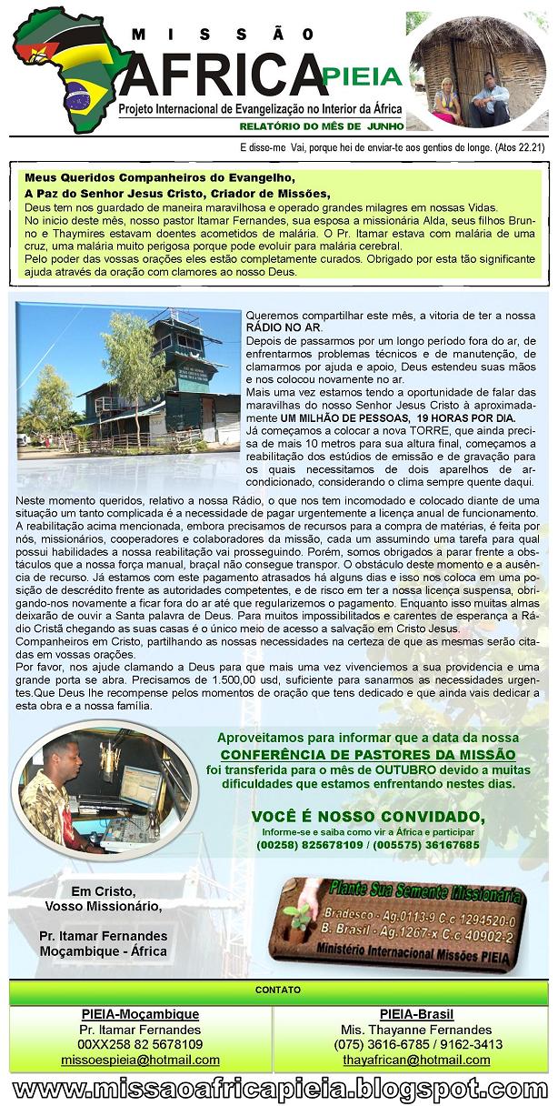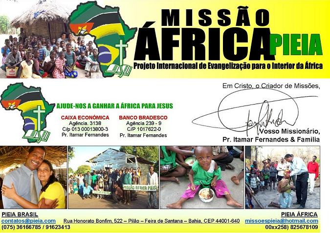 Forte Abraco Pr. Itamar Fernandes Missoes Pieia 16/07/2012 - www.missaoafricapieia.blogspot.com ... MISSAO AFRICA PIEIA DESAFIO MILHOES DE SALVOS A MISSAO PIEIA TEM 132 MISSIONARIOS NACIONAIS CONQUISTANDO AS ALDEIAS MOCAMBICANAS. NOSSO ALVO E TER 1000 OBREIROS ATE 2014. VOCE, SUA IGREJA , SUA EMPRESA, SUA FAMILIA PODE MANTER UM MISSIONARIO NACIONAL . APENAS 200,00 9 DUZENTOS REAIS) POR MES PODEMOS MANTER UMA FAMILIA MISSIONARIA NO INTERIOR DA AFRICA. ENTRE EM CONTATO CONOSCO E VAMOS ENVIAR O CERTIFICADO DE IGREJA MISSIONARIA, FOTO DO SEU MISSIONARIO E INFORMACOES DETALHADA DO LOCAL ONDE ELE TRABALHA. NOS AJUDE A GANHAR O INTERIOR DA AFRICA PRA JESUS. VISITE NOSSA PAGINA vosso missionario Pr. Itamar Fernandes .