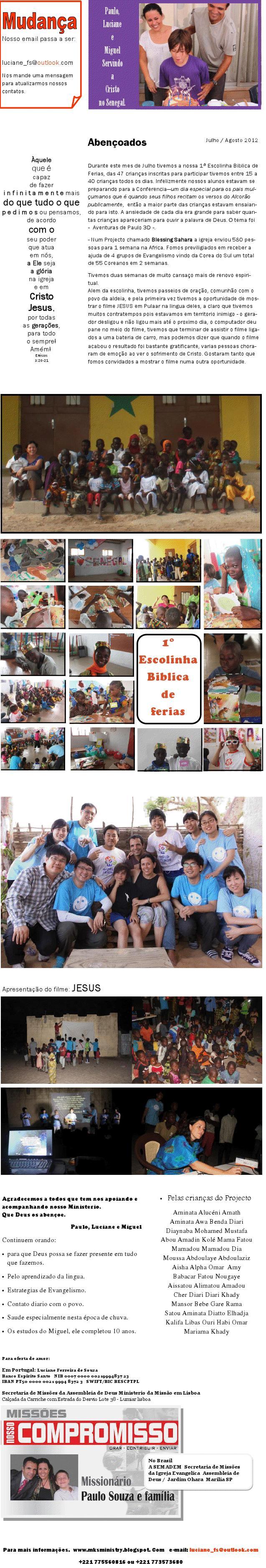 tual. Alem da escolinha, tivemos passeios de oração, comunhão com o povo da aldeia, e pela primeira vez tivemos a oportunidade de mos- trar o filme JESUS em Pulaar na lingua deles, a claro que tivemos muitos contratempos pois estavamos em territorio inimigo - o gera- dor desligou e não ligou mais até o proximo dia, o computador deu pane no meio do filme, tivemos que terminar de assistir o filme liga- dos a uma bateria de carro, mas podemos dizer que quando o filme acabou o resultado foi bastante gratificante, varias pessoas chora- ram de emoção ao ver o sofrimento de Cristo. Gostaram tanto que fomos convidados a mostrar o filme numa outra oportunidade. 1°