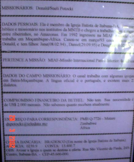 de quatro ficará na Igreja Batista em Mukwasine, onde fomos membros por