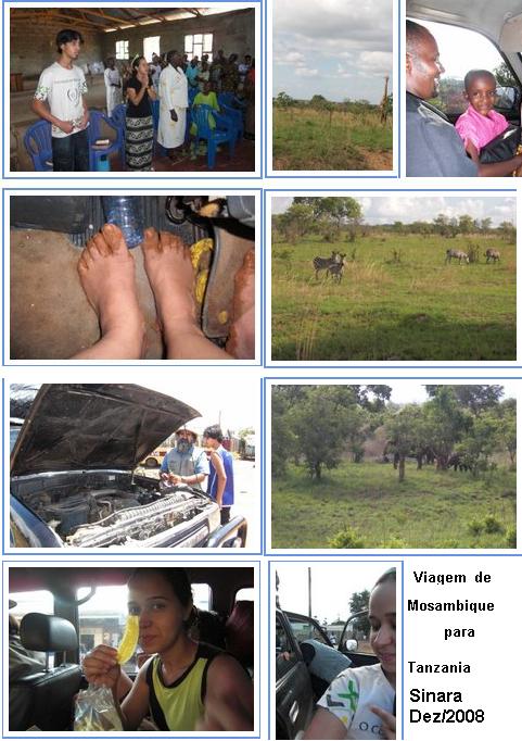 e paz... Quero começar essa carta deixando com você um versículo para meditar: Meu coração está tranqüilo e confiante, ó Deus! Cantarei louvores e hinos a ti! Acorda minha alma! Acordem liras e harpas! Vou acordar bem cedo, cantando! Entre as nações, em alta voz, cantarei hinos de gratidão e louvor a ti, porque o teu grande amor é maior que os céus. Tu sempre és fiel e verdadeiro! Sempre! Sl.57:7-10 Estou em Arusha Tanzania, na casa do PR. Goodluck agora. Assim que terminar de escrever essa carta vou conectar pra mandar a carta por celular. Aqui começa minha aventura. Saímos de Nampula segunda feira, dia 1 mais ou menos umas 8:30 da manhã. O nosso objetivo era chegar ate Cuamba, chegamos lá umas 17:00hs. Lá tem um missionário brasileiro, mas não ficamos na casa dele por que era pequena e também não tínhamos conseguido falar com ele antes, mas ele nos recebeu muito bem, nos chamou pra jantar e ofereceu o banheiro para tomarmos banho. Ficamos acampados no pátio da Emose (empresa q o PR. Magaia trabalha), foi pura aventura, acabamos de jantar e começou um vento forte, muito forte parecia filme de terror, a energia acabou, as nossas barracas começaram a voar, dava cada trovoada parecia que ia partir a cidade ao meio, foi horrível... Desmontamos as barracas correndo e esperamos dentro do carro. Passou o vento e montamos uma barraca, e a parte boa, não tinha colchão, nem coberta... Nada. Só uma esteirinha... SÓ A GRACA... hehe No dia 2 seguimos viagem ate Lichinga, íamos até a fronteira, mas o pessoal achou melhor não seguir viagem, pois não era uma estrada boa. E podíamos chegar à fronteira e eles não quererem nos receber. Dormimos na casa de outra missionária em Lichinga o nome dela é Lidia. Recebeu-nos muito bem. No dia 03 seguimos para atravessar a fronteira, graças a Deus passamos pela fronteira sem nenhum problema, os policias nos liberaram rápido, eles falaram que tinha um pedaço da estrada que era muito perigoso tinha muito barro (matope) o tempo estava muito fechado podíamos ficar atolados se não chegássemos antes da chuva. Assim que atravessamos à fronteira a chuva caiu. Fininha mas depois engrossou, afinou de novo e depois de 40 km da fronteira chegamos à bendita parte do matope (barro), chegando La já tinha um caminhão atolado. O Pr. Decidiu que ia puxar o caminhão se o caminhão não saísse nos Tb não passávamos. Ate então não tínhamos pegado o visto. Tiramos o caminhão, nisso outro carro que veio atrás do caminhão atolou também o Pr. tirou o outro carro, foi benção, nisso já tinha ajuntado um monte de gente que saiu do meio do mato pra ajudar. O carro dançava na pista, foi horrível eu só ficava orando. RS depois que o pastor passou à metade da matope, ele mandou eu e o Natanael entrar no carro, pois eu estava filmando tudo, ate chegar ao carro eu tive q tirar o chinelo, porque o barro não deixava levantar o pé de tão grudado que estava. Cada vez que conseguíamos passar o povo atrás vinha gritando, e correndo atrás do carro achando bom, porque estava complicado passar, não da pra contar o desespero de dentro do carro. A tensão era tão grande que eu nem consegui filmar, dentro do carro só virou o matope (barro). GRAÇAS A DEUS conseguimos sair. Alguns minutos depois passou um chapa por nos que estava o pr. Good ele estava indo para nos encontrar na fronteira. Foi festa! Começamos a gritar quando encontramos com ele, estávamos perdido se um policial nos parasse, ninguém sabia falar (swailli) nada, e outra estávamos sem o visto. o nosso destino era SONGUEIA, onde íamos pegar o visto e arrumar a documentação do carro. Chegamos a Songuea umas 9 hs da noite, cansados cheios de barro, fomos pra imigração e já não tinha mais ninguém. O Pr. Good conseguiu falar com um dos chefes e ele disse que podíamos ir pra um hotel e voltármos no outro dia que não teria problema... CONSEGUIMOS ACHAR UM BOMM HOTEL. No dia 4 fomos cedinho pra imigração, foi à manha TODAAA pra resolver a documentação. Nossa só o SANGUE, dormimos em Macambaco . No dia 5 saímos cedo, pegamos 350 km de serra . Seguimos ate Chalinze, dormimos num hotel que se chama HOTEL MAASAI o melhor da cidade (cidade pequena) PENSA NUM HOTEL QUE FAZ USO AO NOME, os quartos com muito cheiro de insenso, o banheiro? Misericórdia... Foi guerra, não dormi a noite inteira! No 6 dia quando deu 5 horas da madruga, o pr. Me chamou nunca achei tão bom sair pra viajar. SAIMOS nosso destino era ARUSHA , quando faltava duas horas pra chegar a Arusha o carro estraga, paramos era a vela que tinha estourado, perdemos duas horas nisso. CONSEGUIMOS CHEGAR A ARUSHA AS 18:00hs MAIS OU MENOS, na casa do PR. Good, TINHA MUITAS PESSOAS PARA NOS RECEBER, vieram os jovens correndo na frente do carro . Faltava muito para chegar, quando estamos quase chegando vieram as mamas(mulheres) e todo mundo cantando e sorrindo ate o carro parar na casa do pr., Good. Foi muito bom... Aqui é outra realidade, porem a guerra é mais intensa ainda.. Tentei resumir a viagem! Jesus esteve conosco em todos os momentos, cuidando de todos os detalhes... Na quarta feira dia 10-12-08, estamos indo para o Quênia vai ter seminário e vou ministrar, então ore por mim! Alias por nos, são 4 dias de seminário. Estamos bem, to arriscando nas palavras em inglês e swaille. Orem pra que eu tenha facilidade para aprender o swaille e o inglês. Deus os abençoe por estar comigo nessa nova jornada do meu ministério. Sinara Carvalho e Silva. Tanzânia – África www.melodia.com.br A
