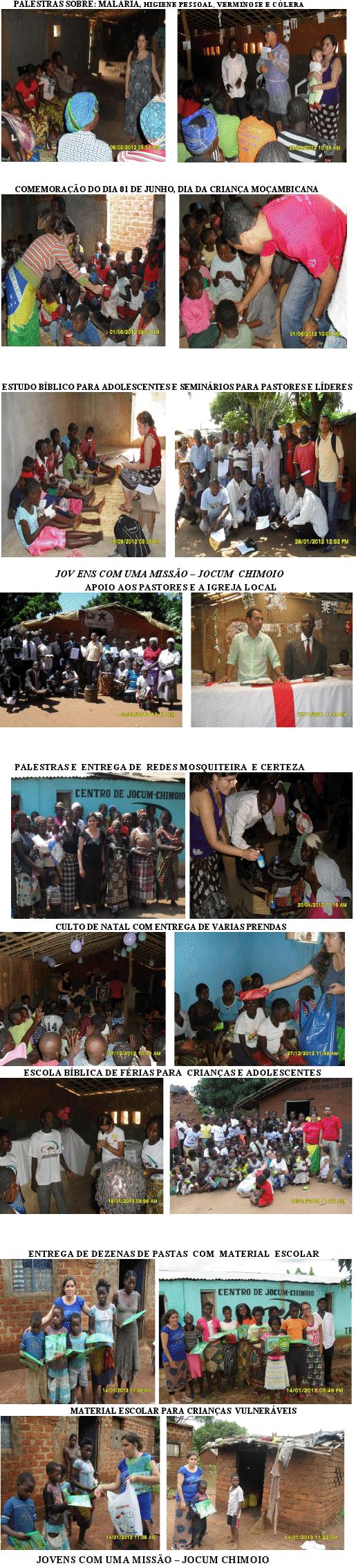 organização missionária Jovens Com Uma Missão - JOCUM Chimoio, devidamente registrada no Departamento dos assuntos religiosos de Manica sob o Nº 216, vem mui respeitosamente fazer a entrega desde relatório anual referente as actividades realizadas por esta organização na cidade de Chimoio no período entre Janeiro de 2012 até Janeiro de 2013. Deixamos nossa sincera gratidão pelos bons serviços prestados à esta organização ao longo do ano. Fotos : PALESTRAS SOBRE: MALÁRIA, HIGIENE PESSOAL, VERMINOSE E CÓLERA COMEMORAÇÃO