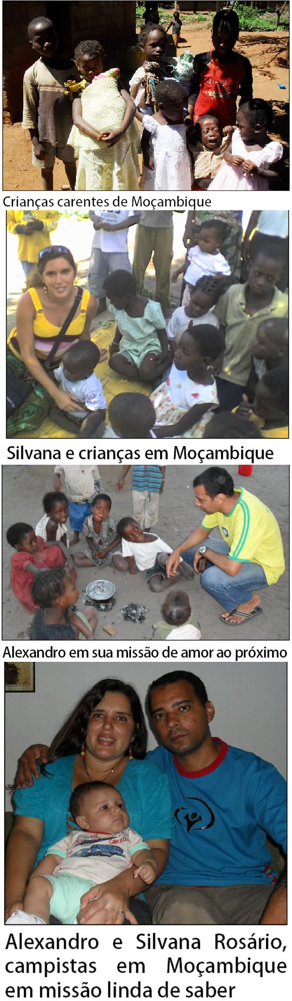 2 Moçambique é um país que luta para sair do quadro de pobreza absoluta, dos cerca de 20 milhões de habitantes, mais de 15% está contaminada com HIV e todos os habitantes vivem com os constantes ataques do mosquito da Malária. Os campistas ja tiveram mais de 10 Malárias e vivem expostos a diversos tipos de doenças como: Tuberculose, lepra, HIV,… Em Fevereiro deste ano estarão iniciando um trabalho de reforço escolar para crianças em risco, órfãs e vitimas do HIV, junto a igreja local, e vivem em busca de ajuda do mundo para material escolar e finanças para o lanche das crianças. Exemplo