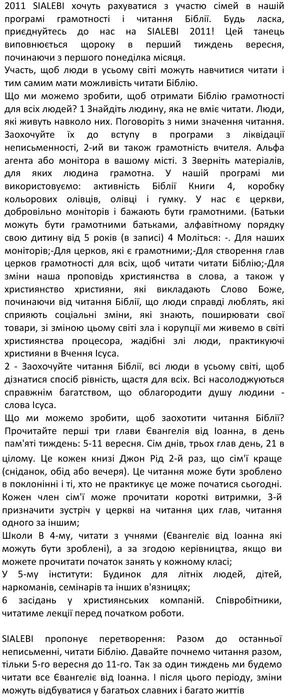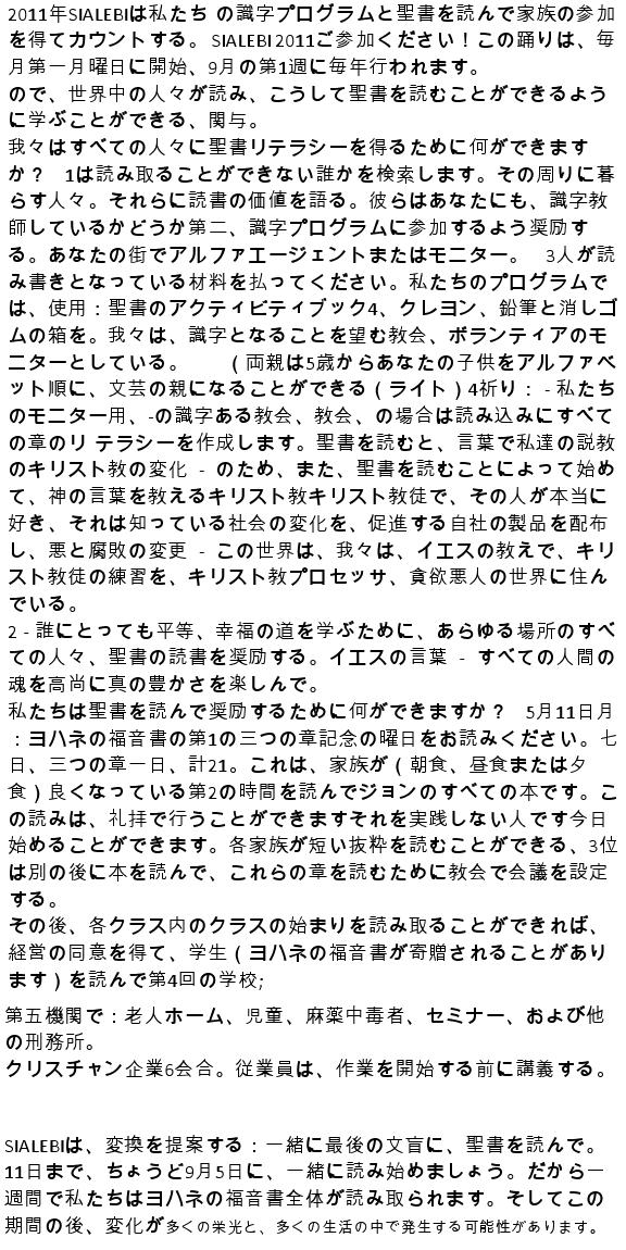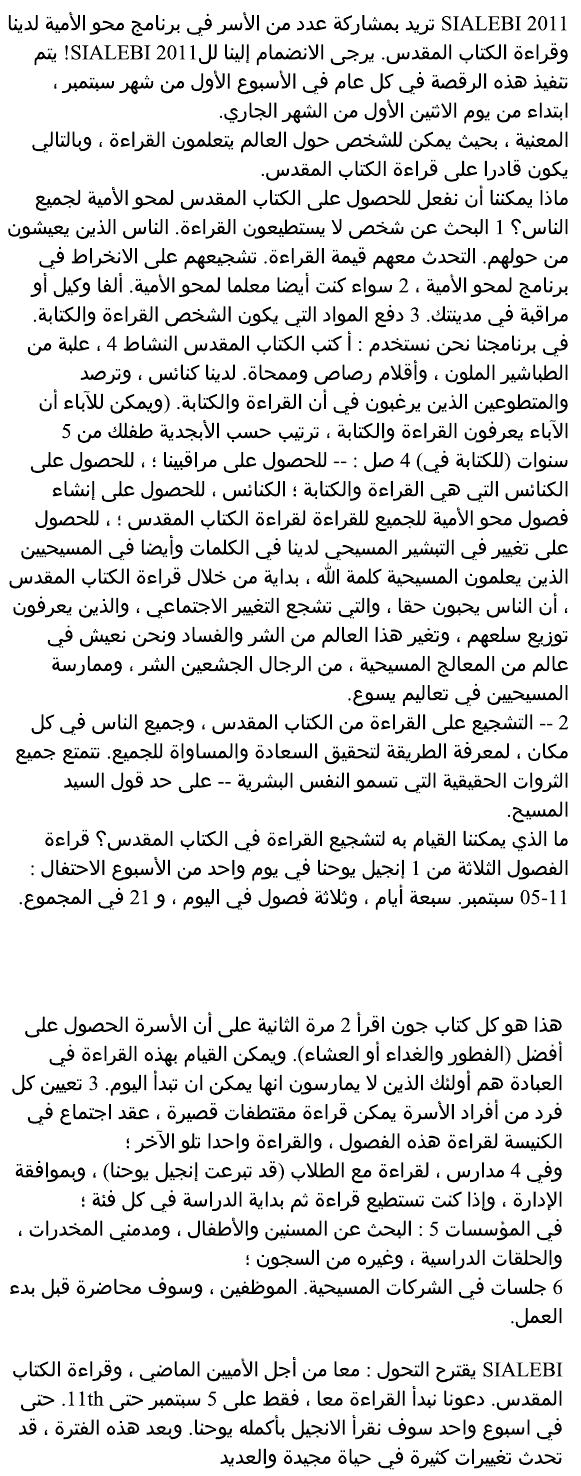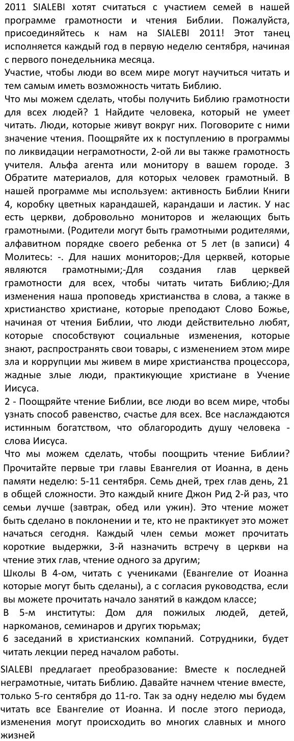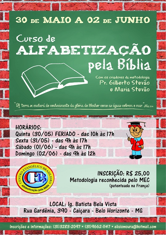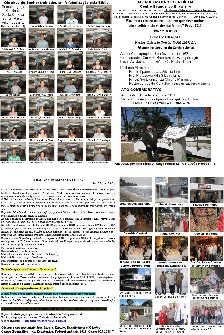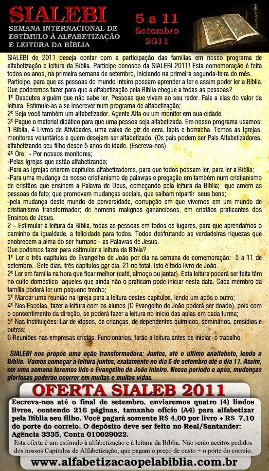 _ Prezado Pastores e irmãos em Cristo de todo os Estado de Minas 15/01/2014 - Meus amados: - que os vossos dias sejam aumentados. - que o nosso Deus, em Jesus vos, dê muita força para realizarem todos os vossos sonhos; - que grandes e copiosas bênçaos sejam derramadas sobre as vossas preciosas vidas; - que Ele continue usando vocês em seus caminhos, para que muitas vidas sejam abençoadas, por onde quer que forem. São nossos desejos e nossa humilde oração. Obrigado, meu Deus e Pai, por mais este ano de vida e saúde! Vocês são nossos eternos amigos! Gilberto e Maria Stêvão PS: Gostaria de informa-lhes, amados, que meu livro para alfabetizar crianças de 4 a 6 anos ficou finalmente pronto, todo colorido e ricamente ilustrado por nossa querida Susy Nakamura. Preço fixado: R$ 39,90. Sem condições para doar um exemplar a você, ofereço, um desconto de R$ 9,90 mais o porte do correio. Assim poderá tê-lo em suas mãos, apreciar, fazer observações e recomendar aos pais que desejam ensinar seus filhos, líderes das Escolas Dominicais e professores alfabetizadores. Peço que me ajude, pois despesas com a publicação precisam ser cobertas e não recebo contribuições para meu ministério evangelístico alfabetizador. Desejando adquirir, faça o pedido por este email. Obrigado! ... Depósito no Banco Santander (R$ 30,00 - trinta reais): Agência 3335, conta conjunta de Maria José e Gilberto Stêvão 01002902-2. SEMANA INTERNACIONAL DE ALFABETIZAÇÃO E LEITURA DA BÍBLIA CELEBRAÇÃO DA SIALEBI EM 2015- 6 A 13 DE SETEMBRO ESTE ANO ABENÇOAREMOS OS IMIGRANTES HAITIANOS A SIALEBI é uma comemoração de oito (8) dias, todos os anos, dedicados à alfabetização e à leitura da Bíblia. Começa no domingo que antecede o dia 9 de setembro e encerra no domingo seguinte. Nessa semana também, damos ênfase à necessidade de alfabetizar todas as pessoas e estimulamos à leitura da Bíblia nesses oito (8) dias, de domingo a domingo. Nessa semana cada irmão fará uma contribuição destinada à compra de Bíblias para serem doadas nos programas de Alfabetização pela Bíblia aos imigrantes haitianos. A LEITURA DA BÍBLIA: Este ano de 2015 a Sialebi começa no dia 6, com a Leitura da Bíblia em I Coríntios cap. 1 e 2. Cada dia se fará a leitura de dois (2) capítulos. Ao encerrar as comemorações, no domingo dia 13, todos os 16 capítulos do livro I aos Coríntios terá sido lido. Qualquer pessoa que ler com desenvoltura média, poderá ler I aos Coríntios em 50 minutos. Vamos lá, amados, escrevam para sialebi@gmail.com dizendo-nos que você vai participar da Sialebi 2015. Diga-nos que sua Igreja também vai participar. Neste ano o Centro Evangélico Brasileiro oferecerá certificado de participação. Agradecemos por afixar este cartaz de divulgação no mural de sua Igreja e instituição de ensino. A ALFABETIZAÇÃO: A toda Igreja ou irmão que participar da Sialebi 2015 com plano de leitura da Bíblia e ajuda finaceira ao programa de Alfabetizaçào pela Bíblia, será considerado parceiro em nosso programa Alfabetização pela Bíblia. Você poderá escrever para alfabetizacaopelabiblia@hotmail.com e prontamente lhe atenderemos prestando todas as informações, e também nossos 23 projetos, bem como ofereceremos credencial para representar Alfabetização pela Bíblia em sua Igreja e em seu município. CONTRIBUIÇÃO: A Bíblia, capa dura, de letras grandes, a que usamos para alfabetizar, seu custo em mecados de vendas é de R$ 50,40 (cinquenta reais e quarenta centavos), mas compramos, a preço já subsidiado, por R$ 15,00 (quinze reais). Serão estas mesmas Bíblias que ofereceremos aos imigrantes haitianos, para que aprendam a ler e falar português. As Bíblias com letras pequenas, custam mais barato, mas não servem para atingir nossos objetivos de ensinar a ler, ensinar falar português, evangelizar com a Palavra de Deus. Serão as ofertas advindas das vossas contribuições particularmente ou através de Igrejas, que compraremos, são Bíblias aplicadas ao programa. FAÇA SUA DOAÇÃO DE PELO MENOS 1 BÍBLIA! Deposite sua doação para o Centro Evangélico: Na Caixa Econômica Federal, agência 1525, conta número 2.088-7. ALIANÇA DE FIDELIDADE: Sua oferta de amor será inteiramente usada na aquisição de Bíblias e Materiais didáticos que serão entregues aos capítulos alfabetizadores destinados aos imigrantes haitianos. HISTÓRICO: 1. A SIALEBI nos propõe uma ação transformadora: Juntos, até o último analfabeto, ensinando a ler e a praticar a leitura da Bíblia diariamente. Este é o quarto ano desde sua proposição em 2012 quando iniciamos lendo todo o Evangelho de João. Em 2013 foi lido todo o Evangelho de Marcos. Em 2014 lemos a Epístola de Romanos e este ano de 2015 leremos I aos Coríntios. Nesses poucos anos, mudanças gloriosas ocorreram na vida de muitas pessoas e muitas outras poderão ocorrer em muitas e muitas vidas, porque a Palavra é "lâmpada para os pés e luz para o caminho". Ela não volta vazia, faz sempre o que Deus deseja. Aleluia! Sugerimos que jovens e outros que desejarem participar façam, no dia 13, leitura pública de todo o texto, no templo, 45 minutos antes do início do culto à noite. 2. A SIALEBI foi criada e é comemorada para que pessoas do mundo inteiro: a) Aprendam a ler, para que possam ler a Bíblia: Prog. de Alfabetização pela Bíblia; b) Os que amam a Palavra de Deus sejam estimulados a ler a Bíblia diariamente; c) Tenham oportunidade de participar e colaborar deste grande projeto alfabetizador. CONHEÇA-NOS em: www.alfabetizacaopelabiblia.com.br Siga-nos no Facebook, Twitter, LinkedIn. Fale conosco no Skype: gstevao1 ou fone (41) 3232-1917. Vosso em Jesus Pastor Gilberto Stêvão - Há 57 anos no serviço do Evangelho de Jesus