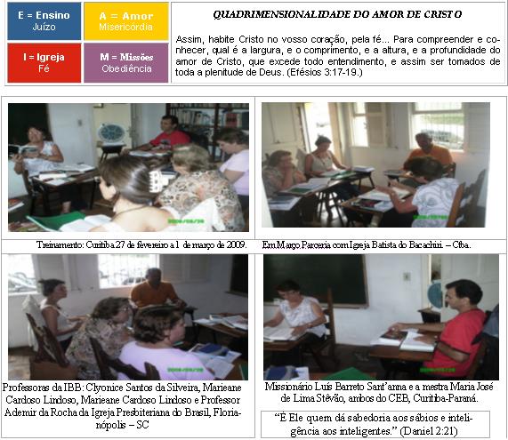 = = NÃO ESQUEÇA de sua preciosa oferta no dia da Dia 9 de dezembro de 2007. Diga ao Senhor Jesus: Eu posso! Minha igreja pode ajudar o pastor Gilberto Stevão e sua equipe a realizar este tão necessário ministério. Visitem-nos em: www.alfabetizacaopelabiblia.com.br – O Ministério depende de sua ajuda. OBRIGADO! Dados para depósito: Maria José de Lima Stevão – Secretária do Centro Evangélico Brasileiro CPF: 358.953.659-49 PR. Banco REAL AG: 0335 C/C: 3.705.997-6 Caixa Econômica Federal AG: 1525 Conta: 36.240-8 Registros de nossa entidade: CENTRO EVANGÉLICO BRASILEIRO Rua Senador Xavier da Silva, 50 Data de fundação 23/maio/ 1971 - 2º. Cartório de Pessoa Jurídia de Curitiba – PR – apontado no.178517 protolo A-4 sob no.8622, livro K-10 de 24/02/75. - CNPJ no. 081078255/00001-79 Declarado de utilidade pública sob números: Municipal. 9.272/72; Estadual 11.882/72; Federal (CNAS) 23025004877/90-35. Diretoria atual: Gilberto Stevão - presidente; Maria José de Lima Stevão – Vice presidente; Eliane Mara de Matos – 1ª. secretária; Pierre Alberto Cândido da Silva Pereira – 2º. Secretário; Geraldo Alves Tadeu – 1º. Tesoureiro; Isacir Mognon 2º. Tesoureiro. Conselho Fiscal: Péricles de Matos, Antonio Nelson dos Santos e Eliel Gilberto de Lima Stevão 14 abr 2008 _ Olá, amados, a paz do Senhor Jesus! Agora acabei a adaptação o meu método para a Bíblia Popular da Sociedade Bíblica do Brasil - NTLH. Assim, apartir desta semana, a segunda de abril de 2008 atender a todos que desejarem adquiri o material para iniciar um capítulo de Alfabetização pela Bíblia.(Só atendemos com esta finalidade e desde que o interessado tenha preenchido o cadastro que pode ser encontrado em http://www.alfabetizacaopelabiblia.com.br/icadastro.asp - * ver nota) A última projeção do Bureau do Censo dos Estados Unidos diz que o mundo já alcançou 6.500.000.000º habitantes. + TRÊS BILHÕES DE PESSOAS NO MUNDO JÁ PODEM CONHECER E APLICAR ALFABETIZAÇÃO PELA BÍBLIA ISTO É + OU – A METADE DA POPULAÇÃO DO MUNDO Agora você pode também conhecer o livro: Método de Alfabetização pela Bíblia – uma revelação do Senhor Jesus que nos foi dada. São 36 lições e 4 revisões. A semana passada enviamos para que conhecessem a mensagem da lição 7. Estamos analisando as sugestões de mudanças, em que o projeto deverá continuar com o nome Alfabetização pela Bíblia e o Método com o nome Gilberto Stêvão. Assim Deus nos revelou a metodologia e a didática de ensino: Metodologia: - Mensagens - Familia silábica – nas línguas neo-latinas ou Raizes na Língua Indy. - Ensino das colunas e das vigas - as frases organizadas ou versículos bíblicos. Didática: A didática, ou o proceso ensino-aprendizagem, está nas lições contidas no Caderno de Atividades. São 189 páginas contendo lições programadas (milhares de atividades em linguagem e matemática - com dezenas de folhas com linhas caligráficas anexas. Cartilha: A Cartilha é a Bíblia - onde tudo é ensinado e depois fixado no Caderno de Atividades. Nada no mundo educacional é semelhante a esta metodologia e a didática que usamos em alfabetização pela Bíblia – É uma revelação de Deus para alfabetizar crianças, jovens, adultos e idosos, passo a passo, e levá-los a fé salvadora nos evangelhos do Senhor Jesus. Seguem os nomes das cidades e igrejas onde haverá treinamentos no mês de maio. Clique no linque abaixo: http://www.alfabetizacaopelabiblia.com.br/treinamento_fev2008.asp Quem deve participar: Pais, interessados em alfabetizar seus filhos pela Bíblia; Professores, que desejam conhecer a metodologia e aplicá-la. Pessoas que desejam se tornar monitores para alfabetizar, ensinando e ganhando almas para Cristo; Pastores, missionários, obreiros, presbíteros, seminaristas, que desejam aplicar o projeto-programa de Alfabetização pela Bíblia em seu campo de trabalho. Hoje nenhuma igreja, missão ou curso de formação bíblica ou teológica pode ignorar o processo ensino-aprendizagem de alfabetização. Em 22 anos de implantação já contamos com a parceria de 96 denominações, duas Sociedades Bíblicas e mais de 7.000 capítulos em vários paises. Hoje é possível aplicar o método em mais da metade da população na face da terra, pois está escrito nas línguas: portuguesa, inglesa, espanhola e indy. Em 2008 será também traduzido para o Cárnada, lingua falada por 45.000.000 de pessoas na Índia. Vamos juntos fazer o mundo de pessoas felizes com as bênçãos da Palavra de Deus. (Ap. 1:3) Continue orando por nós e ajude-nos com aquilo que lhe for possível – uma oferta ao SENHOR - para possibilitarmos doação a todos que não podem comprar o material didático. A SOCIEDADE BÍBICAS DO BRASIL está doando as Bíblias aos analfabetos. Doe você também o Caderno de Atividades para aqueles que não podem comprá-lo. O custo para alfabetizar uma pessoa é + ou – R$ 50,oo; com o porte do correio (que cobra uma taxa bem alta: R$ 15,90 material para um aluno; R$ 48,90 – materiais 10 alunos) Dizemos + ou – R$ 50,00 devido a variação da taxa do correio, pois dependendo da distância o porte pode chegar até mais de R$ 150,00) Doações voluntárias: Banco Real - Agência 0335-2 Conta 3.705.997-6 Caixa Econômica Federal – Agência 1525, Conta 013 – 36.240-8 As contas estão em nome da tesoureira Maria José de Lima Stevão e Gilberto Stevão. Na Caixa é conta poupança, já que este serviço isenta o programa de pagamentos de taxas bancárias. Vosso em Jesus Pastor Gilberto Stevão – Mais de meio século no serviço do Senhor Jesus - 8/2/1958 –8/2/2008. * O programa e metodologia são aplicados no ministério de Alfabetização pela Bíblia para pessoas que desejam servir a Deus alfabetizando, fala a linguagem que priveligia a Igreja de Jesus, não tem finalidades lucrativas, por isso não é encontrado para venda em lugar algum a não ser em nossa sede missionária. N