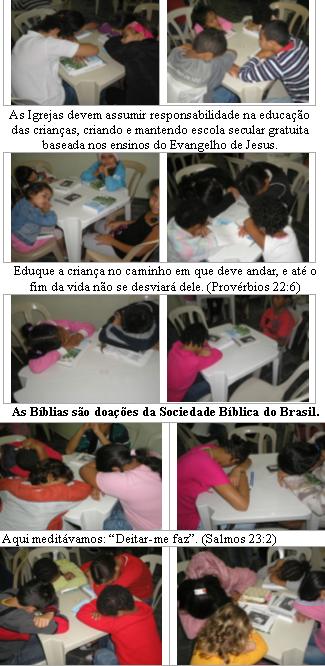 BRASIL PRECISA DE GENTE QUE FAZ AS COISAS ACONTECEREM. ESCOLAS COPIAM A BÍBLIA Amado irmão: A paz do Senhor Jesus Cristo seja com Você. “Deus lançou os fundamentos da terra, para que não vacile em tempo algum.” (Salmos 104:5) “Portanto, convém-nos atentar, com mais diligência, para as coisas que já temos ouvido, para que, em tempo algum, nos desviemos delas.” (Hebreus 2:1) O mundo usa de estratégia para alcançar objetivos malignos como dizer que a educação ministrada pelo Estado é laica é por isso não pode permitir que princípios e valores sejam ministrados nas escolas. Estado sem objetivo político não existe, é puro engano dizer que laico quer dizer sem objetivos filosóficos. O uso da palavra “laico” é estratégia dos filósofos que regem o sistema educacional no mundo para não permitir ensinar as crianças os princípios de Evangelho de Jesus, os bons costumes das famílias, os fundamentos de um Ser Criador, na origem de todas as coisas. Não obstante a Bíblia diz que devemos ensinar as crianças esses bons costumes, estes princípios e fundamentos para que nunca se esqueçam deles até o final de suas existências. O que poderemos fazer diante de um gigantesco sistema educacional materialístico, evolucionista e ateu que diariamente por muitas e muitas horas doutrinam os nossos filhos? Deus colocou em meu coração um profundo desejo de marcar no coração das crianças uma lembrança de que um dia esteve em contato com a Palavra de Deus, escrevendo um versículo da Bíblia. Por essa razão convido todos os pais, professores e pessoas preocupadas com os valores morais e éticos de nossas crianças para realizarmos em 2009, a partir do segundo semestre, “O Ano que nas Escolas Escreveram a Bíblia. A Proposta completa segue abaixo. Estou apresentando a Superintendência da Educação no Paraná e a Câmara Municipal de Vereadores em Curitiba através de alguns vereadores. Faça isto em sua Cidade e em seu Estado. Antes , porém articule conosco aqui em alfabetização pela Bíblia. Segue proposição: ESCOLAS COPIAM A BÍBLIA PROPOSTA: Copiar a Bíblia à Mão em todas as Escolas Possíveis.. Desenvolvimento: Organizar, através de voluntários, comissão que levará a todas as escolas um programa para que os alunos escrevam a Bíblia à Mão. JUSTIFICATIVA: A Bíblia é um patrimônio da humanidade. Ela não pertence a uma religião ou uma nação, embora tenha sido escrita por judeus e cristãos. A Bíblia é uma conquista do ser humano como são todas as descobertas, todas as ciências, todo saberes.. A Bíblia contém 773.693 palavras com 3.566.480 letras. Humanamente organizada em 1.189 capítulos e 31.102 versículos nos seus 66 livros canônicos. A Bíblia ensina o que todas as grandes religiões monoteístas aceitam como verdade absoluta, ou seja, que o mundo foi criado por um Ser Soberano, mencionado como o CRIADOR do Céu e da Terra e do Mar e tudo o que neles existe, cujo nome pode ser traduzido pelo SENHOR DEUS ETERNO. Escrever uma cópia da Bíblia será para toda comunidade escolar e estudantil uma experiência imorredoura na vida de cada participante, especialmente sendo o resultado encadernado e exposto na Biblioteca de cada unidade escolar. Os valores podem sofrer transformações, dependendo de circunstâncias, mas os princípios que norteiam o homem em sociedade não mudam jamais, sob pena de sua própria extinção da face da terra. Os dias que vivemos têm nos demonstrado situações sociais catastróficas, que nos leva ao sagrado dever de repensar o futuro de nossos filhos, não somente nas perspectivas material e educacional, mas também social e moral, responsáveis que são pela felicidade de cada um e de todos os seres humanos. Situações essas que nos impõe o dever de oportunizar as nossas crianças acesso aos tesouros do conhecimento da Bíblia, mormente porque “copiar” constitui um dos aspectos principais de fixação pedagógica do conhecimento. A Bíblia fala que Deus é o Criador e que por meio de Jesus, Seu Filho Unigênito, criou todas as coisas, o que transmite para as crianças um conhecimento de experiência comum, pois todos nós somos provenientes de um Pai OBJETIVO: Levar as crianças a conhecerem os conteúdos da Palavra de Deus, a Bíblia, tendo contato com pelo menos com a escrita de um versículo. Uma vez que as escolas devem partilhar a responsabilidade pelo ensino de valores morais e sociais com as famílias e com a comunidade, trazer a Bíblia para o campo educativo em escolas públicas e privadas é colocar à disposição delas um poderoso instrumento que somará na construção dos princípios fundamentais: EXCELÊNCIA, sem o que não haverá êxito pessoal, consequentemente o comunitário. HONESTIDADE E A CONFIANÇA, princípios que constroem a integralidade. A Bíblia diz que é preciso confiar. O Brasil sucumbe a cada dia pela falta destes valores morais, e a integralidade de nossa pátria dependerá muito dos exemplos que os poderes constituídos demonstrarem. RESPEITO - Não há como viver harmonicamente em sociedade sem que se saiba respeitar a si mesmo e os direitos dos outros. A Bíblia fala sobre o respeito, iniciando com a honra devida aos pais: “Honra o teu pai e a tua mãe”, sendo o único mandamento com promessa de longevidade. RESPONSABILIDADE – A consciência de assumir a responsabilidade é básico ensinamento da Bíblia, conscientizando que cada um prestará contas de seus atos ao Criador. A criança deve ser treinada na responsabilidade social, ecológica e individual. COOPERAÇÃO – A Bíblia fala sobre traírem-se uns aos outros, e que não andarão dois juntos se não houver entendimento. Quando trabalhamos em colaboração uns com os outros, os objetivos comuns tornam-se mais facilmente alcançados. Os conflitos e sua pacificação dependem da cooperação das partes envolvidas. A Bíblia fala que Davi enviou mensageiros a uma nação estrangeira com proposta de paz