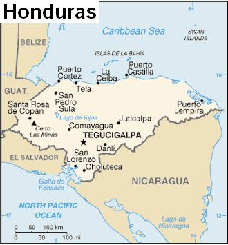 www.uniaonet.com/amchonduras.htm Honduras ... país da América Central, limitado a norte pelo Golfo das Honduras, a norte e a leste pelo Mar das Caraíbas (por onde possui fronteira marítima com o território colombiano de San Andrés e Providencia), a sul pela Nicarágua, pelo Golfo de Fonseca e por El Salvador e a oeste pela Guatemala. Sua capital é Tegucigalpa... (Wikipedia)