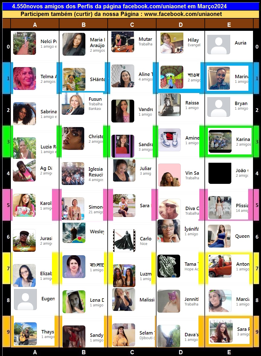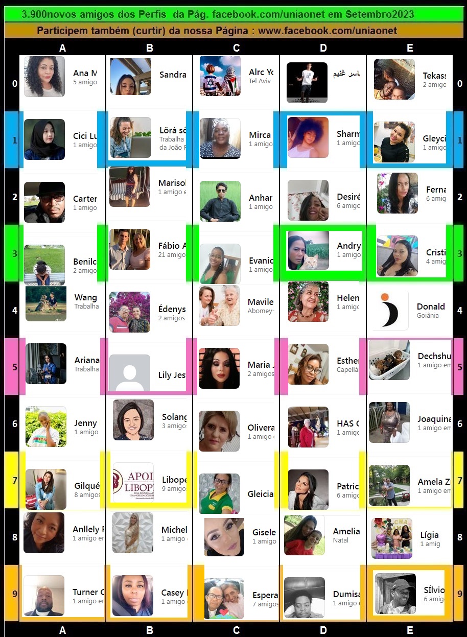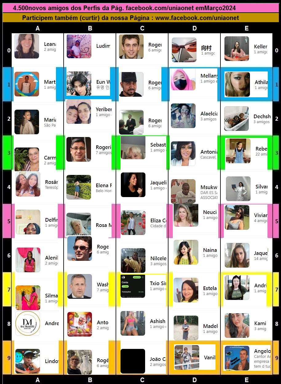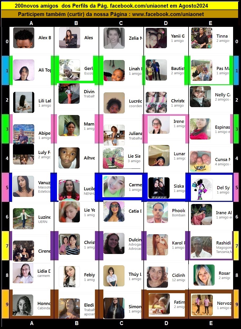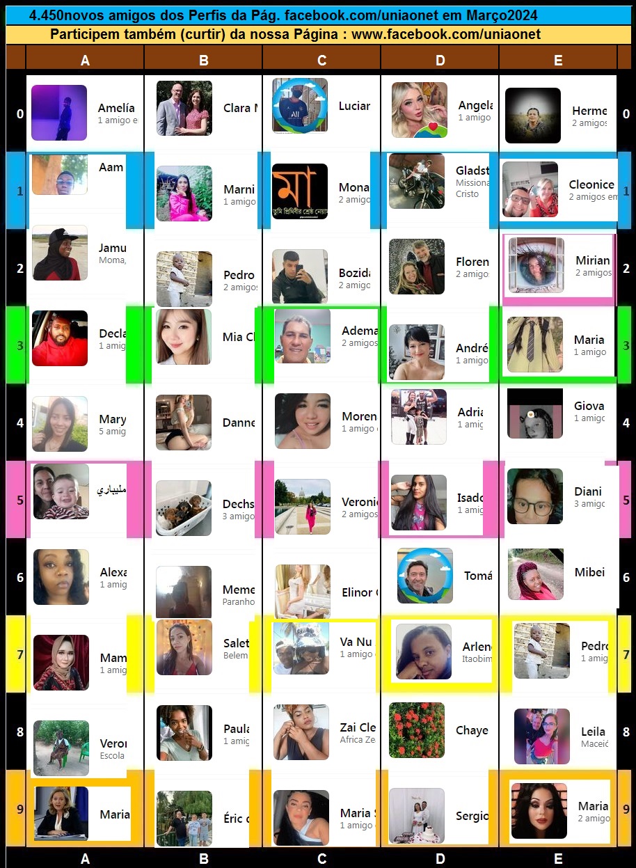 A0 Candela Herrera A1 Dá Silva Glória A2 ?? alvorecer A3 Dorcas D Março A4 Luciana Schroder A5 Wanonkou Klaindje Tôgbô A6 Analú Gomes A7 Lene Malaquias A8 Mariellen Coutinho A9 Pari Khan B0 Amanda Oliveira B1 Sadi Cn B2 Faith Okpara B3 Wilson Almeida B4 Ieq Quintana B5 Pierskalla Onna Penelope B6 Angell Pelúcia B7 Barbara Sanchez B8 Luciene Ramos B9 Pra Vera Rapcinski C0 Marcia Porto C1 Maly Malaia Santiago C2 Yara Sul Africana C3 ? khmer - ter uma vida difícil C4 Sousa Sousa Tel C5 Tina Encinas C6 Abu Layuaprianarifzikriazriumar Bin Imran p9- C7 Suza Moura C8 Izabella Cristine C9 Zelma Almeida Fenti D0 Maria Waldete Souza D1 Pedrinha Philippi D2 Francione Medeiros p6- D3 Cendy Daniela Mallque Vilca D4 Cef Southbay Chapter D5 Sudhir Korosi D6 Cef Akwa Ibom D7 Apen Urabá D8 Pra Paula Martins D9 Min C. Atos E0 Ice-Pirenopolis Pirenópolis E1 Ereoní Rivero Núñez E2 Beria Ribeiro E3 Wilson Almeida E4 Ntha Mokoenanyane E5 Cris Carvalho E6 Margarete Da Rosa E7 ? Shinichi Ueda E8 Aldrex Baliguat Marata E9 Helbert Imbuzeiro amg2023jun3900