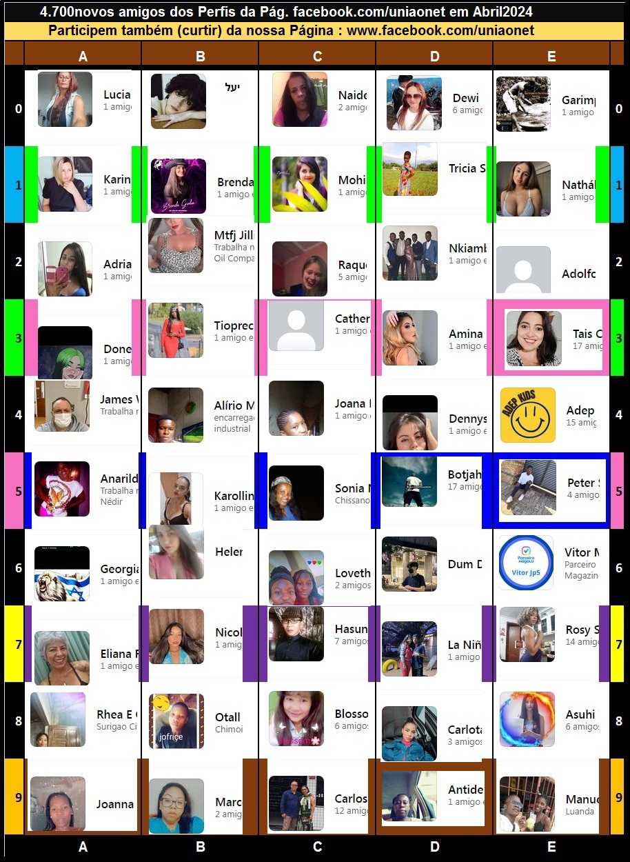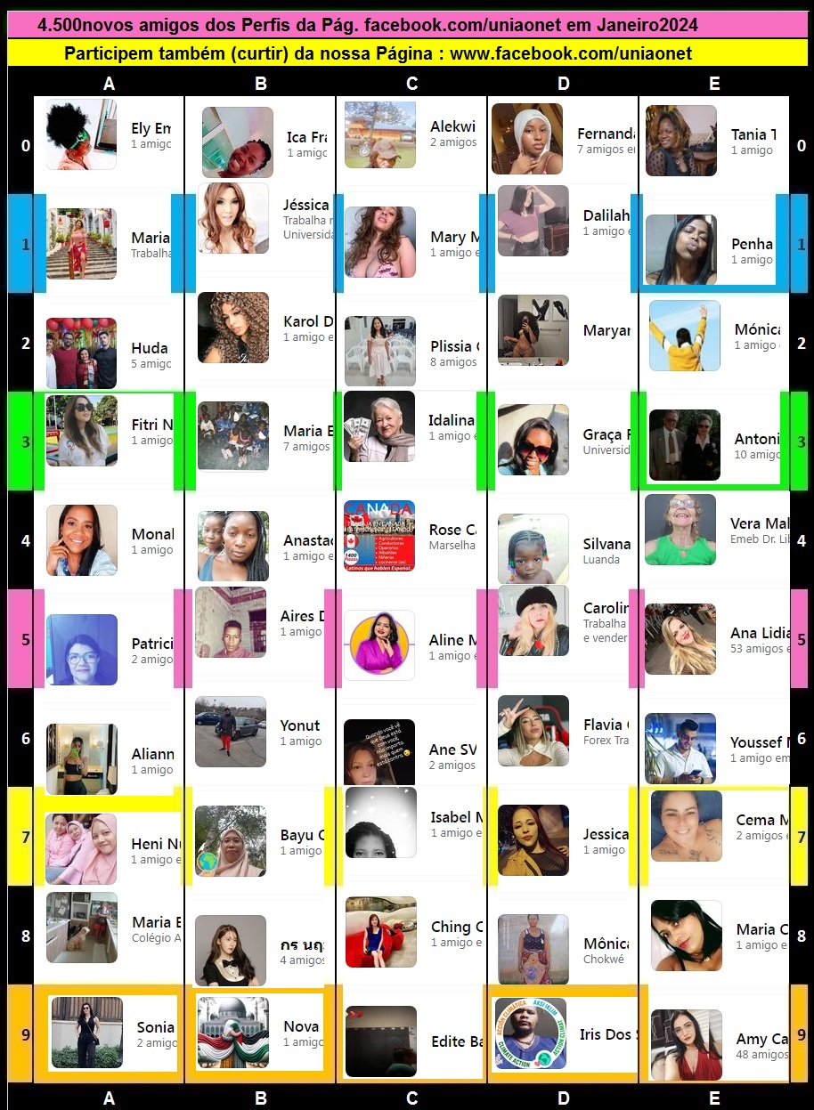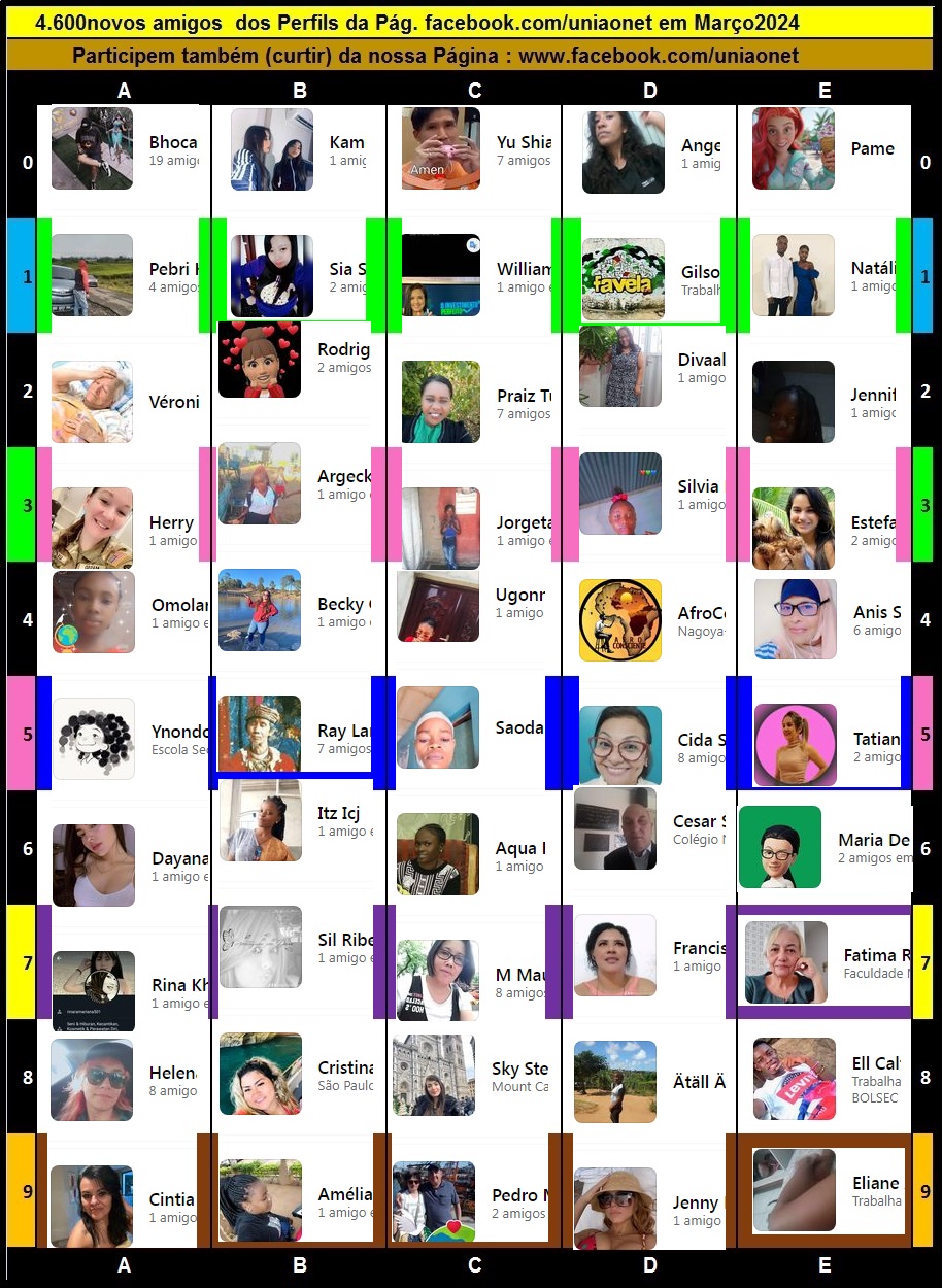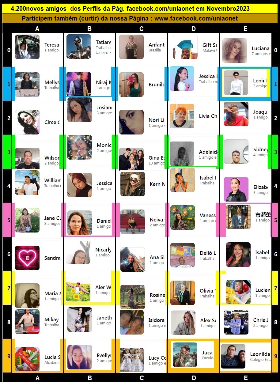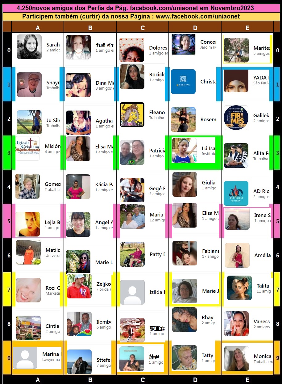 A0 Candela Herrera A1 Dá Silva Glória A2 ?? alvorecer A3 Dorcas D Março A4 Luciana Schroder A5 Wanonkou Klaindje Tôgbô A6 Analú Gomes A7 Lene Malaquias A8 Mariellen Coutinho A9 Pari Khan B0 Amanda Oliveira B1 Sadi Cn B2 Faith Okpara B3 Wilson Almeida B4 Ieq Quintana B5 Pierskalla Onna Penelope B6 Angell Pelúcia B7 Barbara Sanchez B8 Luciene Ramos B9 Pra Vera Rapcinski C0 Marcia Porto C1 Maly Malaia Santiago C2 Yara Sul Africana C3 ? khmer - ter uma vida difícil C4 Sousa Sousa Tel C5 Tina Encinas C6 Abu Layuaprianarifzikriazriumar Bin Imran p9- C7 Suza Moura C8 Izabella Cristine C9 Zelma Almeida Fenti D0 Maria Waldete Souza D1 Pedrinha Philippi D2 Francione Medeiros p6- D3 Cendy Daniela Mallque Vilca D4 Cef Southbay Chapter D5 Sudhir Korosi D6 Cef Akwa Ibom D7 Apen Urabá D8 Pra Paula Martins D9 Min C. Atos E0 Ice-Pirenopolis Pirenópolis E1 Ereoní Rivero Núñez E2 Beria Ribeiro E3 Wilson Almeida E4 Ntha Mokoenanyane E5 Cris Carvalho E6 Margarete Da Rosa E7 ? Shinichi Ueda E8 Aldrex Baliguat Marata E9 Helbert Imbuzeiro amg2023jun3900
