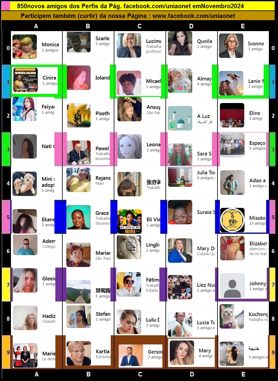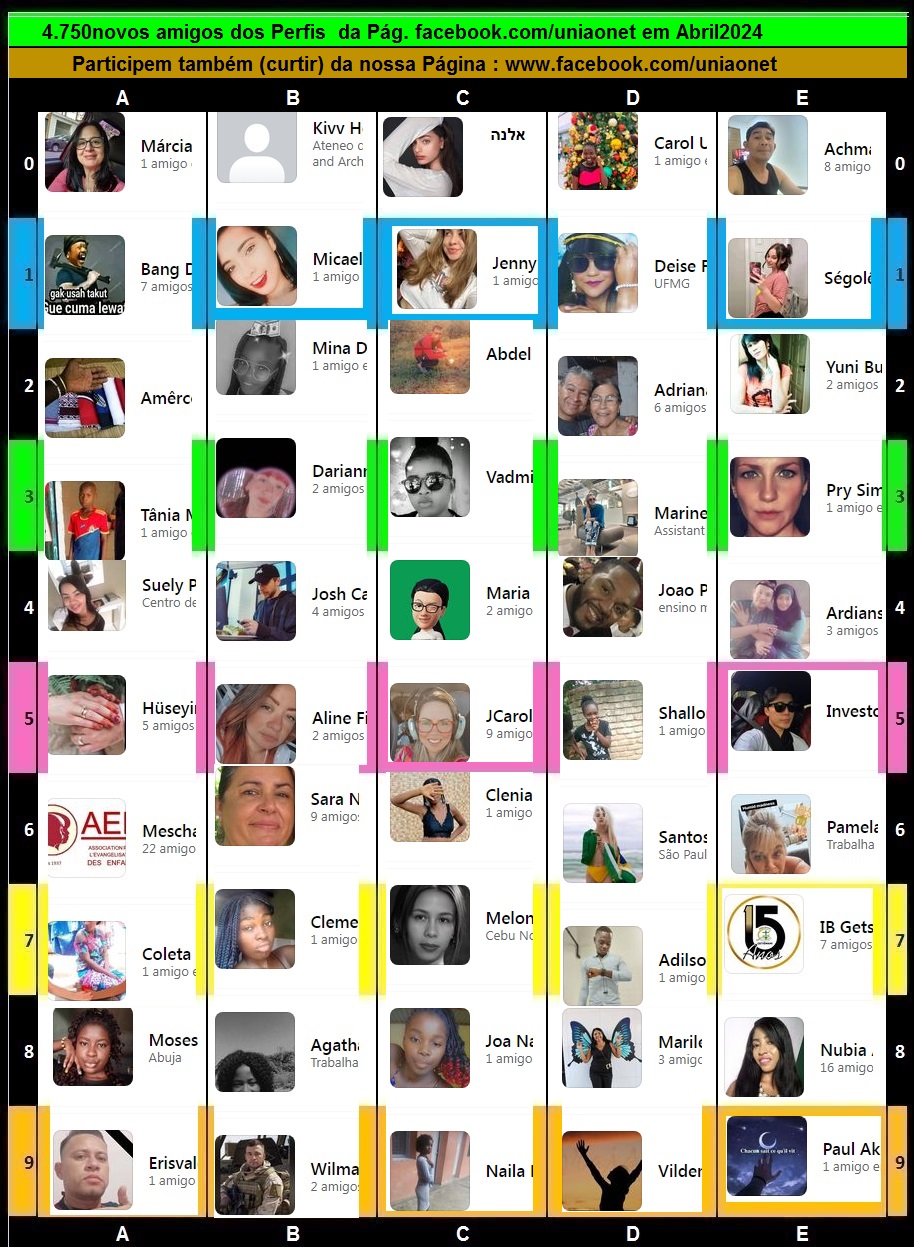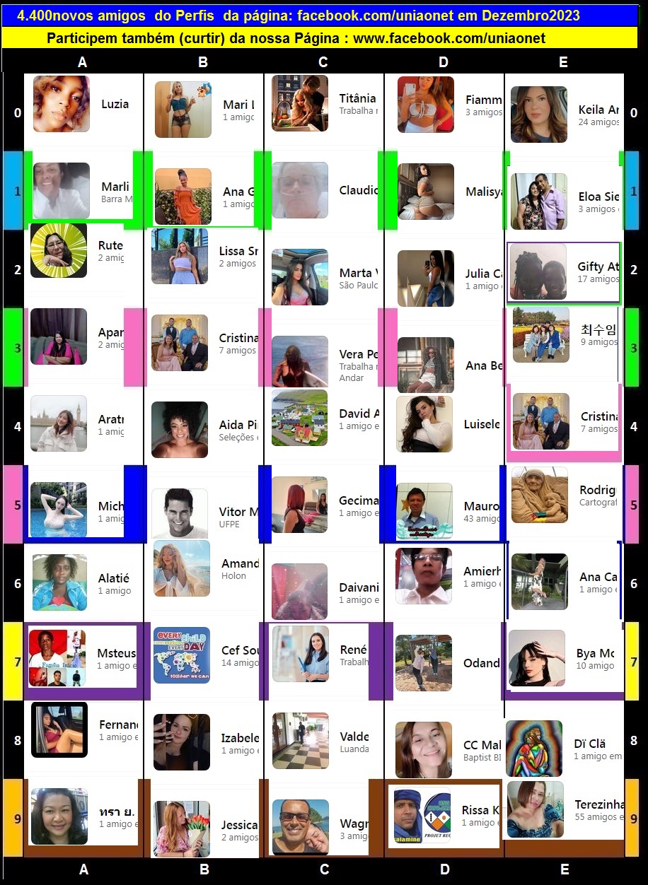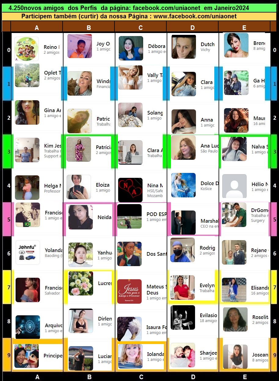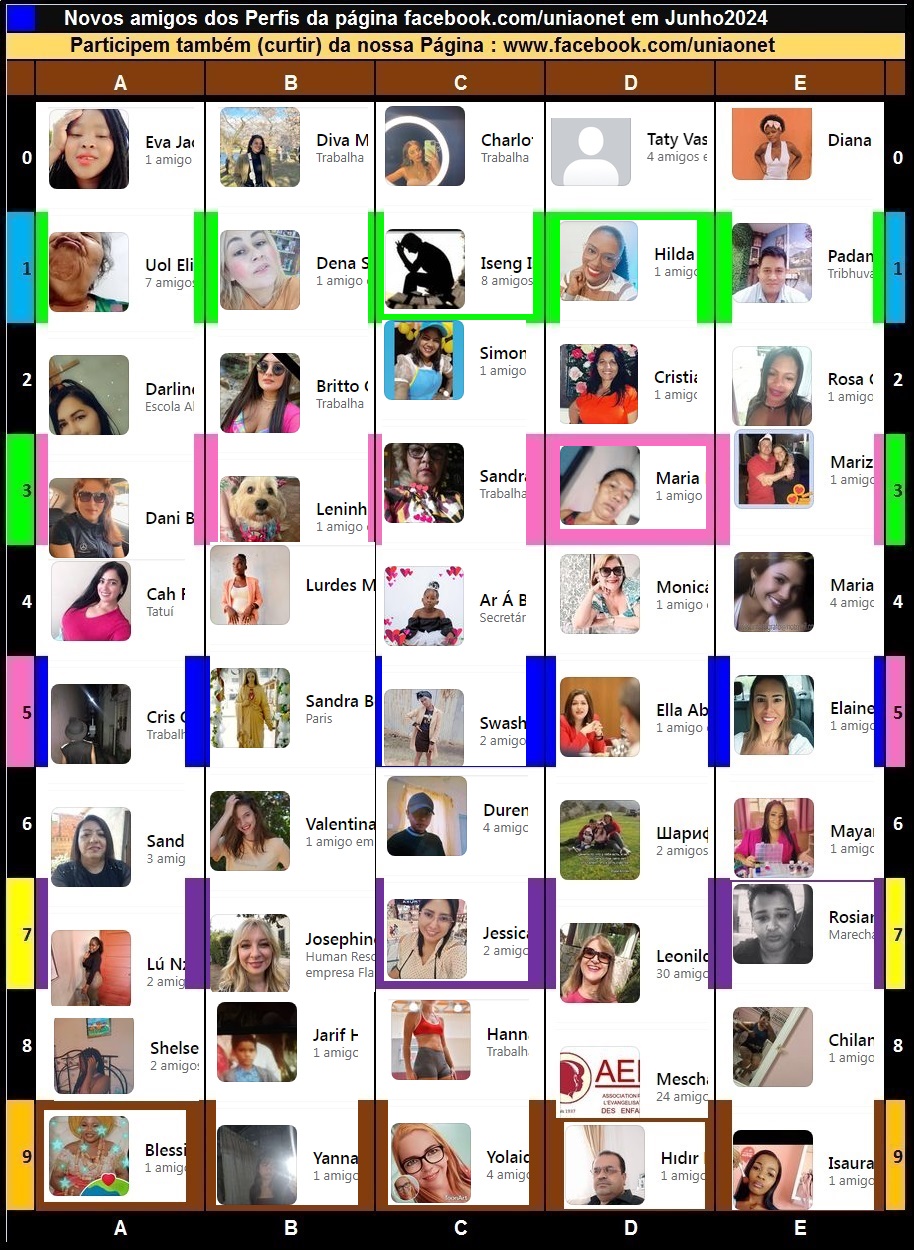 A0 Candela Herrera A1 Dá Silva Glória A2 ?? alvorecer A3 Dorcas D Março A4 Luciana Schroder A5 Wanonkou Klaindje Tôgbô A6 Analú Gomes A7 Lene Malaquias A8 Mariellen Coutinho A9 Pari Khan B0 Amanda Oliveira B1 Sadi Cn B2 Faith Okpara B3 Wilson Almeida B4 Ieq Quintana B5 Pierskalla Onna Penelope B6 Angell Pelúcia B7 Barbara Sanchez B8 Luciene Ramos B9 Pra Vera Rapcinski C0 Marcia Porto C1 Maly Malaia Santiago C2 Yara Sul Africana C3 ? khmer - ter uma vida difícil C4 Sousa Sousa Tel C5 Tina Encinas C6 Abu Layuaprianarifzikriazriumar Bin Imran p9- C7 Suza Moura C8 Izabella Cristine C9 Zelma Almeida Fenti D0 Maria Waldete Souza D1 Pedrinha Philippi D2 Francione Medeiros p6- D3 Cendy Daniela Mallque Vilca D4 Cef Southbay Chapter D5 Sudhir Korosi D6 Cef Akwa Ibom D7 Apen Urabá D8 Pra Paula Martins D9 Min C. Atos E0 Ice-Pirenopolis Pirenópolis E1 Ereoní Rivero Núñez E2 Beria Ribeiro E3 Wilson Almeida E4 Ntha Mokoenanyane E5 Cris Carvalho E6 Margarete Da Rosa E7 ? Shinichi Ueda E8 Aldrex Baliguat Marata E9 Helbert Imbuzeiro amg2023jun3900