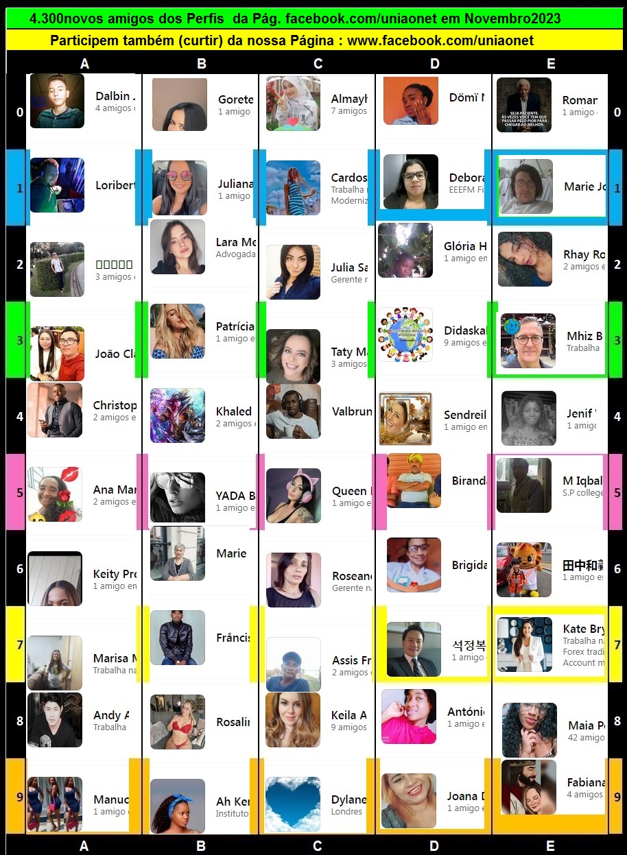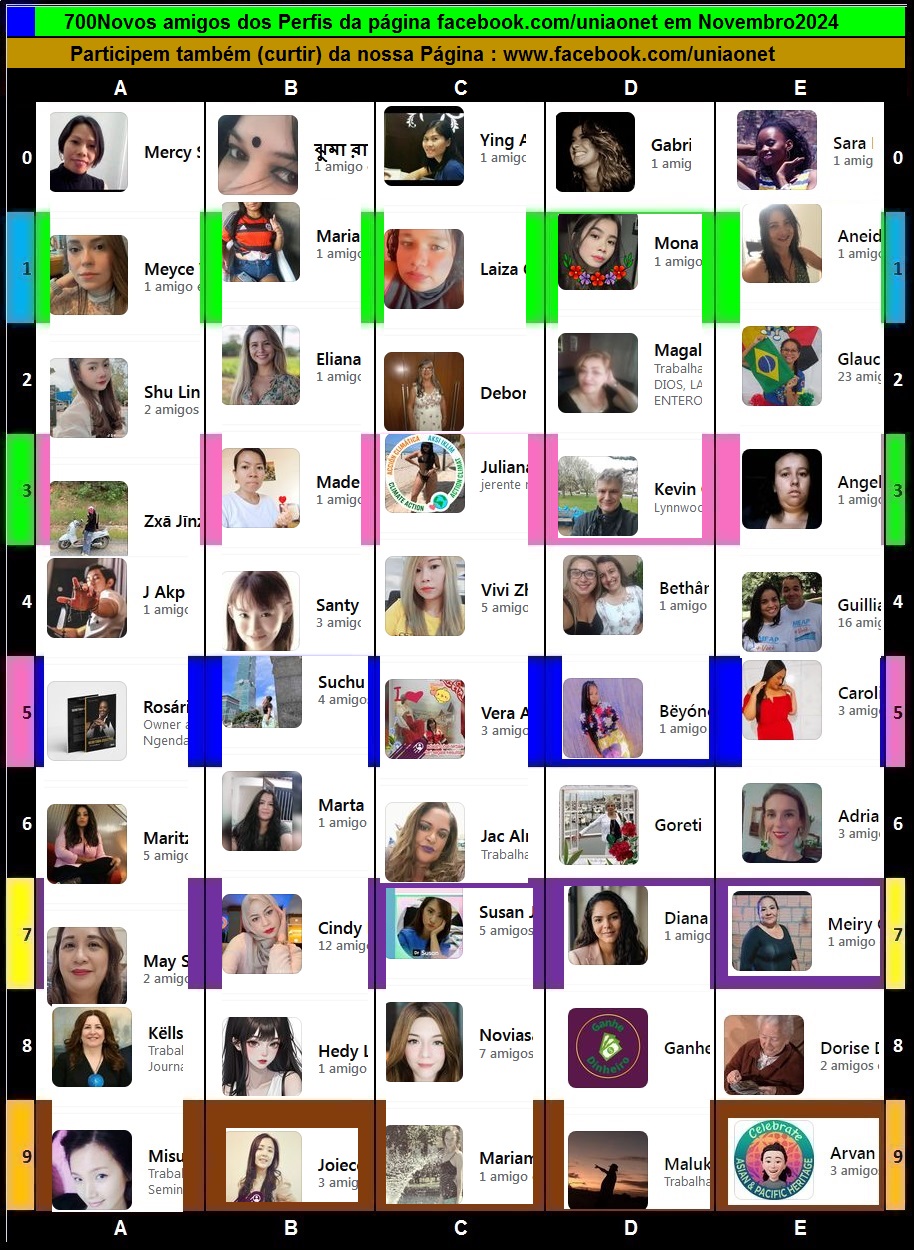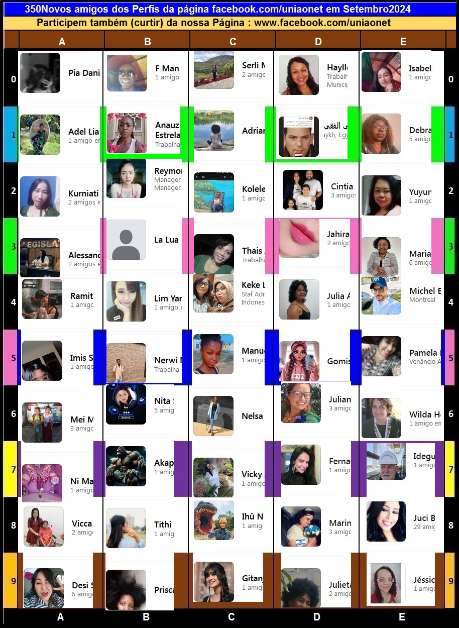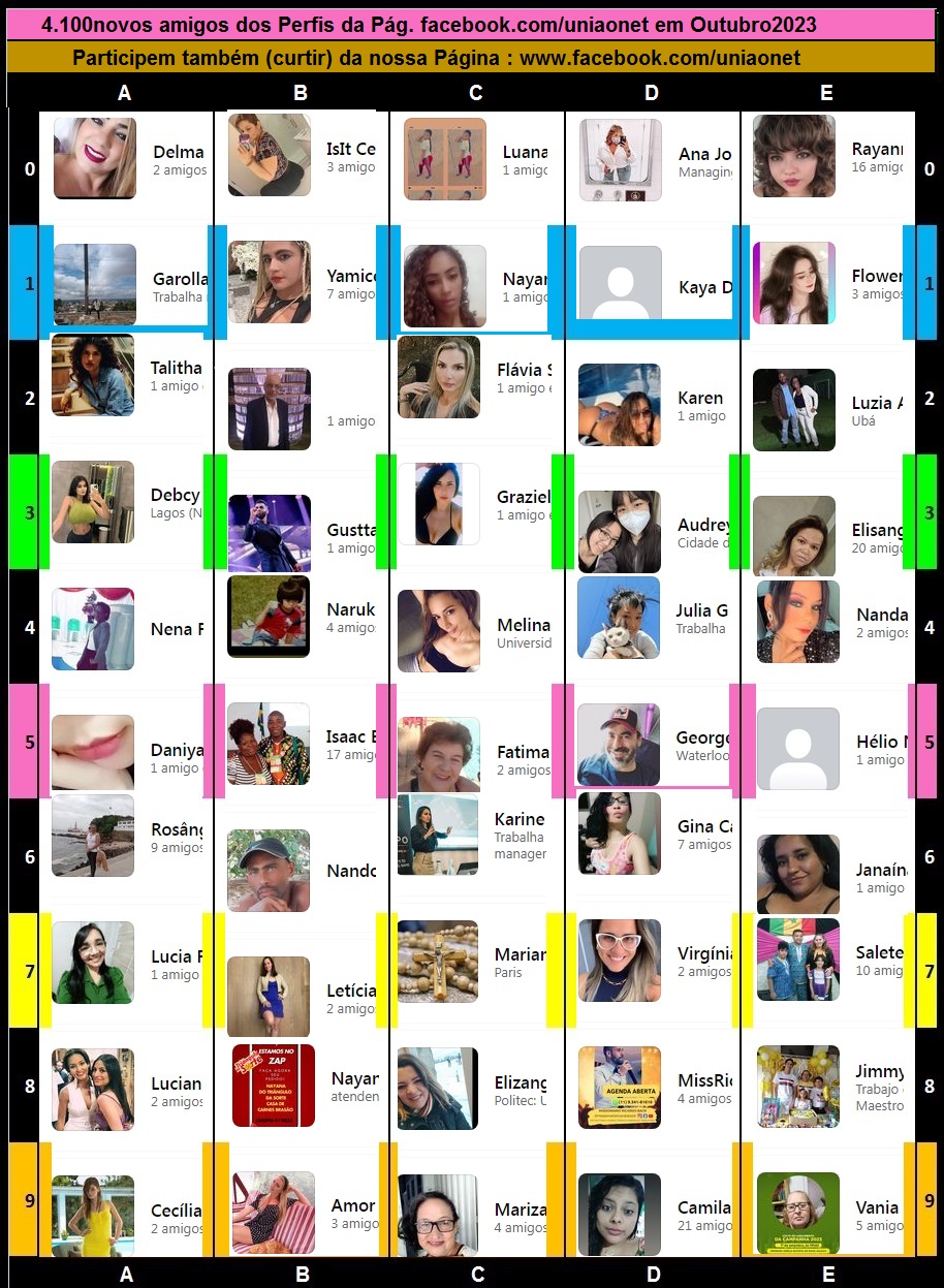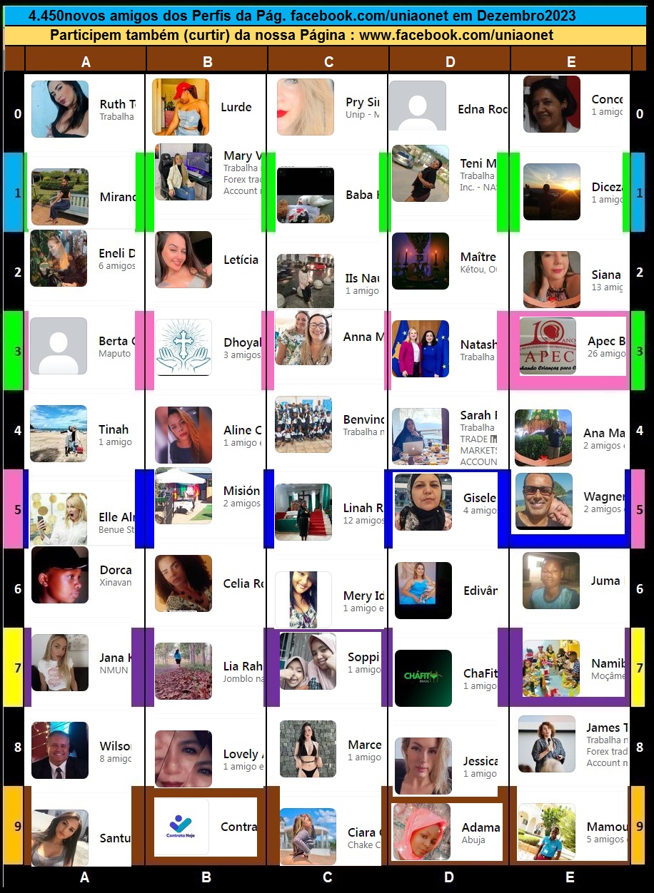 A0 Candela Herrera A1 Dá Silva Glória A2 ?? alvorecer A3 Dorcas D Março A4 Luciana Schroder A5 Wanonkou Klaindje Tôgbô A6 Analú Gomes A7 Lene Malaquias A8 Mariellen Coutinho A9 Pari Khan B0 Amanda Oliveira B1 Sadi Cn B2 Faith Okpara B3 Wilson Almeida B4 Ieq Quintana B5 Pierskalla Onna Penelope B6 Angell Pelúcia B7 Barbara Sanchez B8 Luciene Ramos B9 Pra Vera Rapcinski C0 Marcia Porto C1 Maly Malaia Santiago C2 Yara Sul Africana C3 ? khmer - ter uma vida difícil C4 Sousa Sousa Tel C5 Tina Encinas C6 Abu Layuaprianarifzikriazriumar Bin Imran p9- C7 Suza Moura C8 Izabella Cristine C9 Zelma Almeida Fenti D0 Maria Waldete Souza D1 Pedrinha Philippi D2 Francione Medeiros p6- D3 Cendy Daniela Mallque Vilca D4 Cef Southbay Chapter D5 Sudhir Korosi D6 Cef Akwa Ibom D7 Apen Urabá D8 Pra Paula Martins D9 Min C. Atos E0 Ice-Pirenopolis Pirenópolis E1 Ereoní Rivero Núñez E2 Beria Ribeiro E3 Wilson Almeida E4 Ntha Mokoenanyane E5 Cris Carvalho E6 Margarete Da Rosa E7 ? Shinichi Ueda E8 Aldrex Baliguat Marata E9 Helbert Imbuzeiro amg2023jun3900