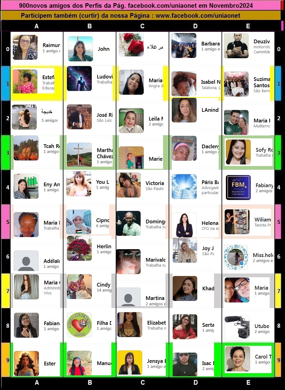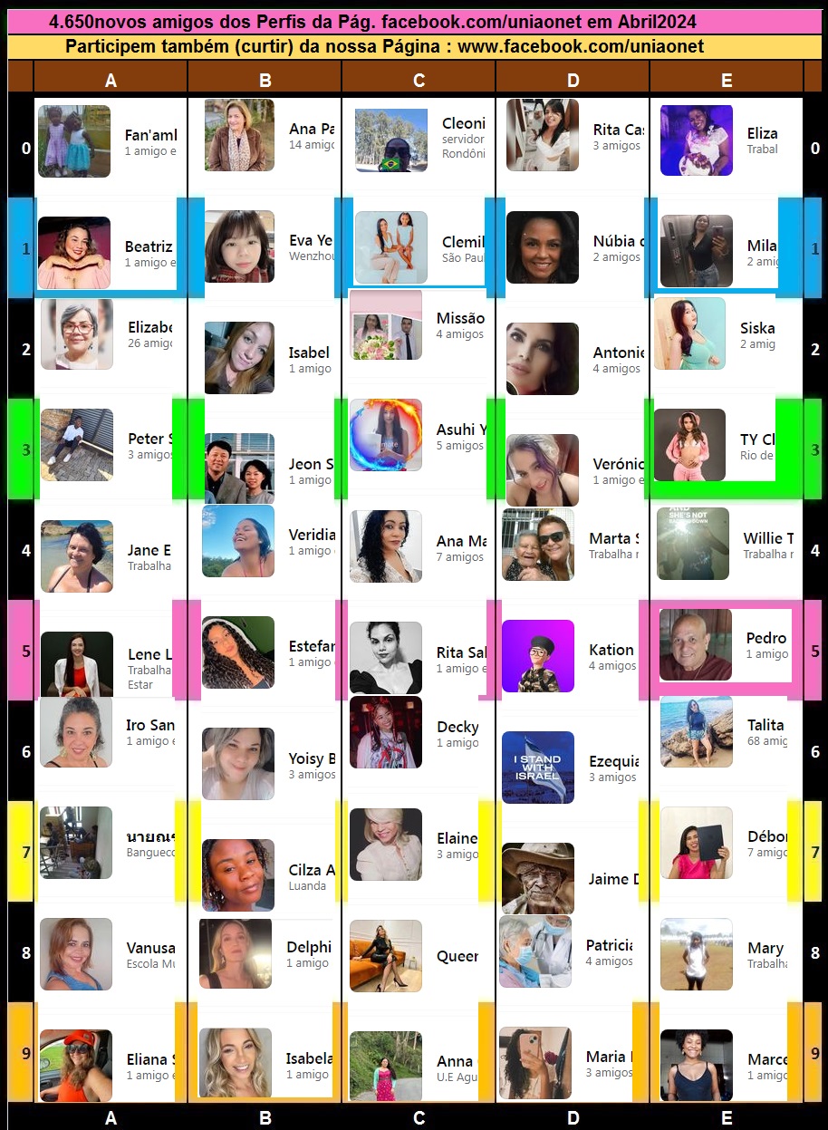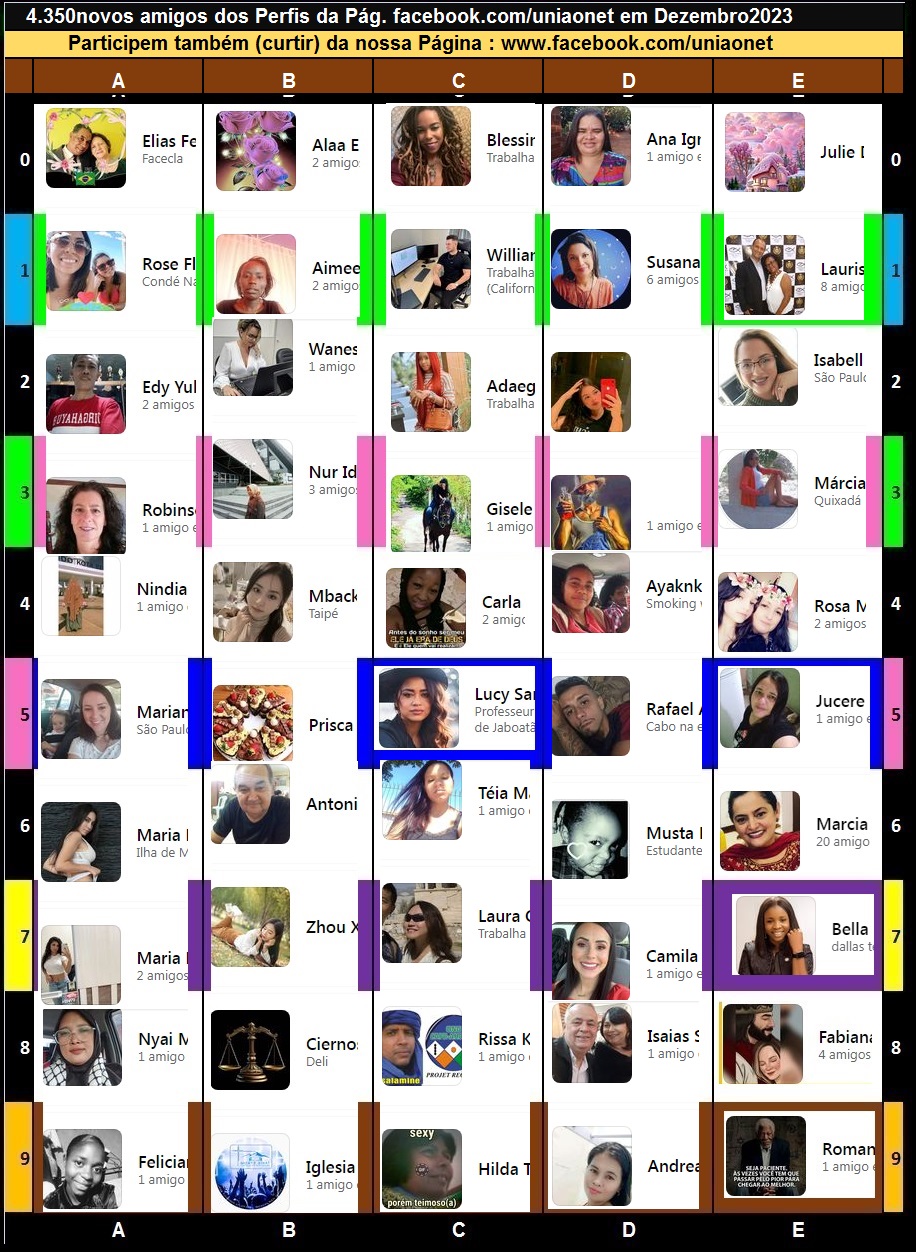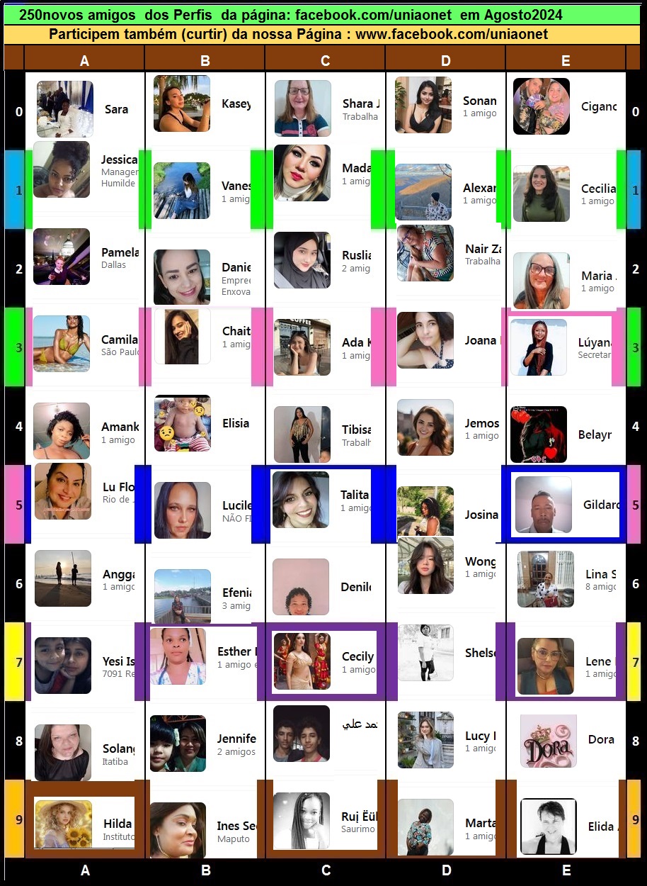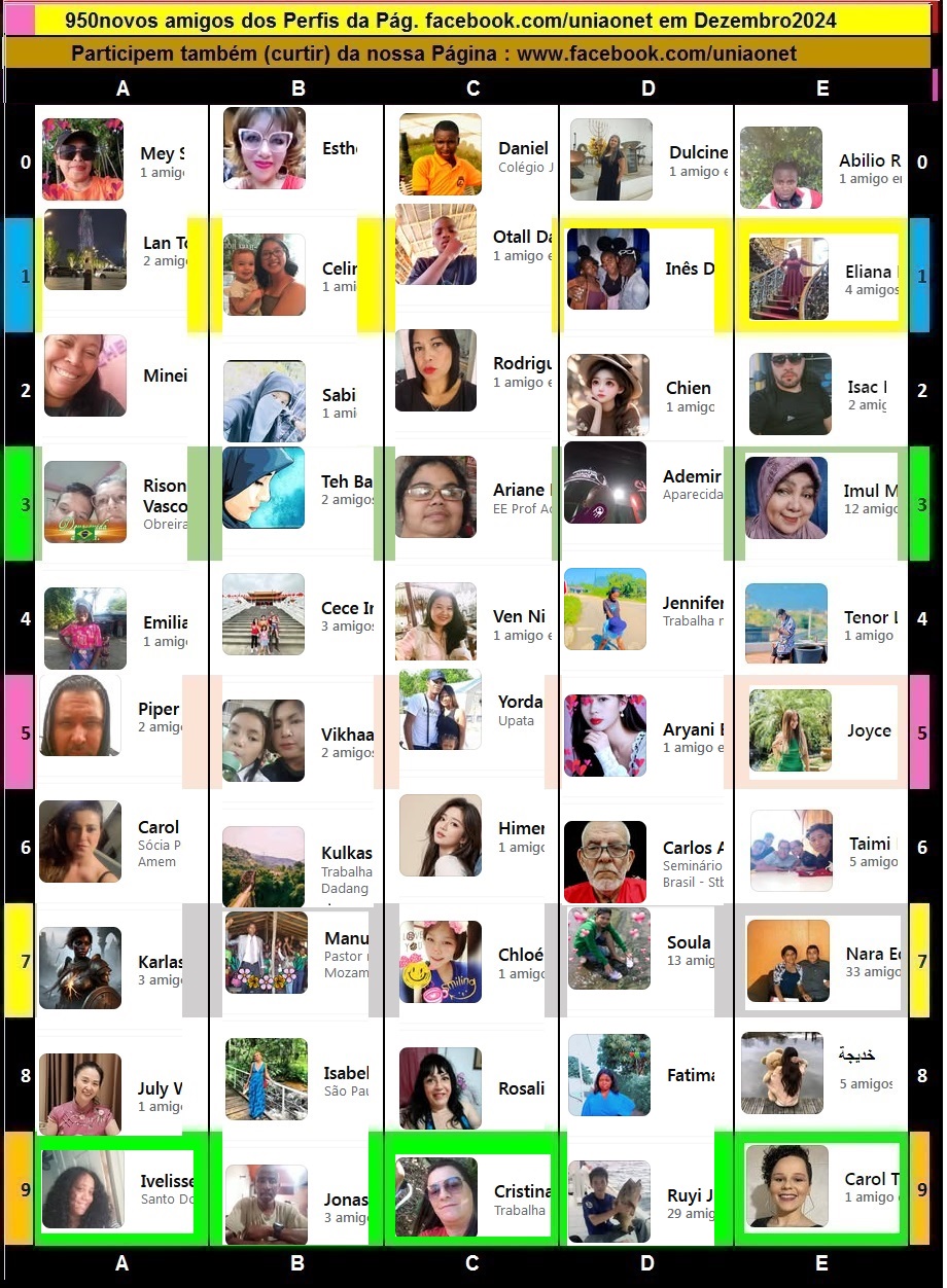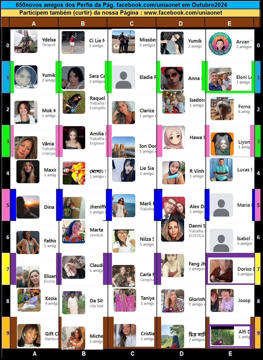 A0 Candela Herrera A1 Dá Silva Glória A2 ?? alvorecer A3 Dorcas D Março A4 Luciana Schroder A5 Wanonkou Klaindje Tôgbô A6 Analú Gomes A7 Lene Malaquias A8 Mariellen Coutinho A9 Pari Khan B0 Amanda Oliveira B1 Sadi Cn B2 Faith Okpara B3 Wilson Almeida B4 Ieq Quintana B5 Pierskalla Onna Penelope B6 Angell Pelúcia B7 Barbara Sanchez B8 Luciene Ramos B9 Pra Vera Rapcinski C0 Marcia Porto C1 Maly Malaia Santiago C2 Yara Sul Africana C3 ? khmer - ter uma vida difícil C4 Sousa Sousa Tel C5 Tina Encinas C6 Abu Layuaprianarifzikriazriumar Bin Imran p9- C7 Suza Moura C8 Izabella Cristine C9 Zelma Almeida Fenti D0 Maria Waldete Souza D1 Pedrinha Philippi D2 Francione Medeiros p6- D3 Cendy Daniela Mallque Vilca D4 Cef Southbay Chapter D5 Sudhir Korosi D6 Cef Akwa Ibom D7 Apen Urabá D8 Pra Paula Martins D9 Min C. Atos E0 Ice-Pirenopolis Pirenópolis E1 Ereoní Rivero Núñez E2 Beria Ribeiro E3 Wilson Almeida E4 Ntha Mokoenanyane E5 Cris Carvalho E6 Margarete Da Rosa E7 ? Shinichi Ueda E8 Aldrex Baliguat Marata E9 Helbert Imbuzeiro amg2023jun3900