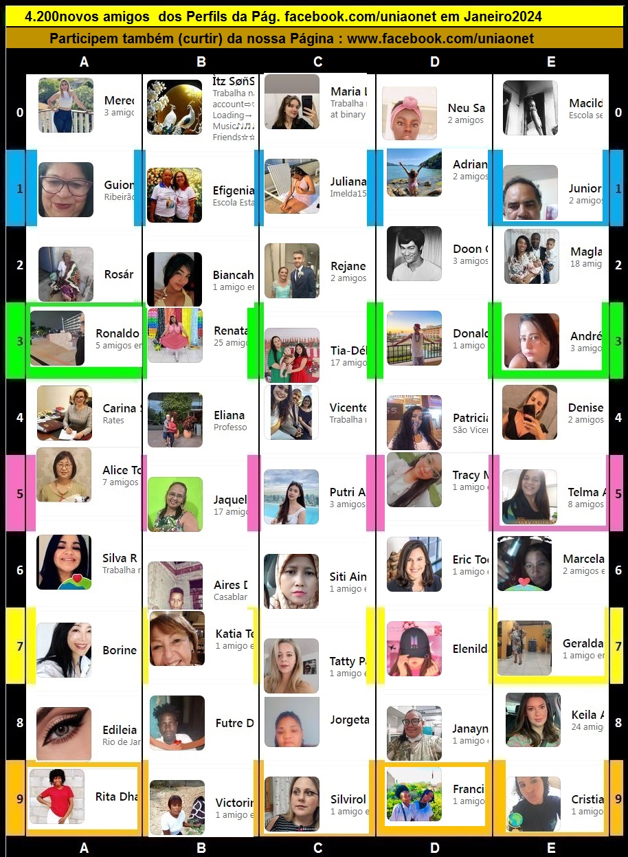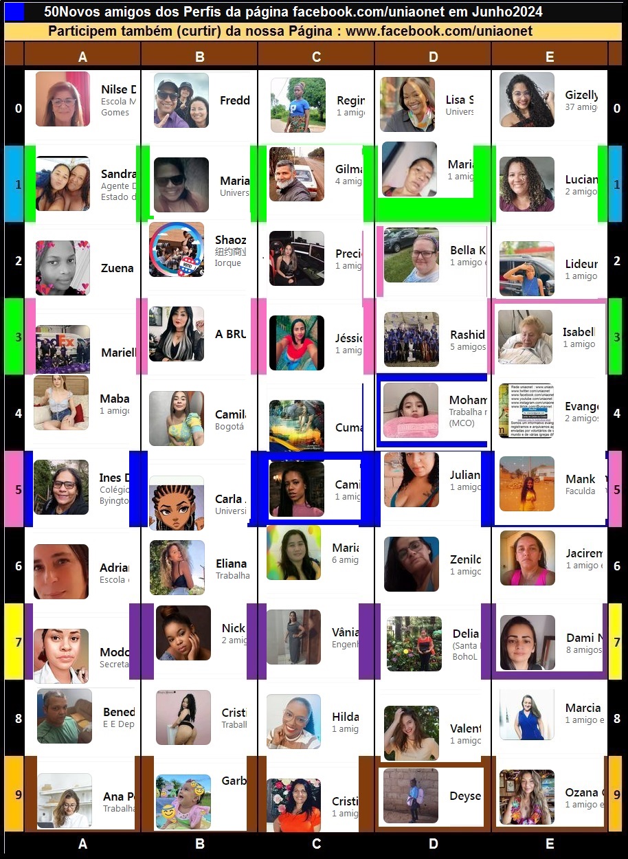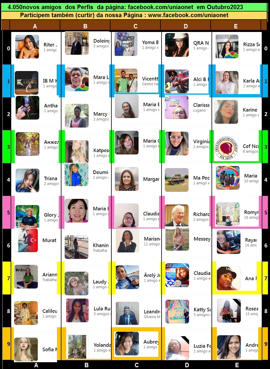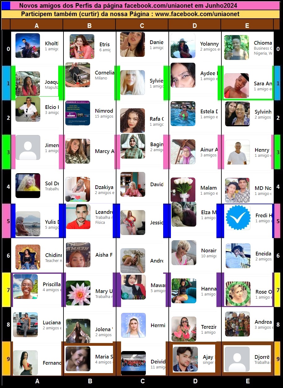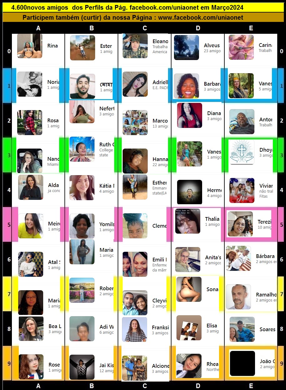 A0 Candela Herrera A1 Dá Silva Glória A2 ?? alvorecer A3 Dorcas D Março A4 Luciana Schroder A5 Wanonkou Klaindje Tôgbô A6 Analú Gomes A7 Lene Malaquias A8 Mariellen Coutinho A9 Pari Khan B0 Amanda Oliveira B1 Sadi Cn B2 Faith Okpara B3 Wilson Almeida B4 Ieq Quintana B5 Pierskalla Onna Penelope B6 Angell Pelúcia B7 Barbara Sanchez B8 Luciene Ramos B9 Pra Vera Rapcinski C0 Marcia Porto C1 Maly Malaia Santiago C2 Yara Sul Africana C3 ? khmer - ter uma vida difícil C4 Sousa Sousa Tel C5 Tina Encinas C6 Abu Layuaprianarifzikriazriumar Bin Imran p9- C7 Suza Moura C8 Izabella Cristine C9 Zelma Almeida Fenti D0 Maria Waldete Souza D1 Pedrinha Philippi D2 Francione Medeiros p6- D3 Cendy Daniela Mallque Vilca D4 Cef Southbay Chapter D5 Sudhir Korosi D6 Cef Akwa Ibom D7 Apen Urabá D8 Pra Paula Martins D9 Min C. Atos E0 Ice-Pirenopolis Pirenópolis E1 Ereoní Rivero Núñez E2 Beria Ribeiro E3 Wilson Almeida E4 Ntha Mokoenanyane E5 Cris Carvalho E6 Margarete Da Rosa E7 ? Shinichi Ueda E8 Aldrex Baliguat Marata E9 Helbert Imbuzeiro amg2023jun3900