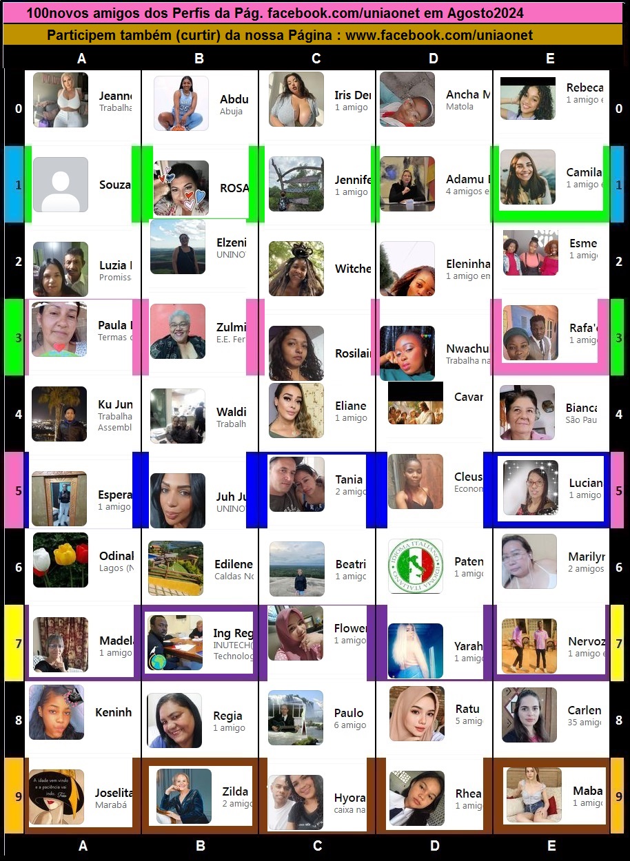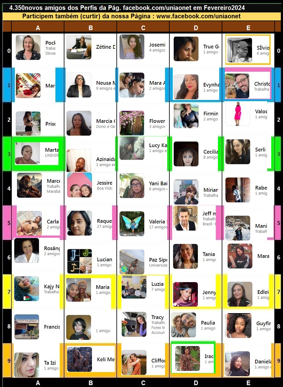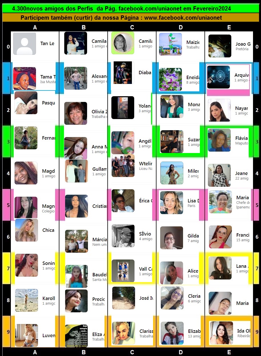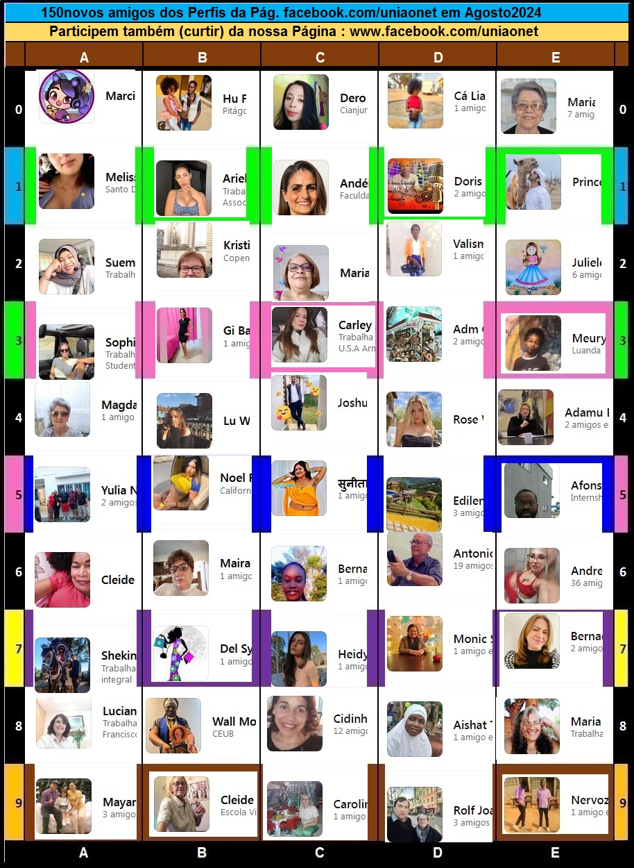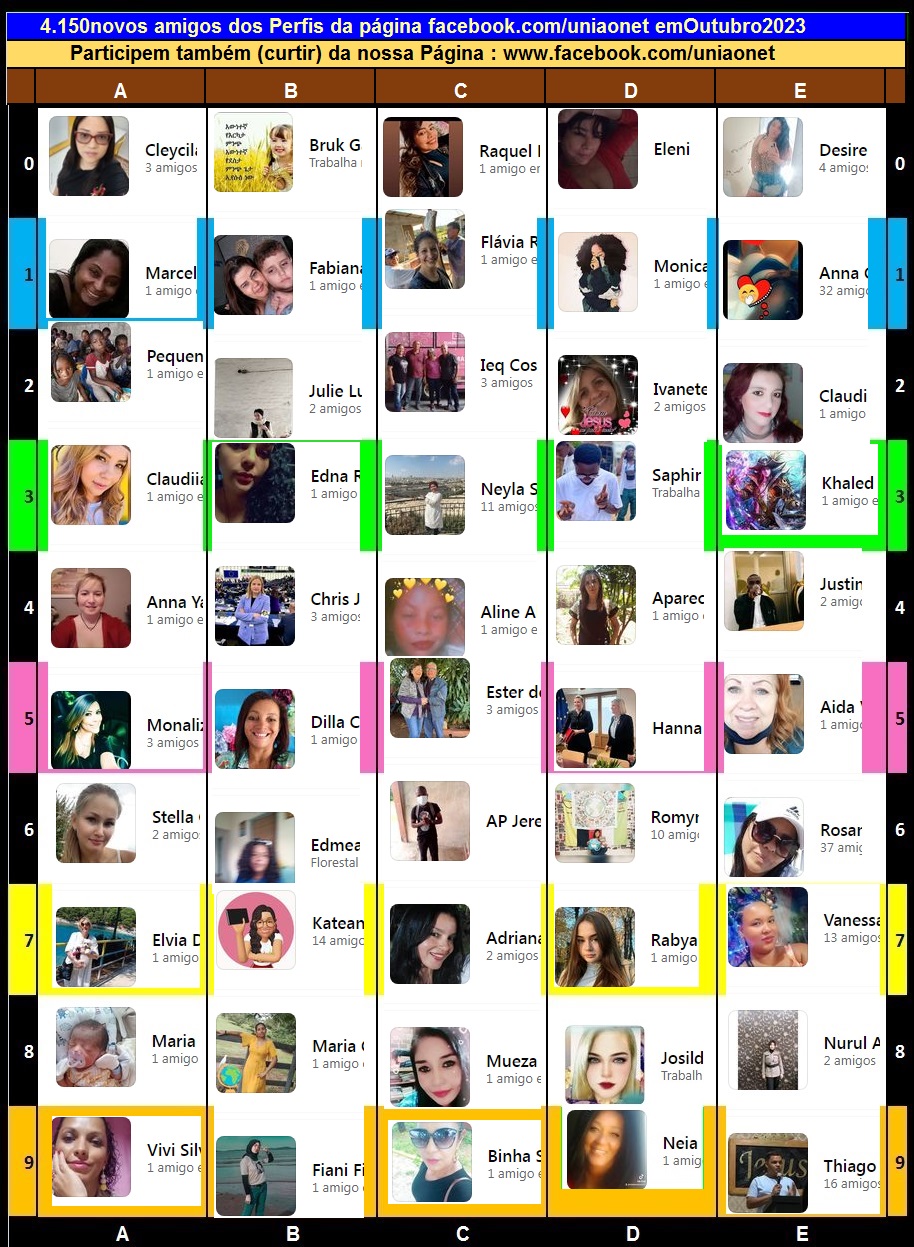 A0 Candela Herrera A1 Dá Silva Glória A2 ?? alvorecer A3 Dorcas D Março A4 Luciana Schroder A5 Wanonkou Klaindje Tôgbô A6 Analú Gomes A7 Lene Malaquias A8 Mariellen Coutinho A9 Pari Khan B0 Amanda Oliveira B1 Sadi Cn B2 Faith Okpara B3 Wilson Almeida B4 Ieq Quintana B5 Pierskalla Onna Penelope B6 Angell Pelúcia B7 Barbara Sanchez B8 Luciene Ramos B9 Pra Vera Rapcinski C0 Marcia Porto C1 Maly Malaia Santiago C2 Yara Sul Africana C3 ? khmer - ter uma vida difícil C4 Sousa Sousa Tel C5 Tina Encinas C6 Abu Layuaprianarifzikriazriumar Bin Imran p9- C7 Suza Moura C8 Izabella Cristine C9 Zelma Almeida Fenti D0 Maria Waldete Souza D1 Pedrinha Philippi D2 Francione Medeiros p6- D3 Cendy Daniela Mallque Vilca D4 Cef Southbay Chapter D5 Sudhir Korosi D6 Cef Akwa Ibom D7 Apen Urabá D8 Pra Paula Martins D9 Min C. Atos E0 Ice-Pirenopolis Pirenópolis E1 Ereoní Rivero Núñez E2 Beria Ribeiro E3 Wilson Almeida E4 Ntha Mokoenanyane E5 Cris Carvalho E6 Margarete Da Rosa E7 ? Shinichi Ueda E8 Aldrex Baliguat Marata E9 Helbert Imbuzeiro amg2023jun3900