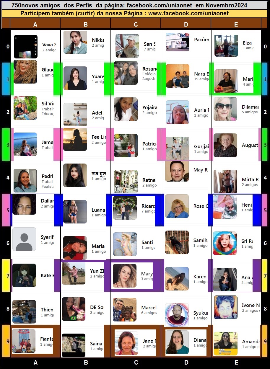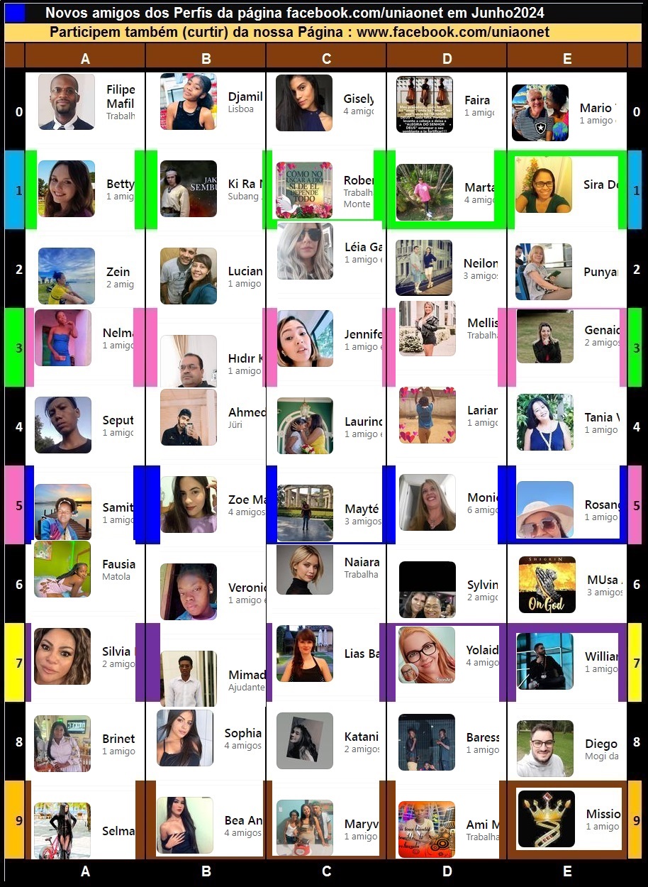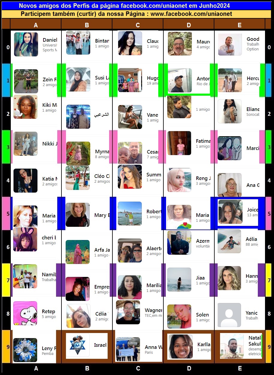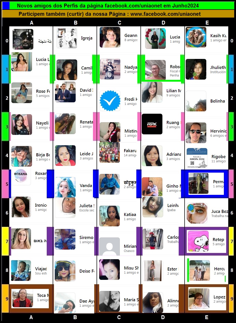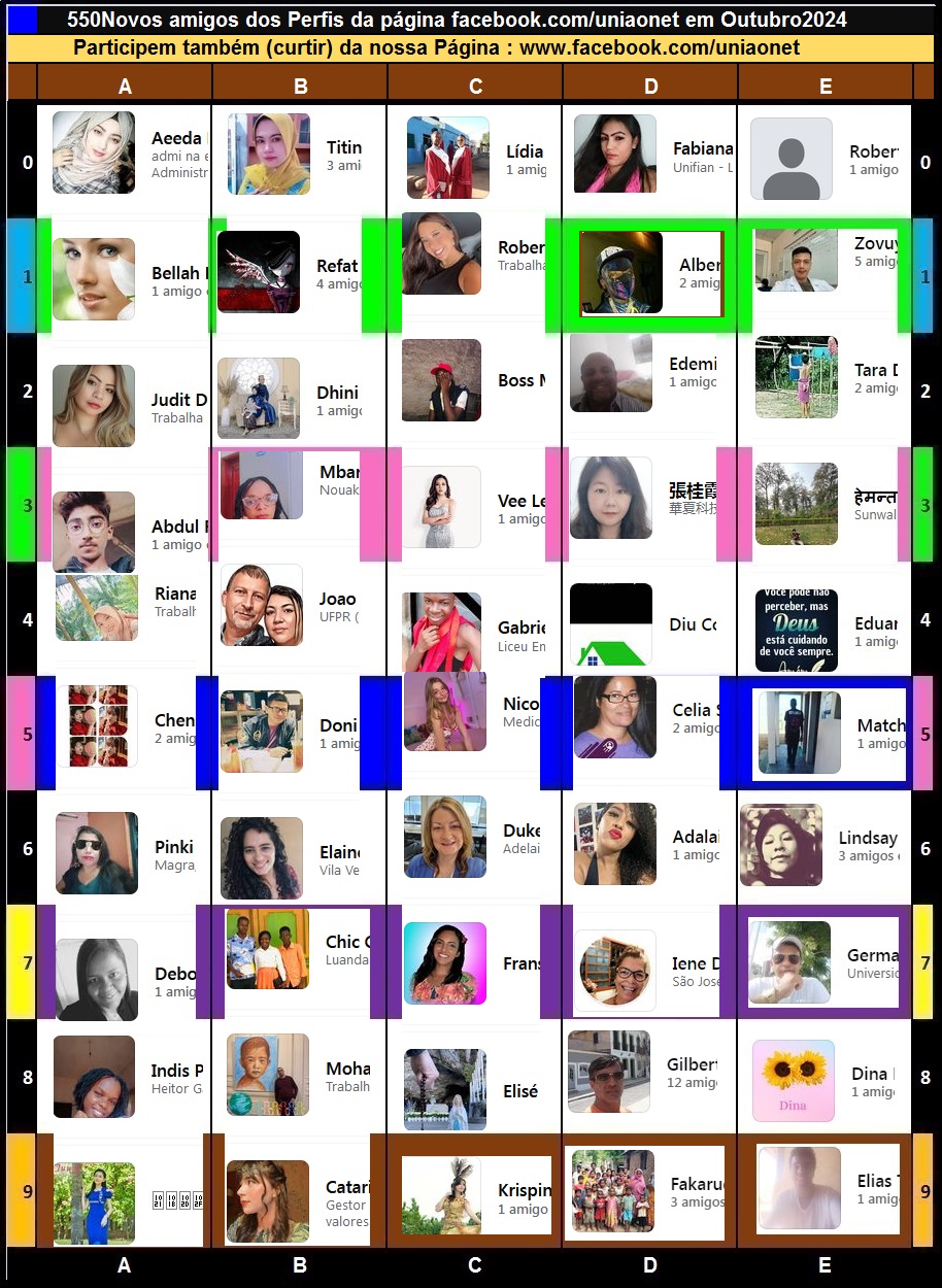 A0 Candela Herrera A1 Dá Silva Glória A2 ?? alvorecer A3 Dorcas D Março A4 Luciana Schroder A5 Wanonkou Klaindje Tôgbô A6 Analú Gomes A7 Lene Malaquias A8 Mariellen Coutinho A9 Pari Khan B0 Amanda Oliveira B1 Sadi Cn B2 Faith Okpara B3 Wilson Almeida B4 Ieq Quintana B5 Pierskalla Onna Penelope B6 Angell Pelúcia B7 Barbara Sanchez B8 Luciene Ramos B9 Pra Vera Rapcinski C0 Marcia Porto C1 Maly Malaia Santiago C2 Yara Sul Africana C3 ? khmer - ter uma vida difícil C4 Sousa Sousa Tel C5 Tina Encinas C6 Abu Layuaprianarifzikriazriumar Bin Imran p9- C7 Suza Moura C8 Izabella Cristine C9 Zelma Almeida Fenti D0 Maria Waldete Souza D1 Pedrinha Philippi D2 Francione Medeiros p6- D3 Cendy Daniela Mallque Vilca D4 Cef Southbay Chapter D5 Sudhir Korosi D6 Cef Akwa Ibom D7 Apen Urabá D8 Pra Paula Martins D9 Min C. Atos E0 Ice-Pirenopolis Pirenópolis E1 Ereoní Rivero Núñez E2 Beria Ribeiro E3 Wilson Almeida E4 Ntha Mokoenanyane E5 Cris Carvalho E6 Margarete Da Rosa E7 ? Shinichi Ueda E8 Aldrex Baliguat Marata E9 Helbert Imbuzeiro amg2023jun3900