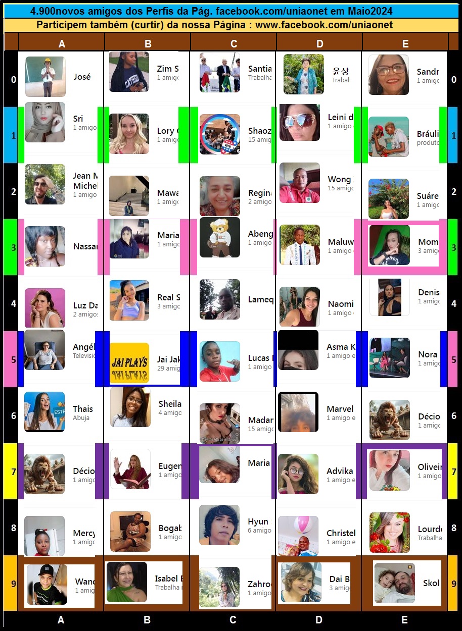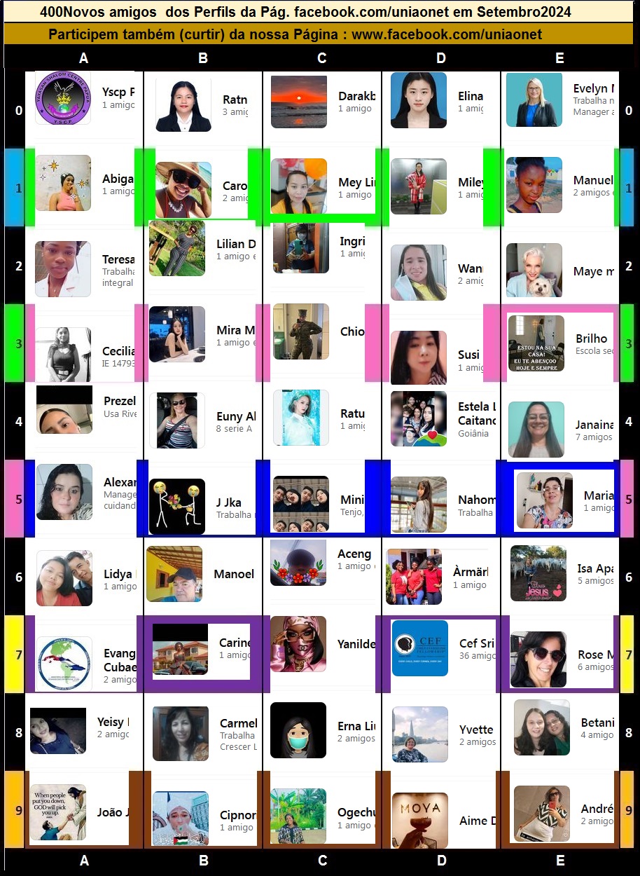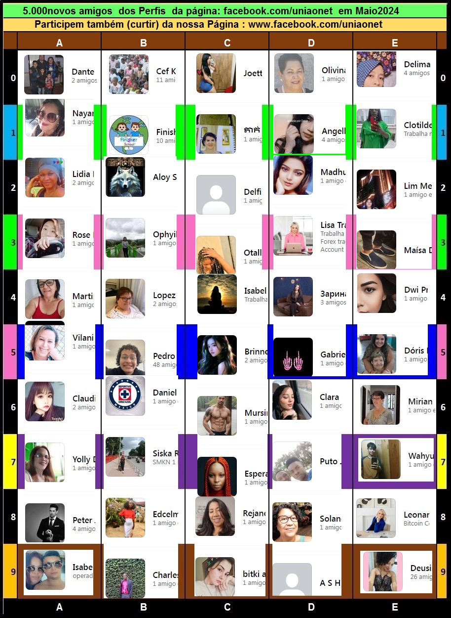 A0 Fátima Paiva A1 DiáconoEdnaldo Lino A2 Andeloy Angofoot A3 Carla Maria A4 Eliane Rodrigues A5 Min Rocha Viva A6 Leila Martins Rodrigues A7 Sabrina Santos A8 Isabel Adriano A9 Dri Sampaio B0 Elisa Mello B1 Valéria Joaquim B2 Marcynho Vidal B3 Geisy Ferreira B4 Armando Qtã B5 Temi Dayo B6 Puji Lestari B7 Eduarda Ingrid Da Silvar Brito Ingrid B8 Verônica Cortez B9 Marjorie Anahi Seminario Crovetto C0 Larry Johnson C1 Luísa Dos Santos Gonçalves Leizinha C2 Catalina Munteanu C3 Tania González C4 Salo Arly Arly C5 Deolinda DC C6 Clarice Brickmann C7 Ao Hanh Dung C8 Silvia Soares C9 Isabel Antonia Fernandes D0 Antoniella Stella D1 Arman Bhocahh Valentino D2 Casade Davi D3 Irineia Novais Dos Santos D4 África Africanos D5 Aline Victorine D6 Xaiane Araujo 6 - D7 Albino Ferreira - Ana D8 Jecyl GEn Pinaandel Ayuman D9 Jesuina Preciosa Ambrósio E0 Josi Salgado E1 Gere AndersonTrust E2 Ana Maria Zalazar E3 Carmem Rodrigues 9 - E4 Andreza Rodrigues Dos Santos E5 ? Ryoko Kudo E6 Ester de Benitez E7 ?Ihsan Al-Naili E8 Nathally Araújo E9 Md Roni amg2023maio3800 ![]() A0 Evana Cunha Ferreira A1 Regiane Fetter Santos A2 Lurdecleni Mechaque A3 Areeya Chaiwong A4 Angelica López A5 Song Thanh A6 Silva Cidinha A7 Sylvinha Boaventura A8 Cintia Guedes Coutinho Feitosa A9 Ana Melo B0 Nilma Barbosa B1 Muhammad Ashraf B2 Leidy Domingas Angolano B3 Dorcas Pentecoste B4 Zhen Xi B5 Levi Rogrigues B6 Adep Kids B7 Emanuele Moura Moura Castro B8 Lucimara Rosa B9 Leninha Fernanda C0 Reginalva Ferreira Solito C1 Wizzy Cbn C2 Prince Mark C3 Daniella Cristina C4 Marcia PT C5 Rita Belorio C6 Marcia Almeida C7 Cristiana Domingos Cris C8 Samara Monique C9 Matusalém Perera D0 Natalia Kyle D1 Marisa Priscila Marineyde D2 Davi Moreira Duarte D3 Nurry Tasya D4 Delgado Yamela D5 Uugantsetseg Boldbaatar D6 Joana Francisco Chivurre D7 Rahmawatie Mha Rahma D8 Julia Rodriguez D9 Heloisa Silva 9 - E0 ? Ryoko Kudo E1 Goresan Sang Pengelana E2 Rosa Cleusa Sandes E3 Helbert Imbuzeiro 6- E4 ? Myunghee Kang E5 Duce Mendes E6 Victor Antonio Francisco Molene E7 Cef Dominica E8 Lucineide Tiago E9 ? Ihsan Al-Naili amg2023maio3850