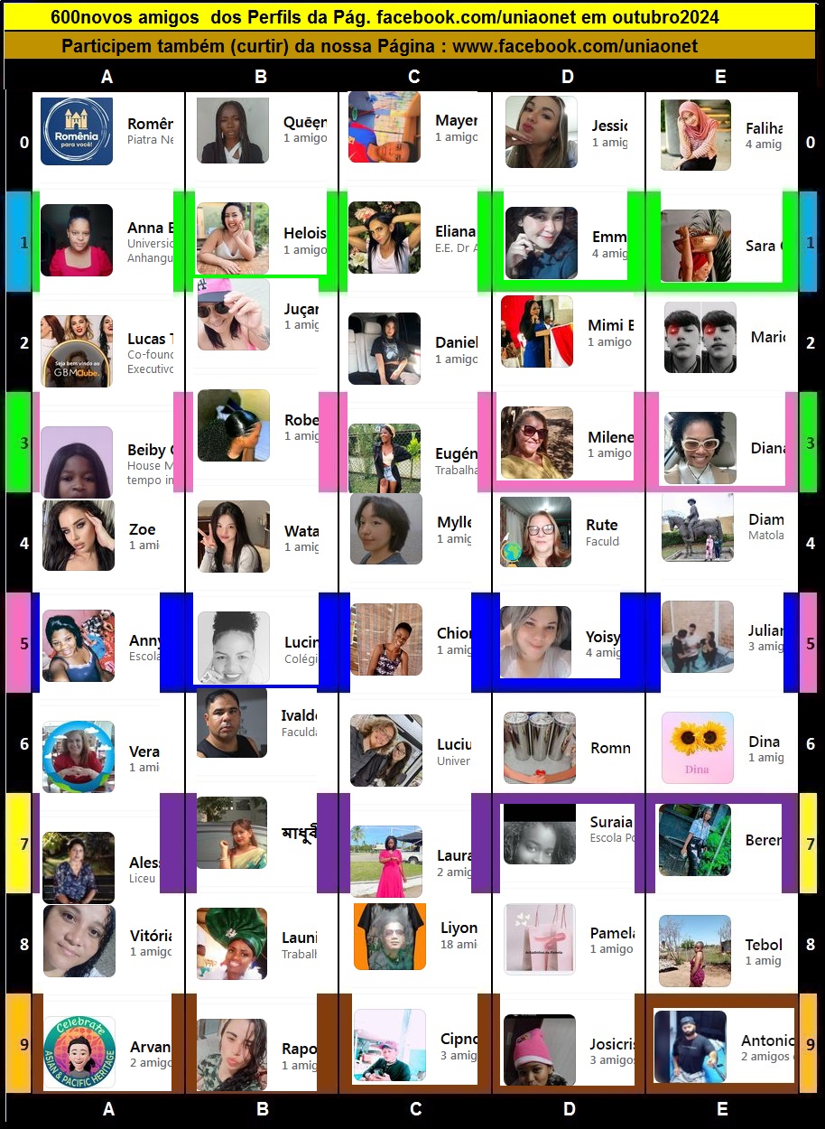 A0 Lilia Mendes A1 Adeliny Simão A2 Ilha Gomes A3 Quang Vanh A4 Basuki Rahmat A5 Paul Albert A6 Dani Xavier A7 Constancia Iucas Matavele A8 Pedro Rodrigo A9 Dulce Charles B0 Rafaela Castro B1 Pamella Rodrigues B2 ErRick BinAssegaf B3 Madalena Ottilia Silva Oliveira B4 Elisa Hernani B5 Ester Cardoso B6 Darci Pereira Barbosa B7 Kazolla Pro Livity B8 Azelainy Catumua Nany B9 Samah NG C0 Natanohj Melo C1 Gey Gey C2 Molinari Silva Missões C3 PraAndrea Antunes Carvalho C4 Flavia Natividade C5 Ipr Jardim-Itália C6 Pib Cascavel C7 Eliane Araújo C8 Lotti Nolika Nolika C9 Eliete Dutra D0 Paulo da Betânia D1 Md Sagor Md Sagor D2 Ana Paula S Ribeiro D3 Thaynã Landin Brito Passos D4 El-Shaday AE D5 Nehal Haider Mãçhï D6 Ana José Anita D7 Marli Silva D8 Silvana Moreira De Queiroz Gomes D9 Caleb Ulzii E0 Izabel Ibo E1 Mari Souza Leite E2 Margarida Bento Bento E3 Prgilson Fontes Cruz E4 Paulina Gonzalez Angela E5 Rayssa RAilda E6 Garyeazon Attiah E7 Helena Laurindo Monteiro Leni E8 Franh Laranjeira E9 Mercês Braz 3amg2022out2650