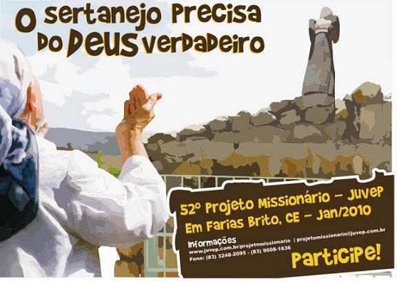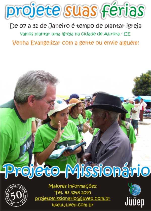 e venha doar tuas férias para o alcance de vidas. Há milhares de vilarejos que ainda não possuem um crente sequer. Vamos mudar esse quadro em mais uma localidade sertaneja no mês de janeiro e você pode fazer parte dessa santa maratona na expansão do Reino do Nosso Senhor Jesus. Inscrições abertas para o 55° Projeto Missionário Jamacaru (distrito de Missão Velha - CE) De 08 a 31 de Julho de 2011. Jamacaru – Distrito de Missão Velha, CE. Situa-se a 546 km da capital do estado, Fortaleza e a 18 km da cidade de Missão Velha. Localizado no alto da serra do Araripe com aproximadamente 800m de altitude tem um clima fresco e agradável nesta época do ano. Apesar dos seus 125 anos não tem mais que 6.000 habitantes, com apenas uma igreja evangélica e menos de 1% de sua população conhece a Cristo. É um lugarejo muito necessitado de mais evangelização. Cremos que uma nova igreja vai ajudar significativamente o crescimento do Povo de Deus na cidade e que o Projeto Missionário será um marco na vida espiritual de todos os seus moradores. Já