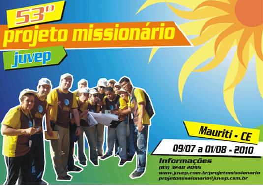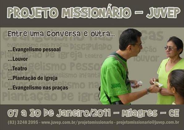 Se desejar posso enviar o kit informativo por e-mail. Para maiores informações escreva para projetomissionario@juvep.com.br Lembre-se de orar para que o Espírito Santo quebrante os corações e os convença da verdade, da justiça e do juízo, amém. Na semana da páscoa acontecerá o Congresso Juvep 2011 em João Pessoa PB. Maiores informações no site. Divulgando o trabalho da Missão Juvep, você poderá despertar futuros missionários! Deus te abençoe. NOVA ASSUNÇÃO . EXÉRCITO DA SALVAÇÃO da Igreja evangélica assembléia de Deus em Nova Assunção Francisco Martins _ 26/09/2003 Saúdo