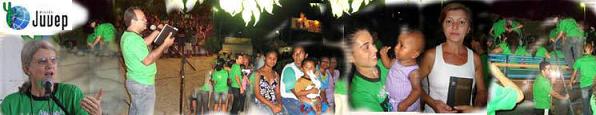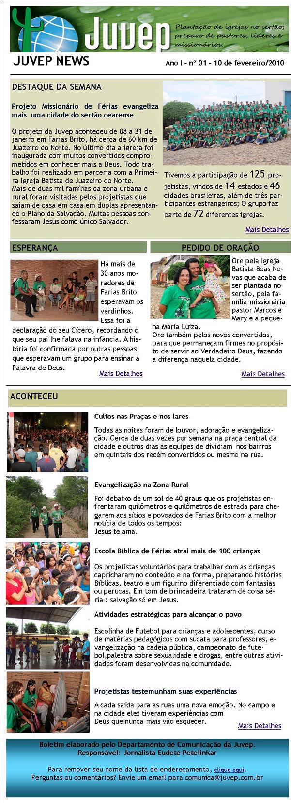 46 cidades, 14 estados do Brasil e 01 país: Alemanha. www.juvep.com.br 1. Apresentação do Filme JesusTotal de expectadores: Aproximadamente 497. 2. Evangelização (zona rural e zona urbana)Total de decididos (cidade/povoado/sítios): 311 Nossa expectativa é que 10% a 15% destes se firmem nos próximos meses. Total de visitas realizadas: 3195; Foram realizados 51 cultos e 09 apresentações do Filme Jesus; Total de pessoas que ouviram o evangelho: Cerca de 8.000. 3. Distribuição de Literatura Evangélica (zona rural e zona urbana)Bíblias: 495; Novos Testamentos: 84; Evangelho de João: 732; Folhetos: 7233 (aproximadamente). 4. Trabalhos com crianças.Foi realizado trabalho evangelístico com crianças, num período de 5 dias, com a presença de cerca de 428 5. Povoados e Sítios alcançados.Catirina, Pe. Cícero, Rosário, Café da Linha, Passagem de Pedra, Carneiro, Fronteiro, Gameleira, Genipapeiro, Junco, Nazaré, São Felix, Varjota, Valdivino, Veneza. 6. Ação SocialRealizamos atendimento médico no sítio Fronteiro, palestras sobre auto-medicação, forma correta de escovação e prevenção contra a cárie. Houve cortes de cabelo, escova, alongamento. Ainda foram realizadas palestras para 350 professores da rede estadual, municipal e particular sobre “O Valor da Educação” e “Síndrome de Burnout” 7. ObreirosPr. Carlos Alberto (Calé), Elza e seu filho: André Luiz (09 anos) Rua Santos Dumont, 254, Centro – Milagres, Ce – Cep. 63.250-000 ELZA BREHMER JABRABRADESCOAg. 2004-4C/poup. 802210-0 Oremos por esta família que estará à frente da nova igreja, “Igreja Batista da Convenção em Milagres”. Vidas foram libertas do pecado, de demônios, de vícios, de depressão. Lares foram restaurados, vidas foram curadas, os crentes passaram a ser vistos com mais respeito como Povo de Deus, amáveis, sociáveis e que pregam um Deus Vivo. Histórias foram mudadas após o Projeto Missionário. Quantos missionários não surgirão destes, que durante tanto tempo estavam em densas trevas, mas hoje, graças ao Senhor, conheceram e receberam a verdadeira Luz. Essa conquista não é somente nossa, mas de todos que permitiram ser usados por Deus para esse propósito, tendo coragem de dizer sim para o desafio missionário. Rogamos a Deus que abençoe grandemente a cada participante que esteve conosco no sertão, quem contribuiu para que alguém estivesse, ou ainda, quem esteve orando pelo bom êxito dessa missão. Toda honra e toda glória seja dada ao Senhor, que nos escolheu para a realização desta grande obra, que esteve à nossa frente e nos conduziu em triunfo. ELE É FIEL!!! ALELUIA!!! Todavia, o desafio continua. Já estamos nos preparando para o 55º Projeto Missionário que será de 08 a 31 de julho de 2011. “Passe ao sertão, ajuda-nos”. Coordenação do Projeto Missionário Igreja missionária do Deus vivo _ http://facebook.com/igreja.missionaria Rua do horacio, 77, Brotas 62530000 Miraíma, CE Acreditamos-nos