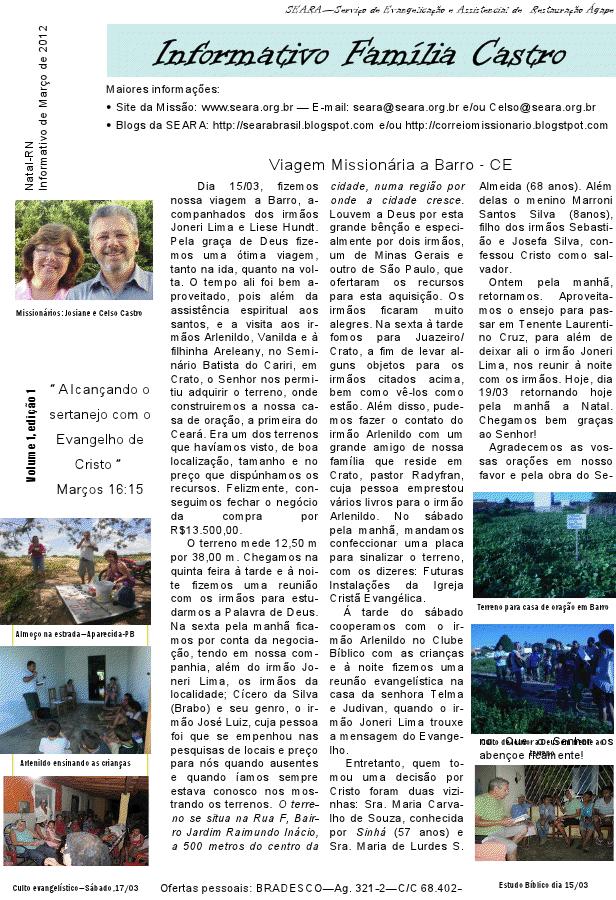 01/08 - NORDESTE DO BRASIL- Pr. Sidney Xaxá – CNM -Centro Nordestino de Missões Mundiais - JUVEP (Juventude Evangélica Paraibana)" - juvep@terra.com.br - 01/08 - Francisco/Valdete - missoes@missoesmundiais.net - "Meu nome é Francisco de Souza (49), sou Pastor há 23 anos, em 1991 Deus me deu um chamado especifico através de um sonho, a um local que eu não conhecia, no ano de 1995 Deus me fez saber que era no Nordeste do Brasil, deixei então minha vida secular de publicitário, atuando no SBT de Londrina - Paraná, e depois de vender tudo o que possuia, ganhei as passagens e segui com minha família (Missionária Valdete (41) minha esposa, e meus filhos Thiago(19), Igor (18) e Helom (12), para o Nordeste do Brasil, fui morar em um apartamento sem ter móveis, sem ser mantido por nenhuma Organização Missionária, apenas na fé em Jesus Cristo, fui chamado de maluco por alguns, mas Deus tinha e tem um propósito muito grande em minha vida com o Nordeste... "A paz do Senhor queridos irmãos! Para mim é uma benção divina estar recebendo suas (nossas) Notícias Missionárias, pois me servem de encorajamento. Vejo a verdade da Palavra do Senhor que nos exorta a continuarmos lutando, pois os mesmos sofrimentos estão se dando com os nossos irmãos espalhados por toda face da terra. É estranho, mas isso me dá força para não desistir e continuar a anunciar e a viver a mensagem do nosso amado Mestre. Quem sofreu mais que ele?... Obrigado, e que Deus abençoe e fortaleça todos vocês..." - Ivina Daciane de Sá Barreto Turczinski - UFC-Universidade Federal do Ceará _ Brasil - Queridos Jocumeiros e amigos, gostaríamos de vos informar sobre a escola internacional "Children In Need", "Crianças em Crises" que estará acontecendo pela primeira vez no Brasil e será em Fortaleza. Solicitamos aos líderes das Bases da JOCUM que por favor divulguem esta escola... Gratos pela vossa colaboração e atenção. Em Cristo_ Wagner & Vivienne S.Cruz -