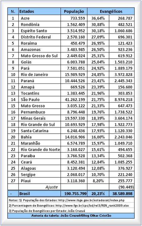 o Piauí é o último colocado com apenas 9,7% de evangélicos... UM BRASIL MOBILIZADO A ORAR A Campanha Mundial de Oração 2014 já começou a mobilizar as igrejas pelo Brasil a fora. O objetivo da coordenação nacional é alcançar todos os estados brasileiros com vários mobilizadores até que Deus nos dê pelo menos um mobilizador em cada um dos mais de cinco mil municípios do nosso país. O novo site da CMO já está no ar. Ele é a principal ferramenta de comunicação dessa rede de intercessores que cresce a cada ano. Pelo site WWW.cmo.org.br é possível encontrar notícias do que Deus está fazendo nas igrejas, programações locais, os contatos dos mobilizadores nos estados e todo o material de divulgação que pode ser copiado gratuitamente e reproduzido pelas igrejas. Veja agora como está o quadro de mobilizadores no Brasil por regiões: Sul Rio Grande do Sul – 3 Paraná – 4 Santa Catarina – 1 Norte Amapá – 2 Amazonas – 1 Pará – 2 Roraima -1 Tocantins – 1 Em Rondônia e no Acre ainda não temos mobilizadores inscritos no site Nordeste Bahia – 13 Ceará – 2 Maranhão – 5 Paraíba – 2 Pernambuco – 4 Piauí – 4 Rio Grande do Norte – 30 Em Sergipe e Alagoas ainda não temos mobilizadores Sudeste São Paulo – 32 Rio de Janeiro – 20 Espírito Santo – 4 Minas Gerais - 10 Centro-Oeste Goiás – 3 Mato Grosso – 3 Mato Grosso do Sul – 2 Distrito Federal - 25 A AMIDE – Associação Missionária para Difusão do Evangelho, coordenadora nacional da CMO, não tem qualquer preocupação com números ou estatísticas. Nosso objetivo é unicamente mobilizar a Igreja brasileira para a oração, o arrependimento e a busca de um avivamento genuíno em nossa nação, especialmente em um ano de eleições e eventos internacionais, como a Copa do Mundo. Que a noiva de Cristo possa se unir e fazer diferença no nosso país. No entanto, precisamos saber quem são os mobilizadores da CMO e onde eles estão para que possamos entrar em contato e ajudá-los na tarefa de contagiar as suas igrejas. Por isso, se você quiser se juntar a essa grande rede de intercessão, se inscreva no site www.cmo.org.br e incentive outros a fazerem isso também. Pelo nosso quadro de voluntários, estamos representados em praticamente todos os estados brasileiros, faltando apenas no Acre e Rondonia, da região norte e Alagoas e Sergipe, na região nordeste. Acreditamos que a CMO possa, inclusive, já ter chegado a esse locais, mas as pessoas não se inscreveram como mobilizadores. Glória a Deus se isso tiver acontecido! Nosso objetivo é realmente a unidade do corpo em oração. Mas, como não sabemos de fato, vamos intensificar a nossa mobilização nesses lociais. Se você conhece alguém, desfie a pessoa a se envolver na Campanha Mundial de Oração. Porque fazer parte da Campanha Mundial de Oração? Os relatos das igrejas e grupos de cristãos que abraçam a CMO a cada ano nos enchem de alegria. Não é pequeno e muito menos fácil o desafio de mobilizar um país como o Brasil a orar durante dez dias, 24 horas por dia, durante uma determinada época. Alguns chegam a dizer que oração tem que ser constante, nos 365 dias do ano. Concordamos plenamente! Mas, desde o ano 2000, quando a CMO foi lançada na Cidade do Cabo, na África do Sul, percebemos que há um mover sobrenatural de Deus nesse período. Afinal, imagine o mundo espiritual sendo “bombardeado” pela intercessão de centenas de milhares de cristãos ao redor do mundo, em mais de 200 países, que se unem com o mesmo propósito e os mesmos alvos de intercessão na mesma época do ano. Isso é tão grandioso que muitas vezes a nossa mente humana não consegue captar. Essa unidade da Igreja de Cristo ao redor do globo terrestre é um dos objetivos da CMO. Faça parte você também! Mobilize sua igreja. Em 2014 a Campanha Mundial de Oração será de 29 de maio a 8 de junho, Dia de Pentecostes http://bible.com/211/ecc.10.5-7.NTLH - Pr. Hermes Carvalho - Eu tenho visto neste mundo uma injustiça que é cometida pelos que governam: eles colocam pessoas tolas em altos cargos e deixam de lado pessoas de valor. Tenho visto escravos andando a cavalo e príncipes andando a pé como se fossem escravos. Eclesiastes 10:5-7 NTLH "Eu tenho visto neste mundo uma injustiça que é cometida pelos que governam: eles colocam pessoas tolas em altos cargos e deixam de lado pessoas de valor. Tenho visto escravos andando a cavalo e príncipes andando a pé como se fossem escravos". Eclesiastes 10:5-7. A Biblia nos fala de uma inversão de valores, onde a pessoa certa está colocada no lugar errado e o errado no lugar certo. Tudo quanto é valor moral, social e cívico não existe mais, não é propagado e nem ensinado. As forças policiais nada pode fazer para impor a ordem e zelar pela segurança e quem tem apoio e voz são os que promovem desordem e propagam a guerra. Os altos postos do governo não são dirigidos por pessoas de valor e que tem a formação principalmente moral para dirigi-lo. O que temos visto em nosso país hoje é exatamente o que diz esse texto bíblico. Pedimos a Deus que cuide de nossa nação e traga de volta os valores morais, éticos, sociais, cívicos e espirituais www.facebook.com/download/preview/460207694167061 - Sammis Reachers - Censo Demográfico IBGE 2010 - Características Gerais da População, Religião e Pessoas com Deficiência.. |