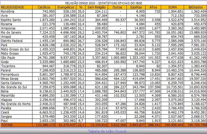 brasileira amostrada por estado e por religião no Censo de 2010 ...