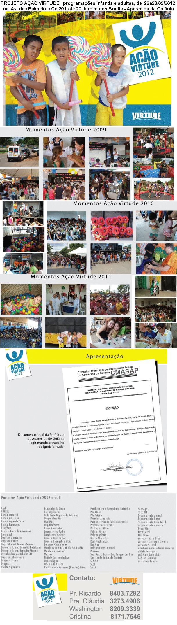 pregar, não com palavras, mas com gestos. Ele se chama AÇÃO VIRTUDE e está na sua quarta edição. O projeto não tem nenhuma finalidade lucrativa, é meramente filantrópico. As crianças ficam o dia todo no sábado e domingo, onde podem brincar, ouvir palestras (como a do SESI, por exemplo), ganham kits de higiene bucal, balas, cachorro-quentes, doces, sorvete, algodão-doce, pipoca, refrigerante, frutas, brinquedos... As famílias ganham cestas, plantas, corte de cabelo, aferição de glicose, aplicação de flúor e diversos outros. No domingo a programação se encerra com a minimaratona, que normalmente premia os primeiros com bicicletas, pendrives, celulares, vales-compra, etc... É extensivo à todas as idades, separados por categorias de sexo e idade. Usamos normalmente um caminhão-palco, mas nesse ano de política não sei se conseguiremos alguém que possa doar para o evento. Temos licenças dos órgãos competentes da Prefeitura de Aparecida, como SEMMA, AMMA, AMT, etc... bem como os devidos ofícios, se necessários. Segue