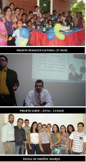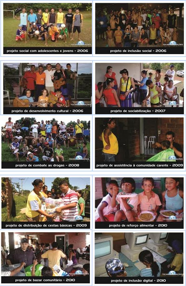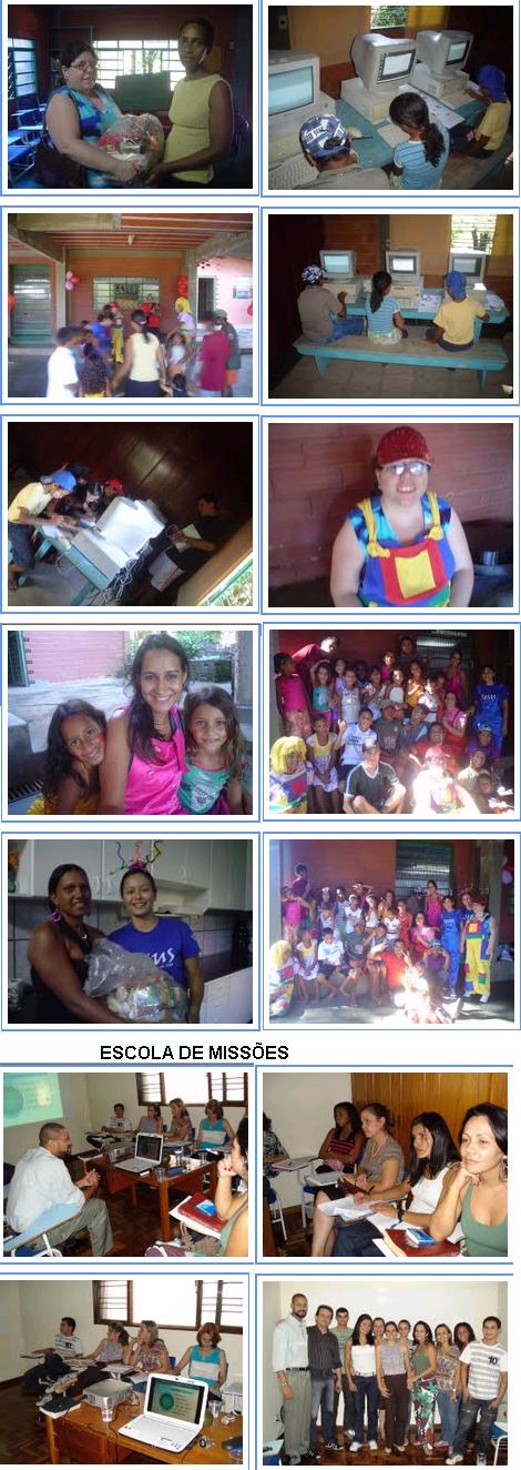 CARTA RELATÓRIO DA MISSÃO TOCANDO AS NAÇÕES Goiânia, 08 de Junho de 2010 A MISSÃO TOCANDO AS NAÇÕES (MTN) no mês de Maio do corrente ano realizou vários cultos de despertamento e conscientização missionária igrejas parceiras, a saber: IGREJA ASSEMBLÉIA DE DEUS CAMPO VILA NOVA (Bonfinópolis-Go), IGREJA CRISTO VIVE (Goiânia-Go), IGREJA EVANGÉLICA MISSIONÁRIA MARANATA (Goiânia- Assembléia de Deus (Bonfinópolis) Go) e IV IGREJA PRESBITERIANA RENOVADA (Goiânia-Go). A Missão Tocando as Nações por ser uma Instituição de caráter Interdenominacional sempre tem primado por fornecer ferramentas missiológicas para as diversas denominações evangélicas. Sendo assim, o conceito de Reino de Deus está sendo difundindo nas terras tupiniquins Igreja Cristo Vive (Goiânia) (brasileiras) de forma a destacar com relevância primordial a salvação dos perdidos, a missão integral e responsabilidade existencial do ser Igreja. A Missão Tocando as Nações por não ser um órgão departamental de uma denominação encontra facilidade de penetração nos diversos grupos da Igreja Maranata (Goiânia) cristandade evangelical. Contudo, por decorrência disto não tem mantenedores fixos, portanto, depende de ofertas voluntárias para a subsistência. Caso sua igreja ou você pessoalmente queira ser um parceiro e amigo desta obra basta depositar qualquer quantia na conta bancária da MTN – detalhamento no rodapé IV IPR (Goiânia) desta página. No mês de Julho a Missão Tocando as Nações estará realizando o 10° PROJETO MISSIONÁRIO DE FÉRIAS. Desta vez a cidade alvo é São João da Paraúna. Quem quiser participar basta entrar em contato conosco e fazer sua inscrição. Fortalecido pela cruz de Cristo, Pr. Vinicius O. S. Guimarães Presidente da Missão Tocando as Nações A proposta principal da ESCOLA DE MISSÕES é fornecer ferramentas para o fortalecimento e desenvolvimento de Igrejas Missionárias 03/09/2010 05/10/2010 Comunidade da Fé (2010) Buriti e Jardim América COMEMORAÇÃO AO DIA DA CRIANÇA [dia 16 de Outubro – sábado às 15 h – St. Buriti Sereno] A Missão Tocando as Nações desenvolve desde 2005 um projeto de desenvolvimento social, econômico e cultural junto às comunidades carentes próximas do St. Buriti Sereno (cidade de Aparecida de Goiânia – Go). Portanto, esta “Comemoração ao Dia da Criança” faz parte de uma iniciativa continuada e intencional dentro do planejamento assistencial. Caso tenha interesse venha participar conosco deste evento, entre em contato e saiba como ajudar. Conheça mais sobre nossos projetos, veja fotos e vídeos em nosso site Dia das Crianças = = = Na ocasião estiveram reunidos os líderes das Instituições: ASAS DE SOCORRO, JOCUM, SAL DA TERRA, MISSÃO TOCANDO AS NAÇÕES, ASSOCIAÇÃO BENEFICIENTE DE ASSISTÊNCIA AO EGRESSO, ORGANIZAÇÃO CRISTÃ DE APOIO AO PEÃO, SEMINÁRIO EVANGÉLICO DE TEOLOGIA DA AMÉRICA LATINA = = = http://setal.org.br recebemos a visita do Wilson Costa , Secretário Executivo da Fraternidade Teológica Latino Americana - Setor Brasil [ http://ftl.org.br ], com esta iniciativa estamos aproximando o Seminário Evangélico de Teologia da América Latina das discussões teológicas em terras tupiniquins e do contexto eclesiástico latino americano Pr. Vinicius _ (62) 3941-0884