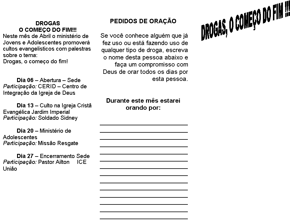 atração principal na festa da romaria em trindade! A Romaria de Trindade - Goiás acontece na primeira semana de julho. São mais de 500 mil romeiros que vêm de várias cidades e estados para a festa do Divino Pai Eterno. Nesta ano a romaria vai ser diferente. Os romeiros não vão apenas participar das missas, mas terão a oportunidade de conhecer a verdadeira história de Jesus. Junto à organização do evento estaremos utilizando 17 telões durante a romaria para projetar o filme Jesus. As projeções serão realizadas antes e após as missas, inclusive dentro do Santuário Novo. Estamos mobilizando mais de 350 voluntários para este trabalho de evangelização pessoal e para a distribuição de fitas de vídeo. Que tal participar conosco deste evento? Maiores informações me envie um e-mail ou pelo telefone 062-2517461 - falar com Luis Valter _ Diretor do Projeto Filme Jesus na Região Centro-Oeste. O ministério filme Jesus é um ministério da Cruzada Estudantil e Profissional para Cristo. Igreja Cristã