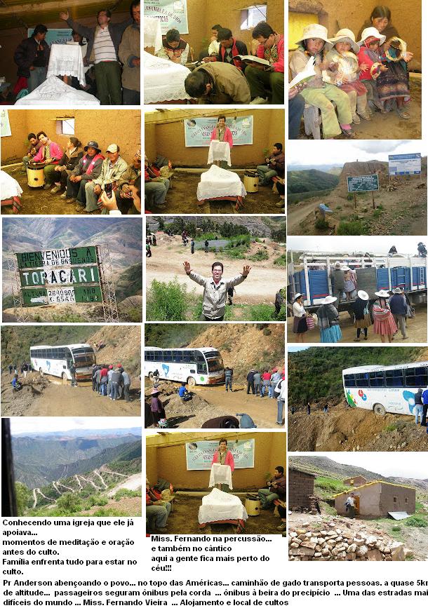 Que bom poder contar com as suas orações! Inclua minha agenda em sua rotina de oração e se possível interceda por minha saúde, deslocamentos e oportunidades de servir! Como você pode perceber serão dias intensos e eu creio que o Senhor vai nos abençoar. Nossos irmãos na Bolívia serão capacitados e a igreja do Senhor nos lugares onde ministrarei será fortalecida. Pr. Jadai Silva de Souza Valdenice Matos Marciano _ 30/11/2011 _ Peço orações pelo meu filho também que mora em COCHABAMBA-BOLIVIA....está a mais de um més em antibioticos e so piorando a cada dia...injeções e tal....foi para hospital hoje e precisamos de orações também amados...sabe pais distantes...add meu skype....valdenicemarciano . www.luzdomundo.net Querido Intercessor, O Pr Anderson e o Miss Fernando Vieira começaram 2012 com o desafio de subir à Cordilheira dos Andes, onde foram conhecer um ministério que já vem sendo apoiado pela Missão Internacional Luz do Mundo. Após alguns dias de adaptação à altitude em Cochabamba, Bolívia, partiram para uma autêntica epopéia através de povoados que se localizam nas regiões mais altas das Américas. Perigos na estrada íngreme, meios de transporte defasados em todos os sentidos, riscos a todo momento não foram barreiras para que esses dois servos de Deus chegassem ao destino. Toda a força das palavras é pouco para descrever o que esses dois missionários enfrentaram. Nem mesmo na África as adversidades foram tão penosas como nesta viagem à parte mais alta do território boliviano. Mas, valeu a pena conhecer esses servos de Deus que estão atuando ali, onde nós não podemos estar. Eles estão pregando o evangelho, anunciando que breve Jesus voltará. Anderson 23/02/2012 Fotos : Conhecendo uma igreja que ele já apoiava... momentos de meditação e oração antes do culto. Família enfrenta tudo para estar no culto. Miss. Fernando na percussão... e também no cântico aqui a gente fica mais perto do céu!!! Pr Anderson abençoando o povo... no topo das Américas. caminhão de gado transporta pessoas. a quase 5km de altitude... passageiros seguram ônibus pela corda ônibus à beira do precipício Uma das estradas mais difíceis do mundo Miss. Fernando Vieira Alojamento e local de cultos . " BUENO ES TRABAJAR CUANDO DIOS ESTÁ TRABAJANDO"
