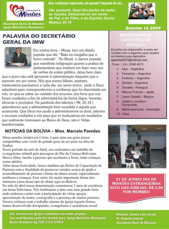 e Lucia _ Bracesco - Ag 2511-9 - Poupança 1009941-2( Última Mensagem : 10/11/2007) 12/04/07 _ Paz do Senhor amados irmaos, cooperadores , intercessores e mantenedores da obra missionária. Estamos indo para o segundo mês aqui na Bolivia e Glorificamos ao Senhor Jesus por tudo que tem feito, Estamos animados e realizando o projeto para crianças em Charcas Florida. Temos crianças de 5 até 13 anos que não tem muito escolha e oportunidades de estudos e crescimento, trabalham como pastores de ovelhas e cabritos, passando assim a maior parte do tempo com esse trabalho no campo ajudando suas famílias. Temos no momento 21 crianças em nossa casa todas sexta-feiras, onde elas podem apartir dessa semana escutar a Biblía em seu próprio idioma (Quechua). Acabamos de ser abençoados com um material de audio. São fitas em casete Antigo e Novo Testamento, a Sociedade da Biblia Boliviana tem este Projeto A Fé vem pelo Ouvir e ouvir a Palavra de Deus. Temos agora esse desafio fazer com que o povoado ouça a palavra de Deus 30min. por semana.Vamos começar no domingo. Contamos com seu apoio em oraçao e financeiro pelo povo quechua de Charcas Florida- Potosí. Temos dificuldade de Evangelizar os idosos, porque muitos são quase surdos, temos que falar muito alto. PEDIDO DE ORAÇÃO: Estratégia para conquistar a confiança destes idosos. Como as pessoas tem se reunido em casa, para os cultos, precisamos de uma televisão e um Data Ysplei, para poder passar filmes, e alcançar o maior número de pessoas. PEDIDO DE ORAÇÃO: O custo deste Data Ysplei é de $ 600,00 Deus nos deu uma estratégia, para conquistar os adolescentes e os jovens, através do Esportes. Poderemos ir nas escolas dos povoados vizinhos. PEDIDO DE ORAÇÃO: Material apropriado, Bolas, Redes e Uniformes. Deus colocou em nosso lado, uma irmã abençoada, Chamada Helena, para ser a nossa intérprete em Espanhol. PEDIDO DE ORAÇÃO: Para que seus pais, entendam o chamado ministerial de Helena, pois eles, tem dificuldado o trabalho. PEDIDO DE ORAÇÃO: Precisamos de Bíblias e Hinários. A Bíblia em Espanhol custa R$ 20,00 e em Quechua R$ 30,00 e o Hinário R$ 10,00. Um abraço n´Aquele nos faz ficar de pé. Acreditamos em sua intercessão... Abraços Herberh e Lucia