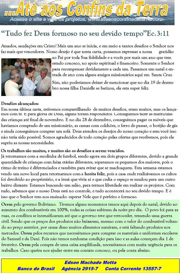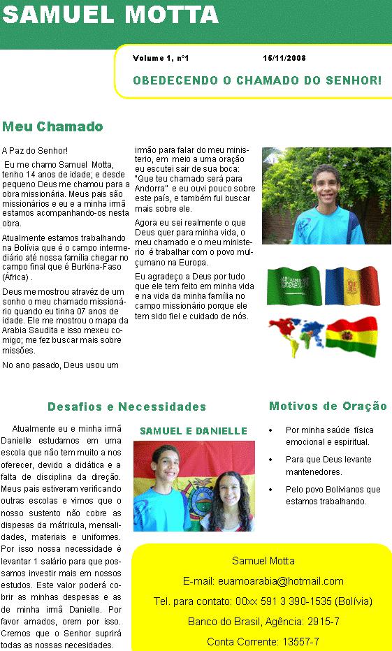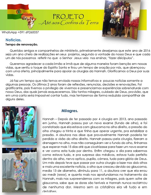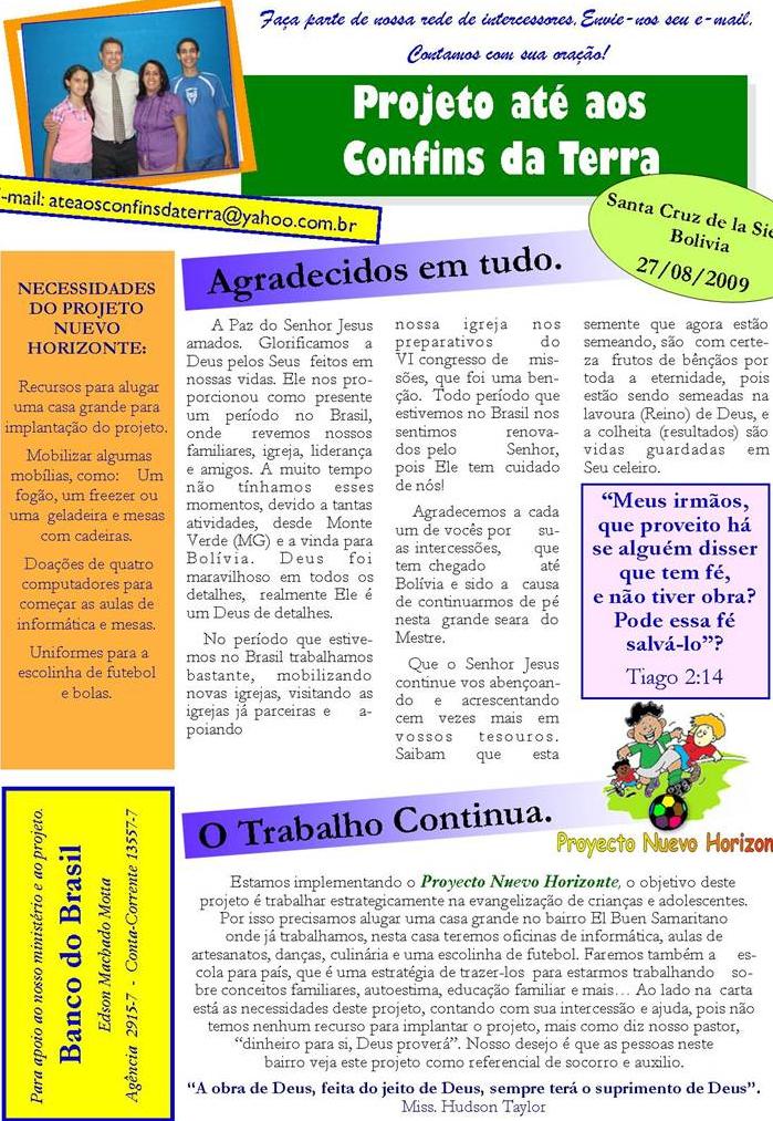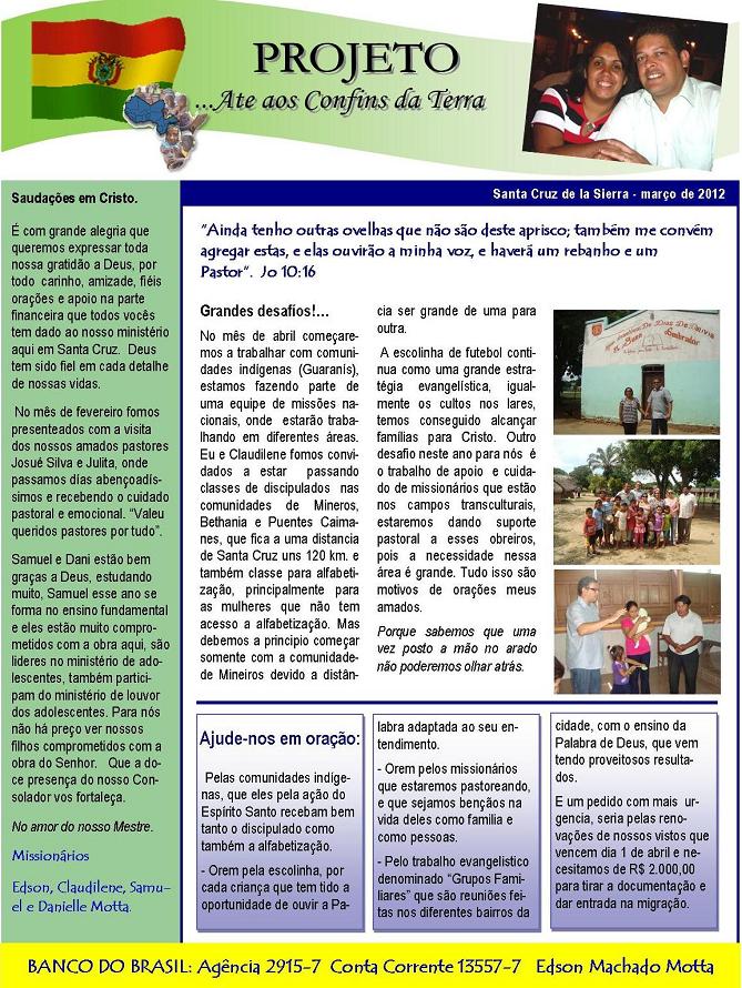 vezes, que todos o ouçam pelo menos uma vez! Informe do mês de Julho - 2006 - Santa Cruz - Bolivia Romanos 15:20, 21 Deus falou comigo este mês muito forte sobre este texto. Na verdade é o texto que Deus me chamou para o campo transcultural, e a agora vem reforçar o que ele já me falou há um tempo atrás. Que possamos, mesmo dentro do nosso contexto (Brasil, América do sul, etc) nos esforçar em pregar para as pessoas que não conhecem Jesus, ou que pelo menos dizem conhecer, mas que na verdade não tiveram um encontro real com Jesus. Que Deus nos ajude a pregar para estas pessoas. Peço perdão por não ter mandado antes este informe, pela demora, sempre mando no inicio do mês, tive muitos trabalhos devido ao meu retorno para o Brasil e não tive tempo de escrever. Este informe é o ultimo da Bolivia, de Santa Cruz. Como informei no informe passado, fui aprovado para um projeto para Itália, tive que voltar para o Brasil, cheguei à minha cidade Cascavel - PR dia 10 deste mês, com a Graça de Deus. Dia 17 deste mês já preciso estar em Campinas - SP, para definições finais do meu projeto, saberei mais detalhes desta nova fase de missões. Quero dizer que não estou abandonando o campo missionário, mas sim saindo de um, para entrar em outro, e passarei um tempo no Brasil, um tempo de agora ate maio do próximo ano, terei que aprender o Inglês e o Italiano, levantar o meu sustento para 2 anos de trabalho missionário na Itália e fazer alguns trabalhos com igrejas, do Nazareno e outras denominações, e tambem com a minha igreja em Cascavel. Creio ser um tempo que Deus reservou de uma forma especial, estou vendo Deus trabalhar de uma maneira incrível. Peço oração pelas viagens que terei que fazer agora dentro do Brasil, para os trabalhos de evangelismo que irei fazer e tambem para levantar o sustento, com as Igrejas do Nazareno que já conhecem o projeto que se chama Isaias e Calebe. O termino do meu trabalho na bolivia foi bom. Como estava ajudando a igreja do nazareno Filadelfia, a Igreja continua, estávamos fazendo uma célula de evangelismo na casa de uma irmã, fechamos por que o rapaz desta casa que iria ficar esta indo para outra cidade de Bolivia, então resolvermos fechá-la, pelo menos por enquanto. O trabalho no bairro Evo Morales, esta continuando, com as outras missionárias, duas brasileiras e uma boliviana, o estudo bíblico que eu estava fazendo esta a cargo da missionária da Missão Horizontes, por favor, continuem a orar por este trabalho porque Deus esta fazendo grandes coisas. Este mês foi muito trabalhoso, porque veio uma guria do Brasil para ajudar no projeto, ficou uns 15 dias, ela doou suas férias para missões, então eu ia com ela para fazermos visitas e evangelismo no bairro, porque ela não conhece o espanhol, ela tem um bom trabalho com crianças e como la temos varias, alcançamos estas crianças de uma forma dinâmica. Também no trabalho com a Igreja do Nazareno Sinai, a irmã que esta a cargo da igreja e que eu estava ajudando ira continuar o trabalho, este mês foi ótimo porque alcançamos outro bairro que fica perto deste e não tem nenhuma igreja implantada, nem católica. Chama 3 de Janeiro. Fizemos um domingo a tarde uma comida típica deste lugar, e convidamos as pessoas do bairro, e Deus trabalhou de uma forma linda, porque justamente na hora que fui evangelizar as pessoas do lugar, estavam em reunião de bairro, fazem muito isto aqui, e pude falar com as pessoas nesta reunião e eles ficaram felizes e pediram para fazermos reunião naquele lugar. Falei com a irmã que esta em cargo da igreja e ela disse que podia fazer a reunião neste lugar, varias pessoas vieram para conhecer a igreja, onde fizemos à comida típica e compartimos da Palavra de Deus, no próximo domingo fomos pela manha fazer culto na casa de uma pessoa que cedeu o seu lar para fazermos a reunião, gloria a Deus, duas famílias já se converteram, uma pessoa voltou pra Jesus. Agora esta sendo realizado culto em dois lugares, no domingo pela manha neste bairro e a noite onde esta a Igreja construída. O trabalho com meninos de rua tambem esta continuando, estava ajudando a Jocum neste trabalho, gloria a Deus eles estão continuando este trabalho tão necessitado, este mês trabalhamos com meninos e meninas de rua e tambem com prostitutas, todos cheiram cola, alguns são menores de idade e outros não. Dentro destes 2 últimos meses foram levados mais meninos para orfanatos do que dentro dos últimos 6 meses, gloria a Deus, estes últimos meses Deus trabalhou de uma forma especial com eles e conosco tambem, assim me falou o líder deste projeto chamado Larry, continuem a orar por este projeto, Deus esta salvando varias pessoas, e algumas prostitutas tambem estão querendo se reabilitar, das drogas e desta vida tão sofrida, que não gostam. Irmãos por favor, orem pelo trabalho na Bolivia, a necessidade de missionários é muito grande. Da igreja do nazareno eu era o único missionário em toda a Bolivia, tem muitos lugares a serem alcançados e a serem fortalecidos. Em resumo do trabalho que desenvolvemos na Bolivia, foi de muito proveito para mim. Deus me edificou muito, conheci muitas culturas diferentes, e Deus me ensinou a respeitá-las e compreendê-las para que possamos alcançá-las. Creio que foi de muito proveito para o povo da Bolivia tambem, para as Igrejas do Nazareno tambem. Apaixonei-me mais ainda por Missões transculturais, aconselho e indico para que se possível, todo Cristão possa ir para outro país, nem que for só alguns dias ou 1 mês fazer um trabalho de missões assim, doe suas férias pra Jesus, faça algo, vá, conheça, pregue, comparta, Deus se revelara a ti de uma forma diferente depois de uma experiência transcultural, vá, mas vá com a mente aberta para conhecer e respeitar outra cultura, diferente da sua. Sei que estarei indo de um lugar para outro totalmente diferente agora, tanto economicamente, culturalmente e espiritua