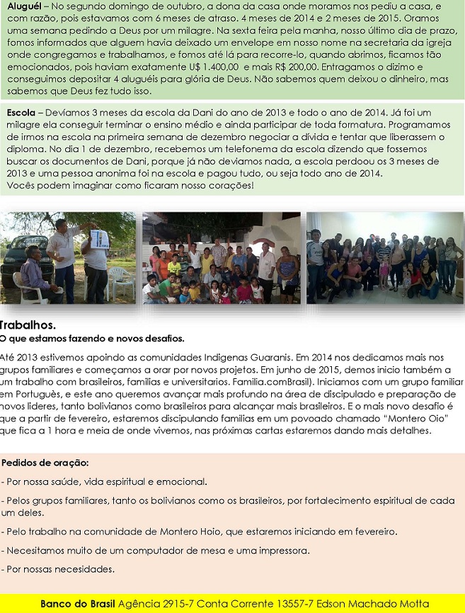 = Amados irmãos Mário e Nely, Graça e paz, Tenho orado muito, e acredito que o Senhor dará a vitória... Notícias do Júnior... por ele ter recuperado bem, e a válvula ter funcionado para desinchar o cérebro, os médicos marcaram para amanhã uma nova cirurgia, agora para a retirada do tumor e coágulos... continue orando... ontem, estive com a mãe do Júnior... ela está confiante e quando falo para ela de sua cooperação, inclusive na preocupação de perguntar dele, ela enche os olhos de lágrimas e diz: GRAÇAS A DEUS... Ela age assim porque não se sente só... e ela sabe que pode contar com a igreja (a esposa do Cordeiro), não a denominação, mas a verdadeira igreja, aquela que será arrebatada... obrigado, amada irmã, por ser tão útil na vida dessa família e na vida da nossa equipe. E falando em equipe, mais um mês se inicia e com ele seus desafios... preciso que esteja orando: a) Novamente não entrou nada para a Tereza... e ainda não falei isso para ela... b) Entrou R$ 100 para a Elvira... o marido da Elvira está no Haiti (ele é do Exército), e ele não dá mais notícias a 4 meses e o exército boliviano não nos diz nada. c) Amanhã vence o meu aluguel (arghhhh)... e o que entrou para nós não dá para pagar o aluguel e comer, então preferimos comer...rs... d) Hoje, conversei 50 minutos com a missão, e eles estão criando vários mecanismos políticos que estão dificultando a ajuda... ore, para que Deus quebrante nossa liderança... pois por estarem nesta guerra de liderança (estadual, nacional e Missão Transcultural), estão cortando as ajudas que vinham da denominação, priorizando o trabalho nacional... depois de 18 anos, estamos vendo que as coisas não mudam, então, estamos trabalhando exclusivamente com fé que o Eterno é bom e suas misericórdias durarão para sempre em nossas vidas... e) A Neli saiu com o jipe para socorrer uma criança da igreja, que a mãe ligou urgente por ela estar convulsionando, e na esquina da casa da irmã, um carro cheio de homens dentro, bateu na traseira do nosso carro... e fugiu... e a Neli pro estar sozinha, num lugar escuro, ficou com medo de ir atrás para ver a placa, então, amanhã estarei levando ele no funileiro... porém, GRAÇAS A DEUS pelo livramento de minha bebezinha. Sabe, amados, eu louvo a Deus por poder estar repartindo nossas cargas com vocês... ontem fizemos algumas visitas para pessoas problemáticas... e descobrimos o Silvestre, que é esquizofrênico... também o Marcelo, com Sídrome de Pânico, entre outros com problemas espirituais que têm seus reflexos no emocional e mental... caramba, ontem foi muito complicado, mas graças a Deus porque o Senhor está nos ajudando... Estamos com um projeto com crianças excepcionais que estamos em fase de oração também... não podemos nos limitar por causa da falta de recursos... Bem, esses são os motivos para que ore por nós, tá? Obrigado por poder contar com sua ajuda sempre... Paz, meus amados... Pr_Ibrain = = = Nome: Ibrain Ali Halabi Banco Bradesco Agência 188 Conta Poupança: 1006584 - 4 Em anexo envio quatro fotos que tirei: Numa aparecem: ele com um boné da Marinha que lhe dei, sua esposa que também se chama Neli, e eu. Noutra uma placa em espanhol com os serviços médicos prestados. Na seguinte um consultório médico; Na última uma enfermaria com dois bolivianos, um deles com ferros na perna. Desejando a Paz do Senhor, vosso irmão em Cristo Mario 02. ) Centro Médico Bethesda www.boliviaparacristo.rg3.net03. ) MISSIONARIOS _ RICHARD E RAIMUNDA PARA
