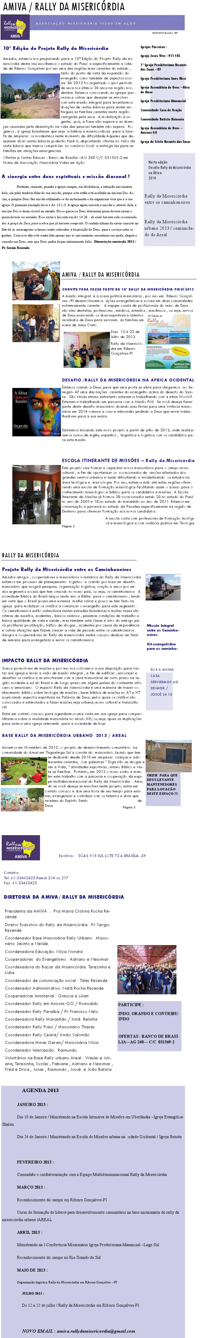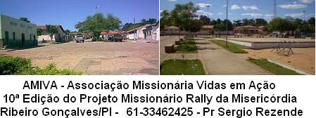 GONÇALVES Graça e paz ! Amados pastores e líderes do conselho de missões, gostaria de agradecê-los (as) pelas orações, apoio, ofertas financeiras e a sua amizade incasável com o nosso ministério, pois, contamos com a graça de Deus e com a sua dedicação. Somos profundamente agradecidos e reconhecemos o esforço que todos (as) vocês deram e tem dado para o avanço missionário no Brasil e neste ano na região de Desterro-PB. Deus abençoe ! Amados pastores e Líderes do conselho de Missões é, com temor e tremor diante de Deus e com consciência da responsabilidade missionária, que venho solicitar um pequeno espaço do seu domingo durante o culto para prestar um breve relatório acerca das grandes coisas que Deus fez e está fazendo na cidade de Desterro no estado da Paraíba e nos povoados de Tataira e Pedra Atravessada ambas visitadas e amparadas pelo evangelho de Cristo, onde de forma prática se manifestou o amor de Deus. Queridos, o que estamos buscando é um pequeno espaço no seu culto para explanar alguns testemunhos edificantes sobre ação de Deus em famílias que hoje estão glorificando a Deus e se alegrando com o Senhor Jesus Cristo sendo agora, Rei e Senhor de suas vidas. Amados, este momento com a igreja , entendemos que será de encorajamento, de edificação e de desafios para o que Deus deseja fazer nestas comunidades através de sua igreja em Brasília. Estaremos apresentando um video ( Resumo das atividades evangelísticas , sociais e plantação de igreja em Tataira -PB para a glória de Deus ). Gostariamos, se possível incentivar a igreja para o próximo projeto Rally da Misericórdia em 2013 para o estado do Piauí no período de 13 a 20 de Julho na ciadade de Ribeiro Gonçalves-PI, aonde existem vários interiores, ou seja, zona rural sem presença evangélica e igrejas plantadas. Por isso, amados seguimos juntos , pois, juntos somos mais fortes e glorificamos ao Pai , que ordena a sua benção ( Salmo 133). Estou a sua disposição para agendarmos a nossa visita. Pr Sergio Rezende e a família Rally da Misericórdia AMIVA-Associação Missionária Vidas em Ação.